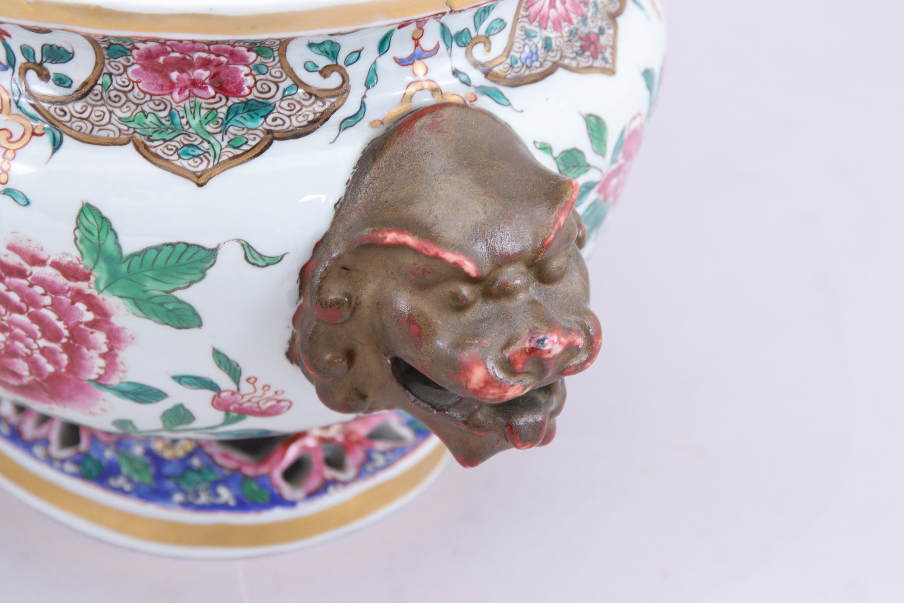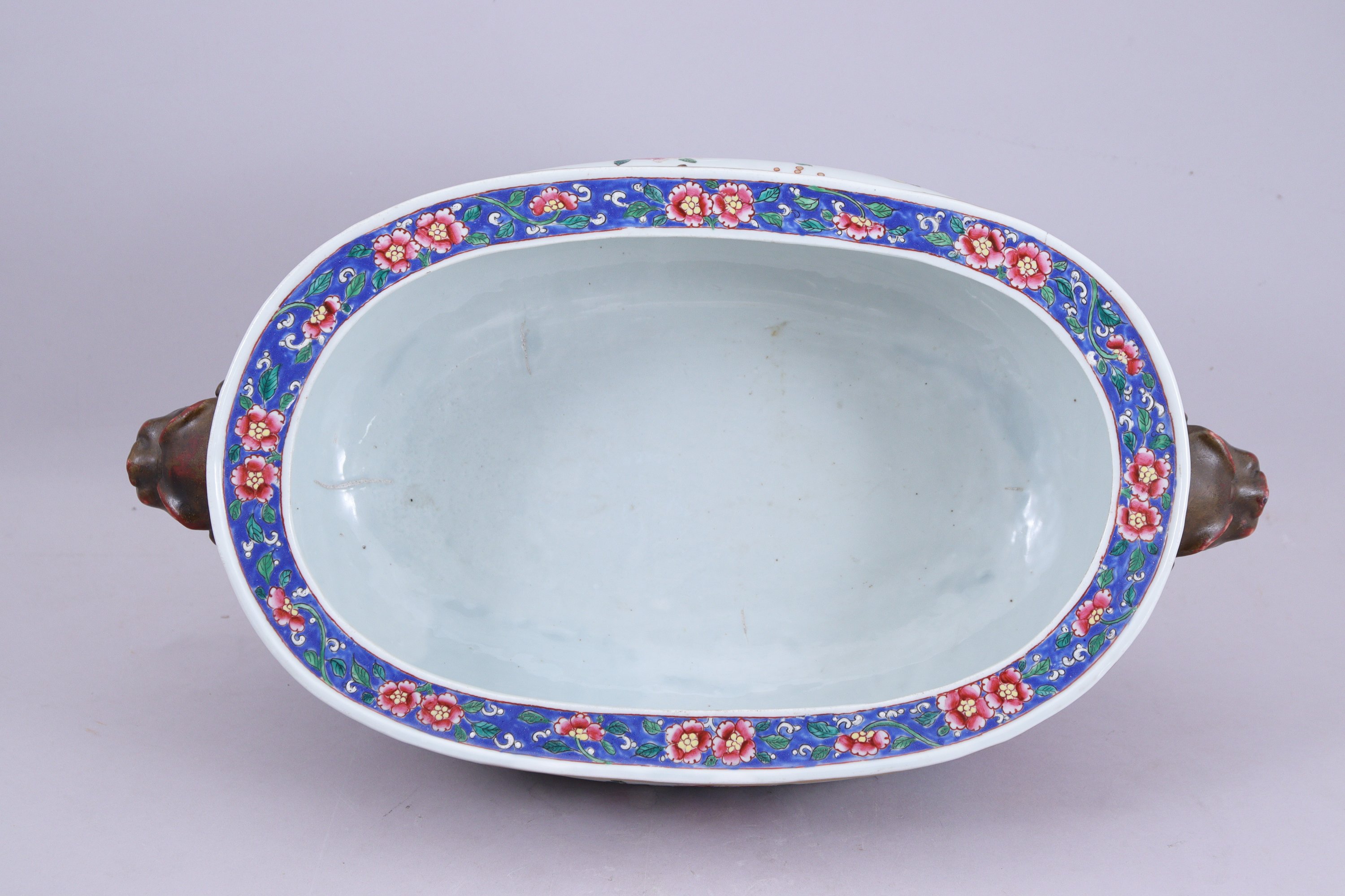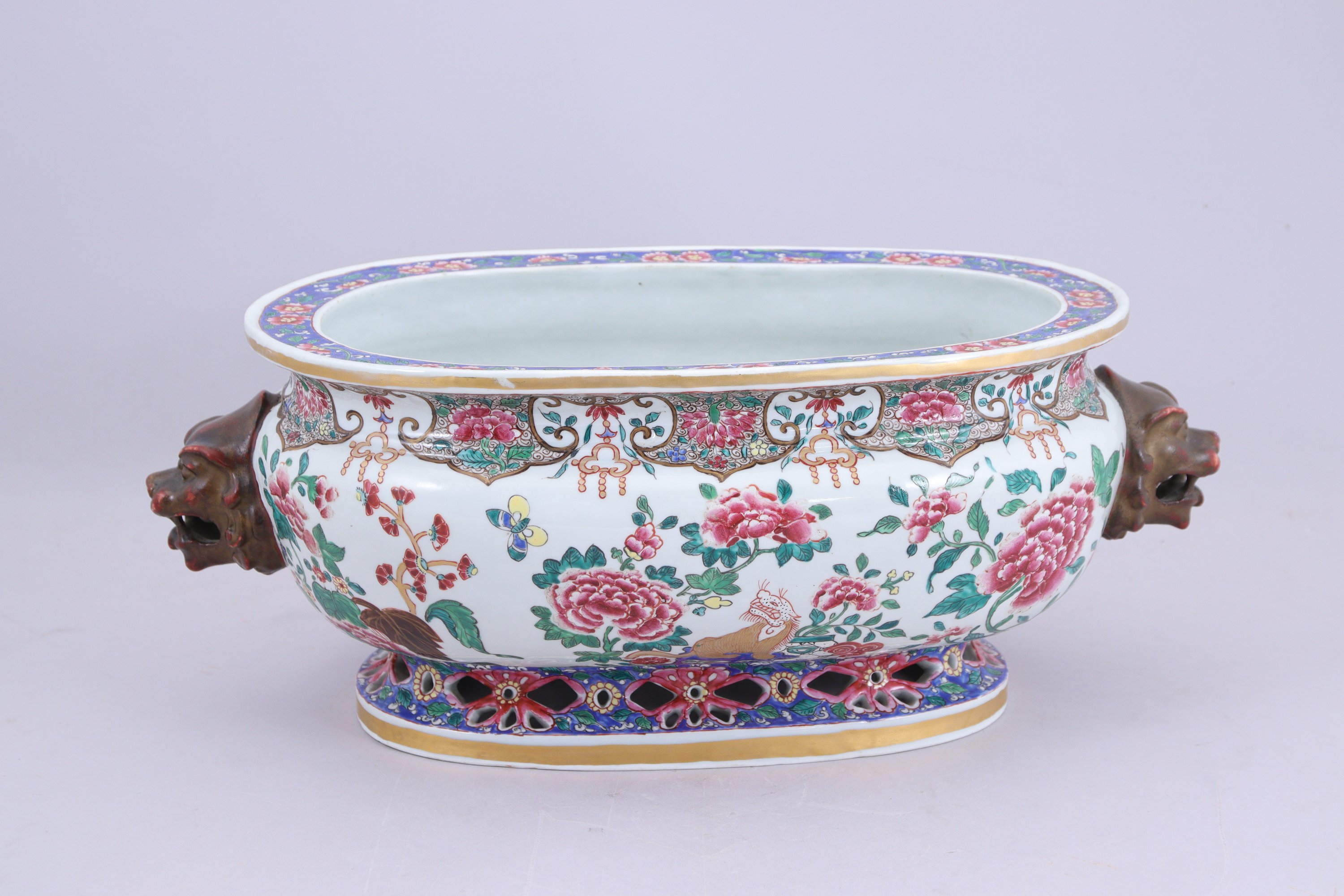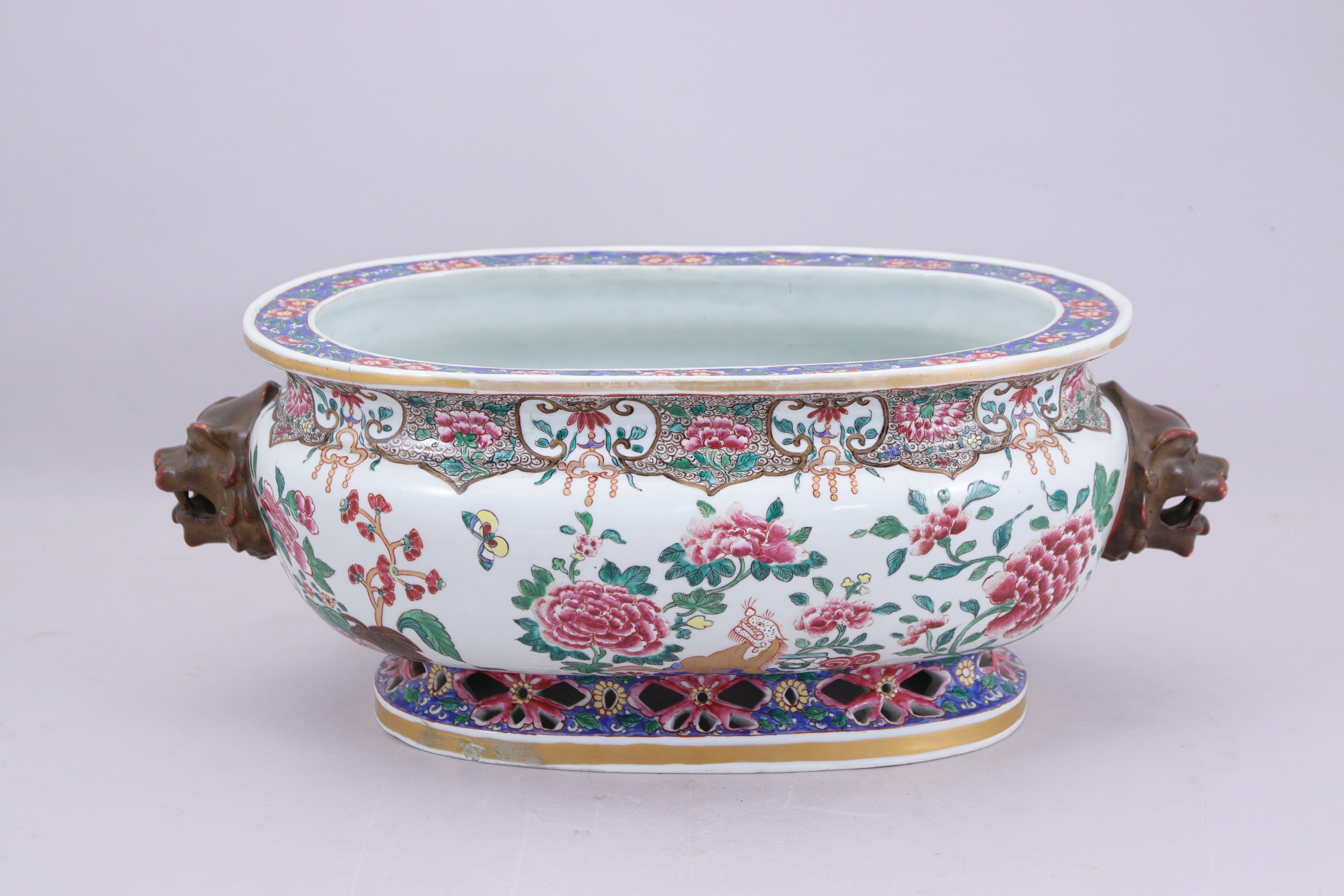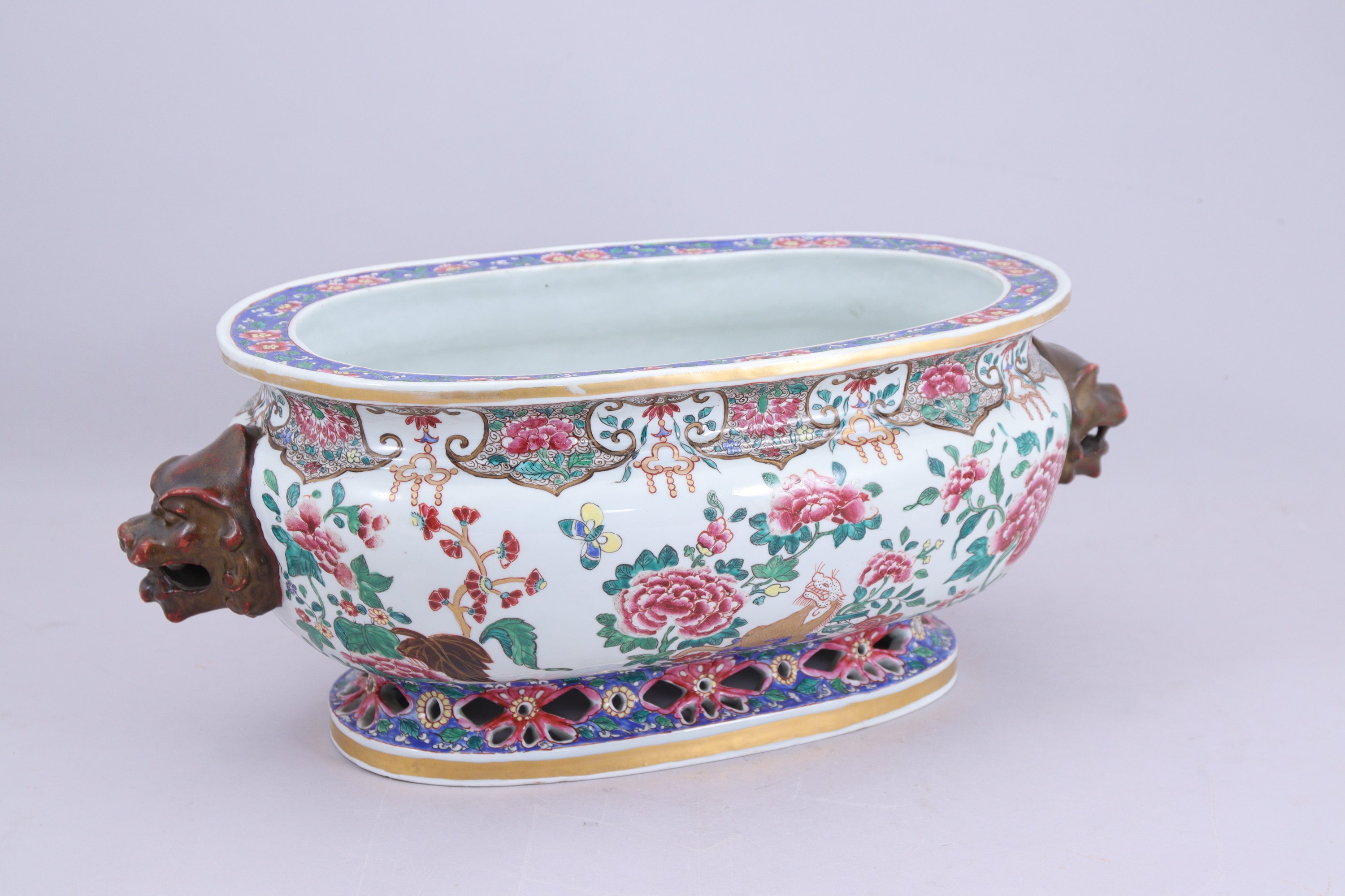 en porcelaine polychrome et dorée de forme oblongue à décor de pivoines fleuries et têtes de dragon. Deux prises en forme de chien de phô. Le pied ajouré sur fond bleu orné de chrysanthèmes.