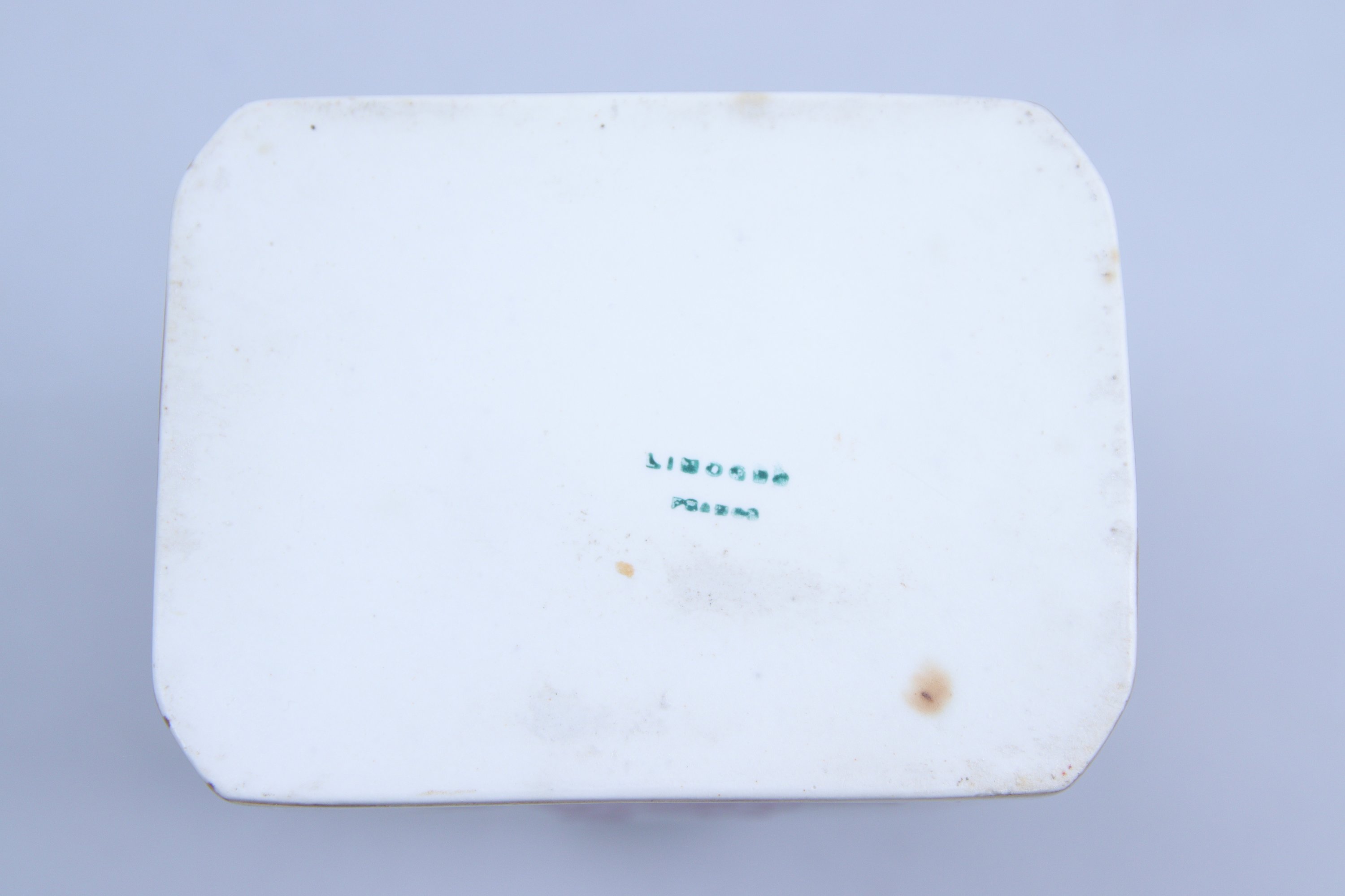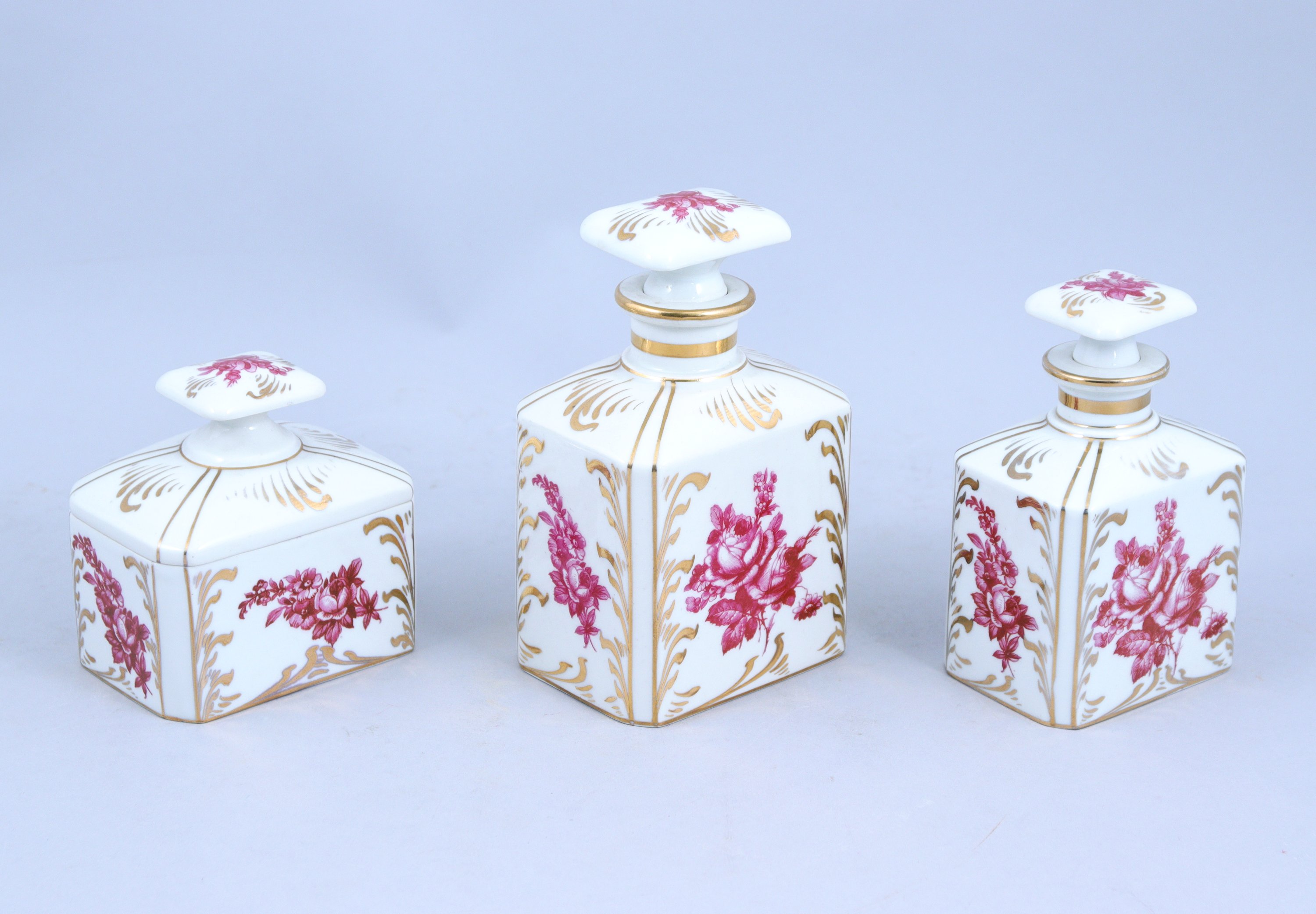 en porcelaine blanche, de forme rectangulaire à pans coupés, décorés de roses peintes à la main et rehaussés de liserés et de motifs végétaux d’or. Les flacons sont couverts d’un bouchon de section rectangulaire. Marque « Limoges France ».