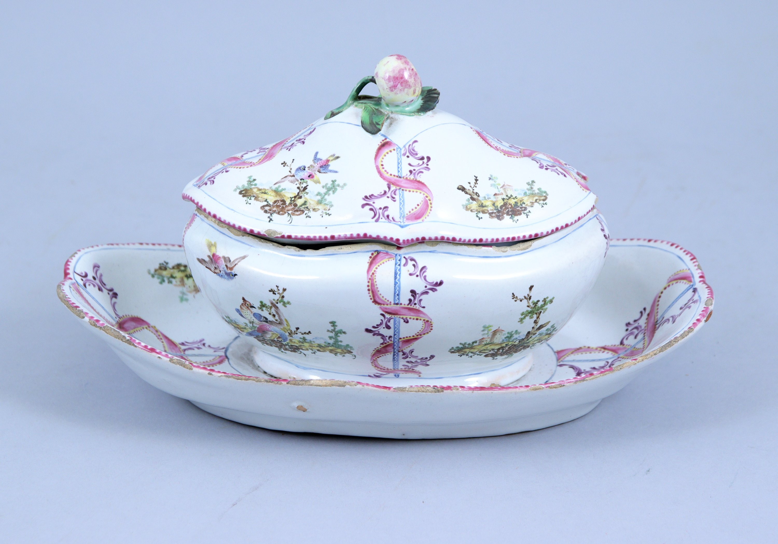 en faïence. La prise du couvercle en forme de fruit sur une terrasse de feuille surmontant un décor aux couples d'oiseaux et paysages dans un entourage de rubans entrelacés.
