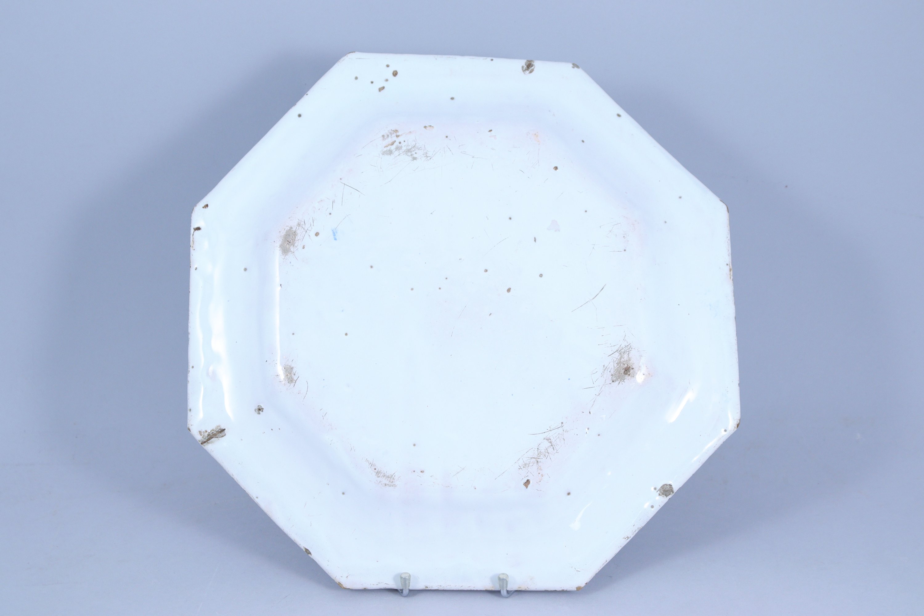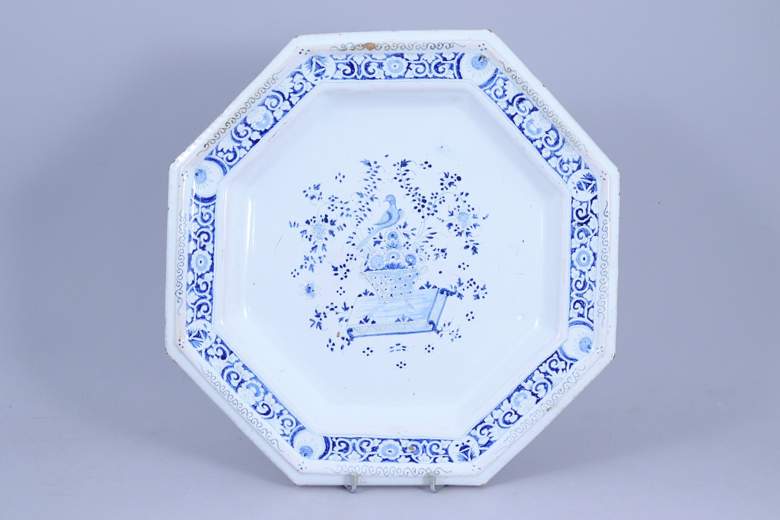 en faïence décorée en camaïeu bleu d'un vase fleuri surmonté d'un volatille sur un entablement au centre. L'aile est ornée de fleurs et de lambrequins stylisés.