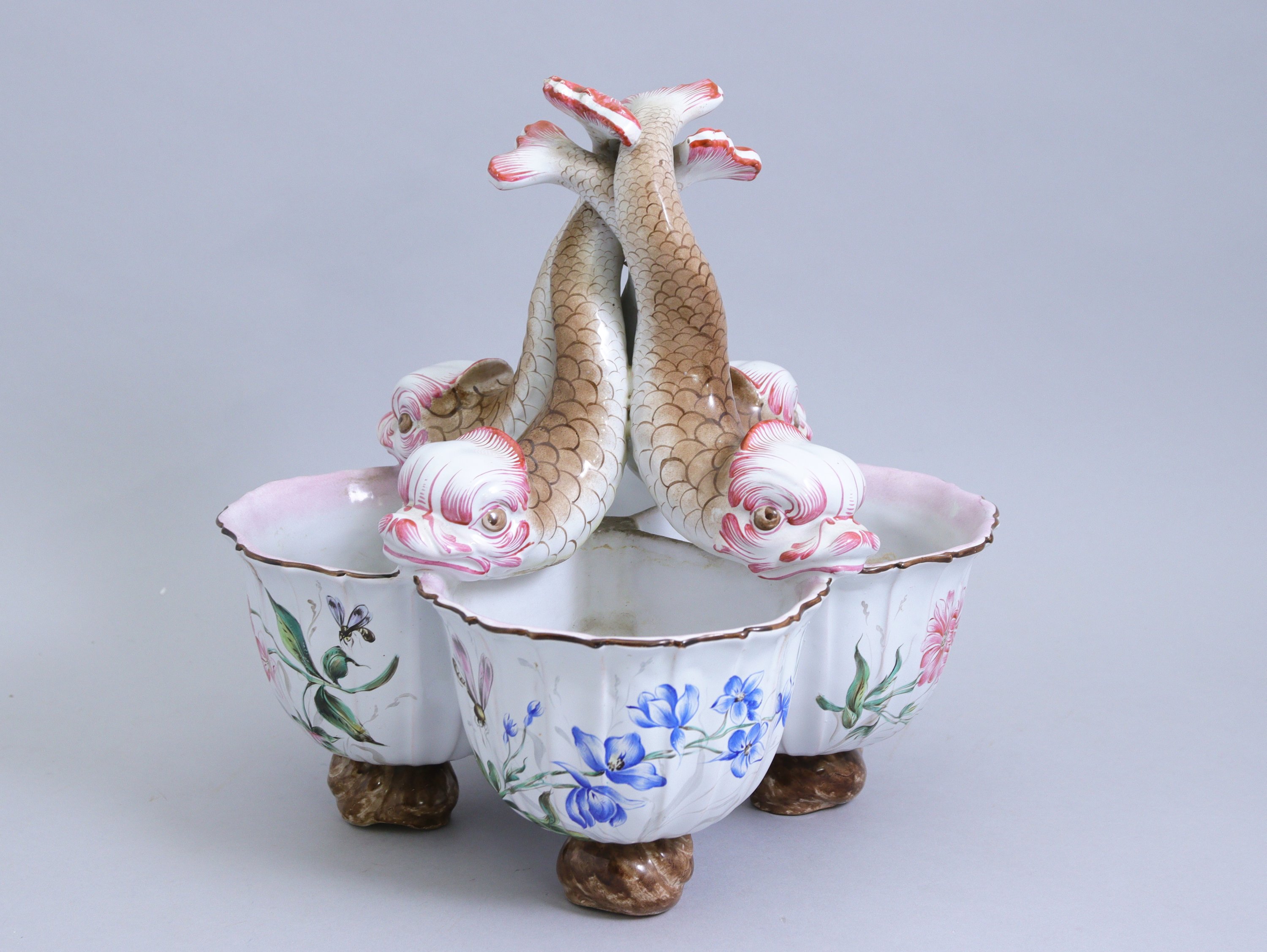 en faïence polychrome à décor de fleurs, insectes et dauphins entrelacés.