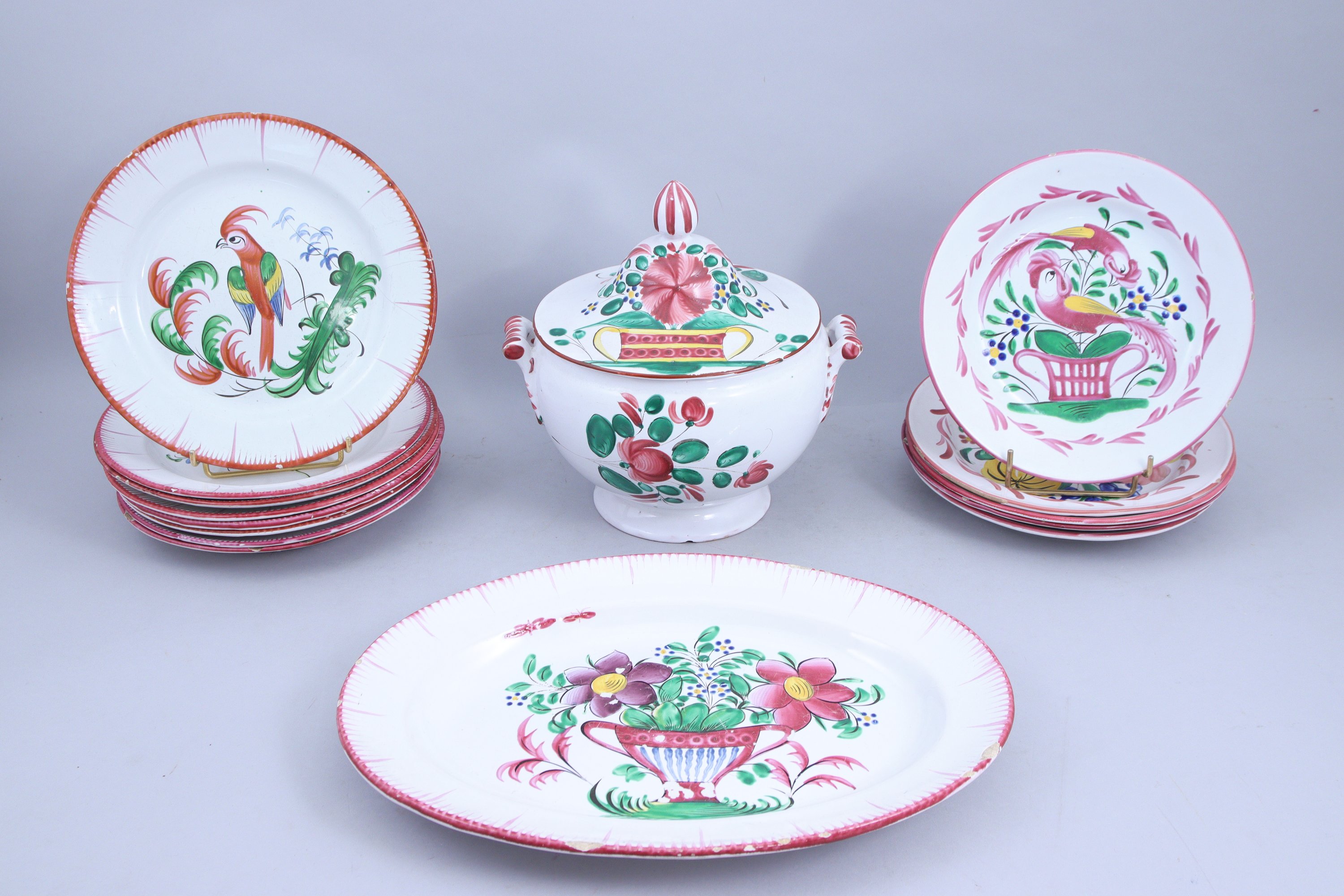 en faïence, provenant de plusieurs services différents aux décors polychromes d’oiseaux exotiques et de fleurs diverses, comprenant treize assiettes, deux plats de services, un plat ovale, deux grands bouillons couverts et une soupière.