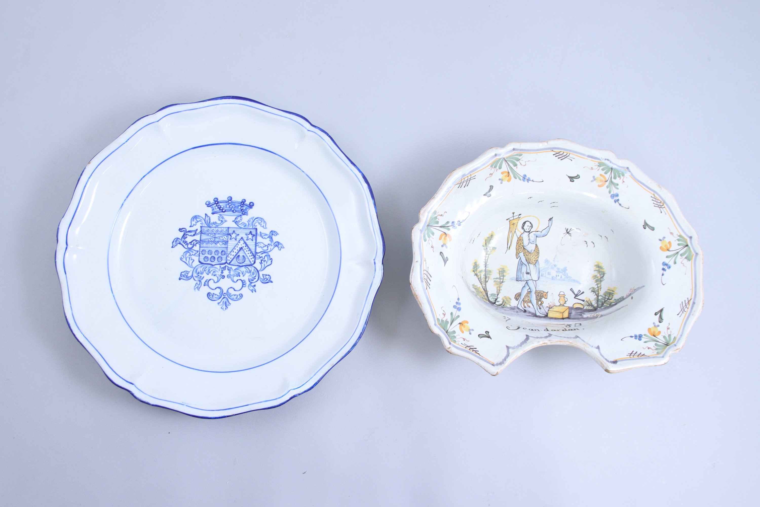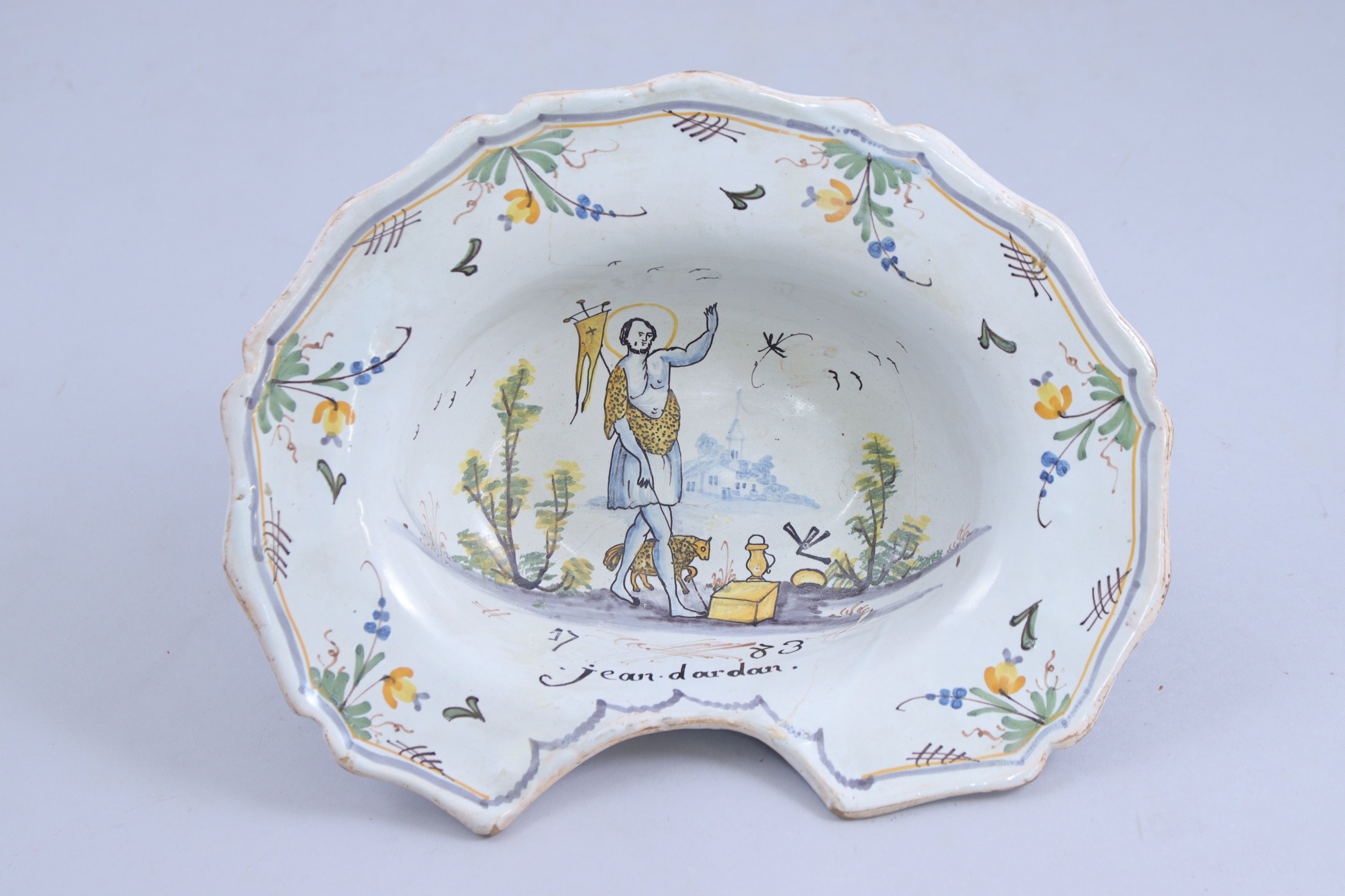 - Nevers, plat à barbe chantourné en faïence polychrome, à décor floral et représentant saint Jean-Baptiste (?). Signé "Jean Dardan et daté 1783". Haut. 29 cm Larg. 23 cm. (accidents et fêle)