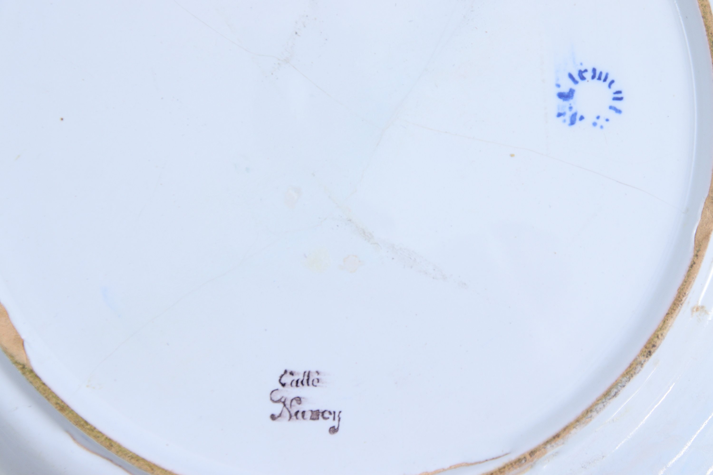 - Émile Gallé (1846-1904) et Manufacture de Saint-Clément. Plat circulaire en faïence à bord chantourné cerné d'un liseré. Au centre, un décor héraldique dans un entourage de rinceaux. Marqué Saint-Clément et Gallé Nancy. Diam. 31,5 cm.