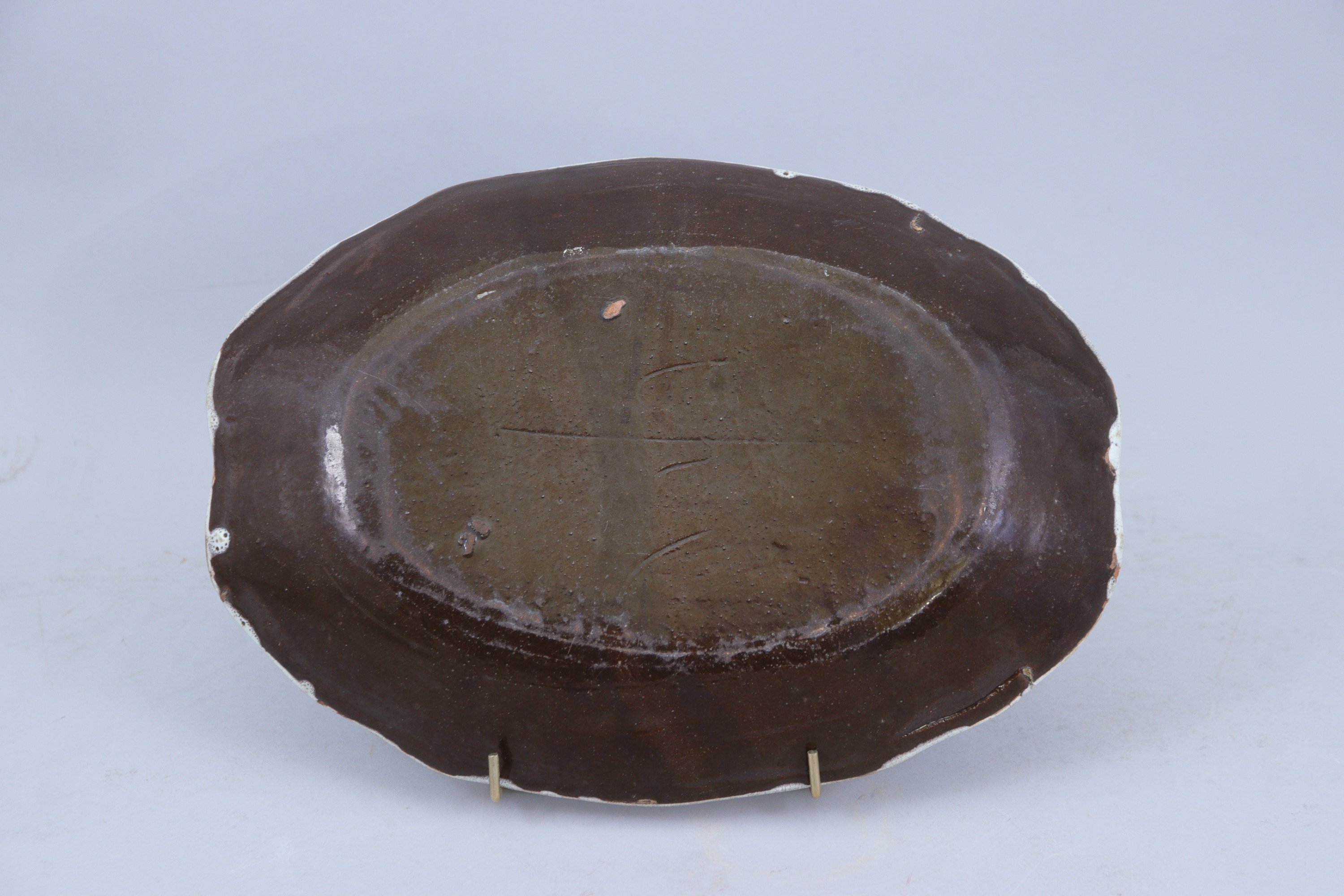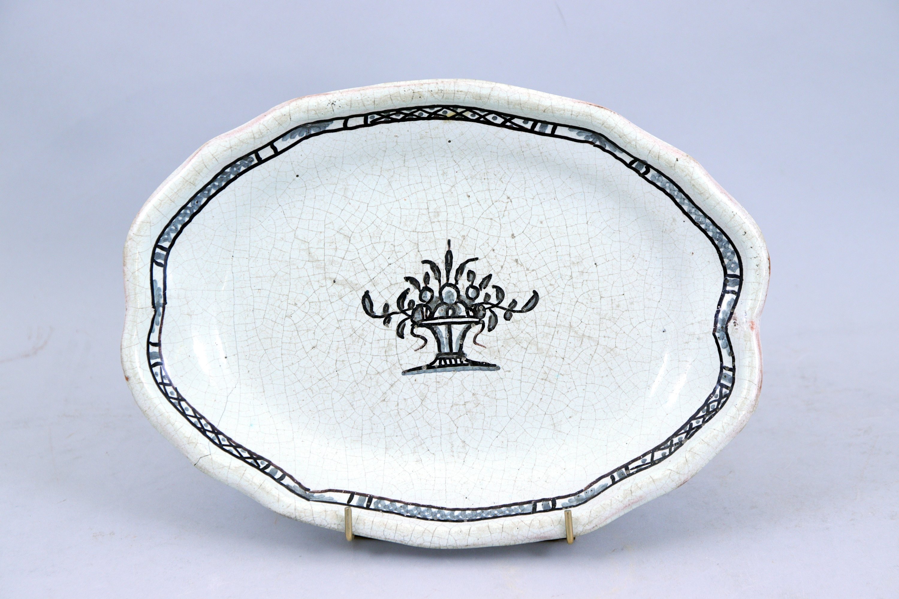 en faïence craquelée, de forme ovale mouvementée, au décor dune coupe de fruits et dune frise aux motifs géométriques.