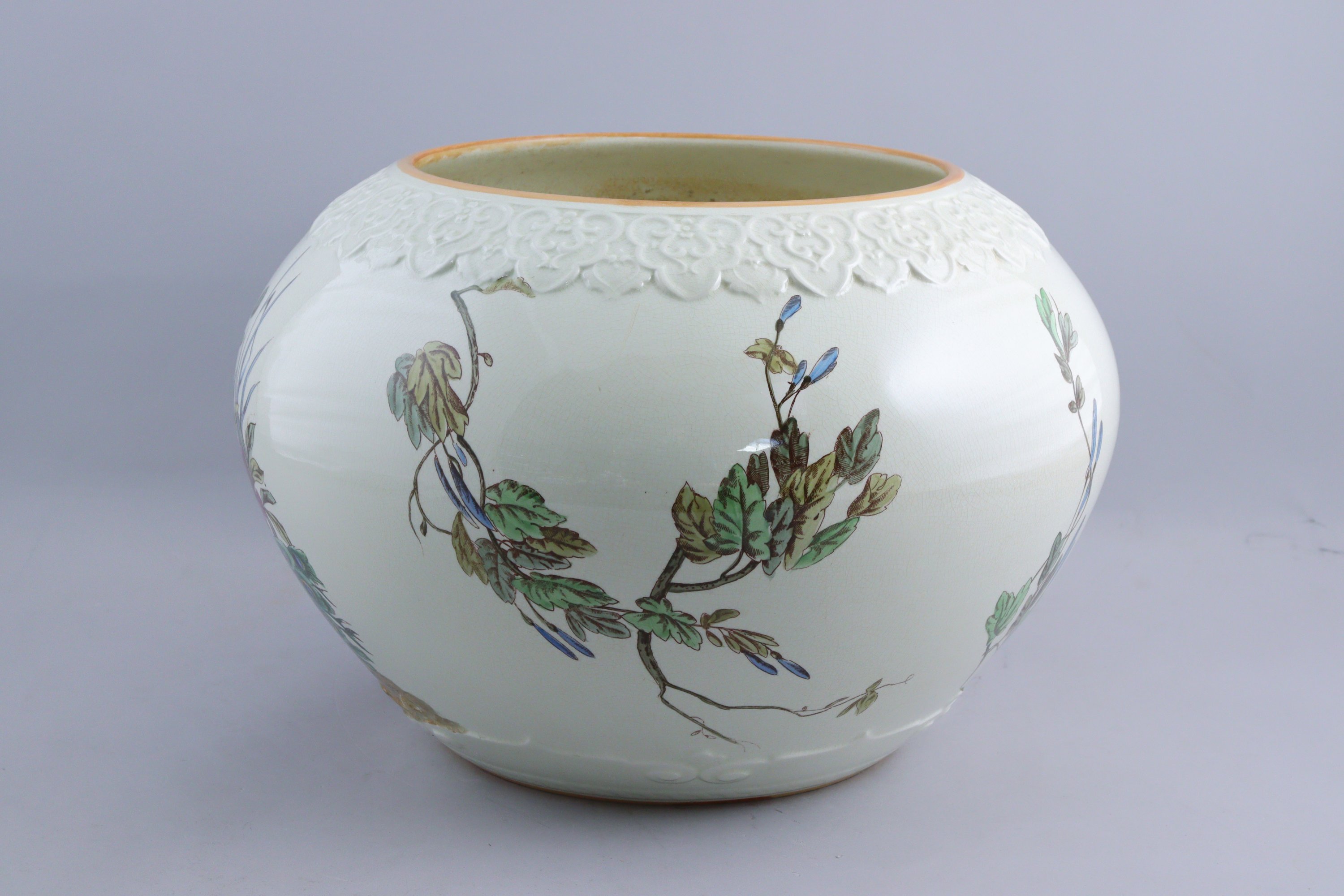 en faïence, à fond blanc craquelé à décor émaillé figurant un paon dans un entourage de feuillage et fleurs. La lèvre à décor en relief d'une frise.