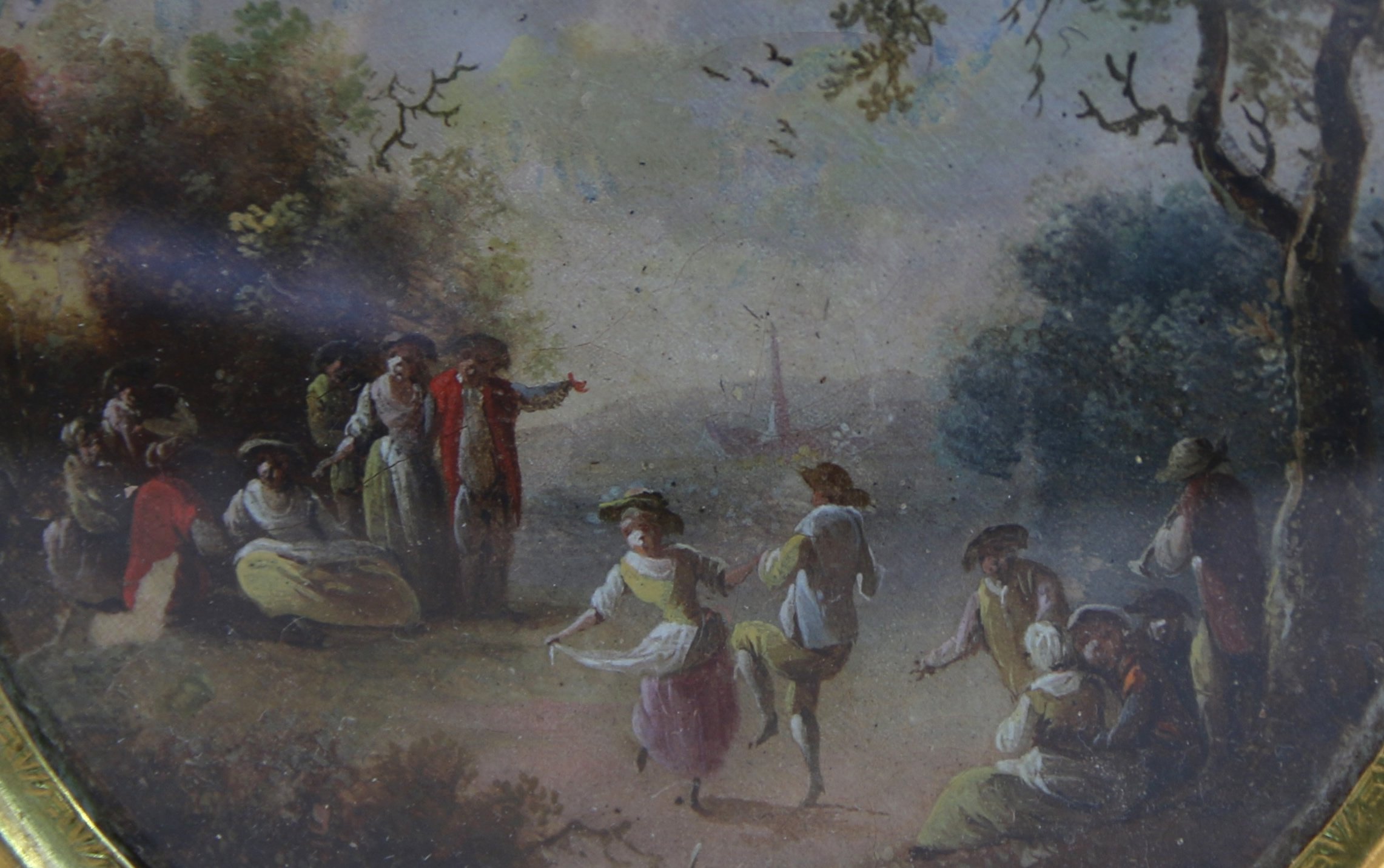 École du XVIIIe siècle Fête champêtreMiniature. Diam. 5,5 cm. (restaurations)