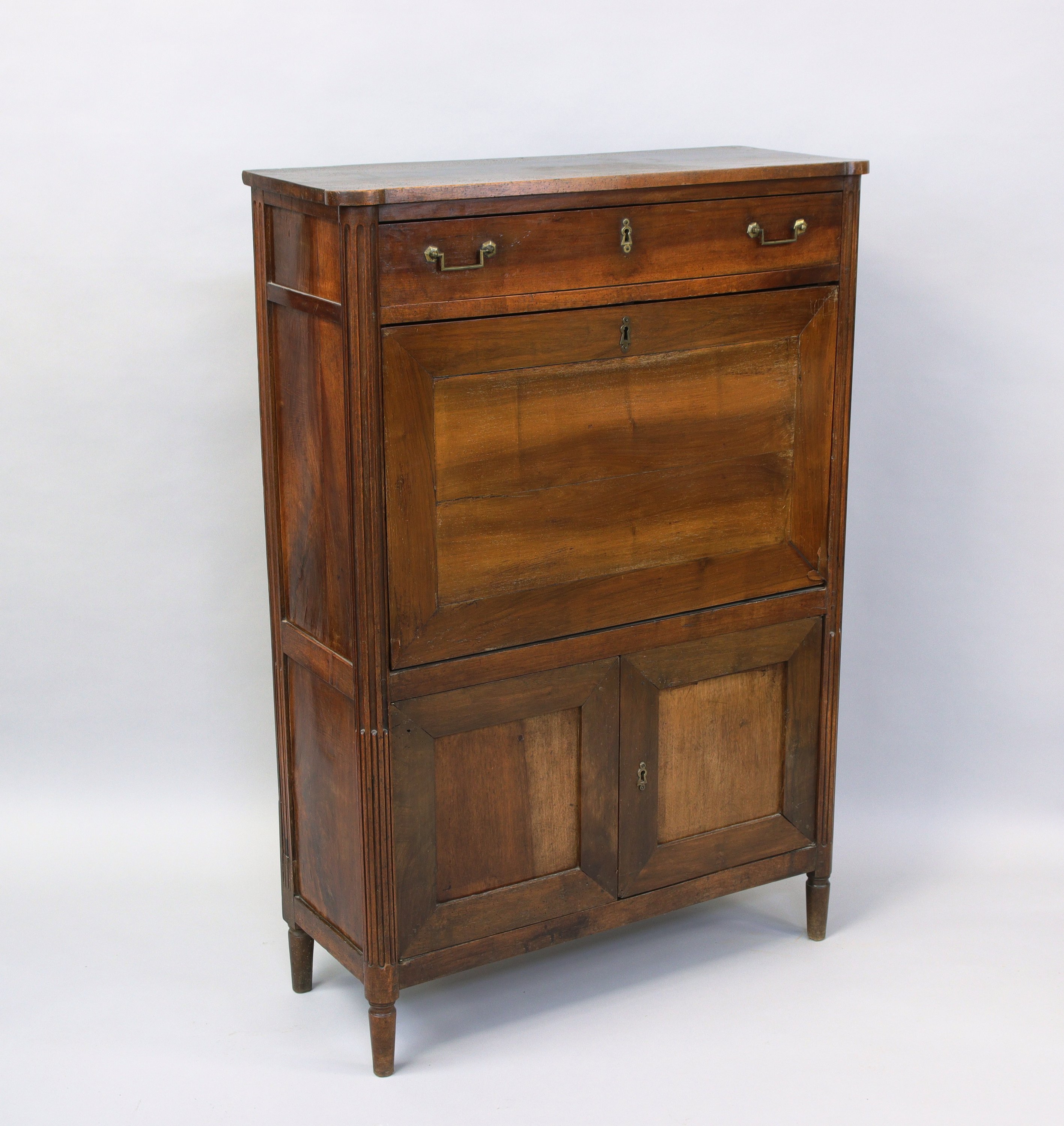 en bois teint. Un premier tiroir dans la partie haute du meuble s'ouvre par deux poignées en laiton. L'abattant, foncé d'un maroquin, découvre des tiroirs, une étagère. La partie basse du secrétaire s'ouvre par deux ventaux présentant à l'intérieur deux étagères et un tiroir fermant à clef. Le piétement est à pieds droits.