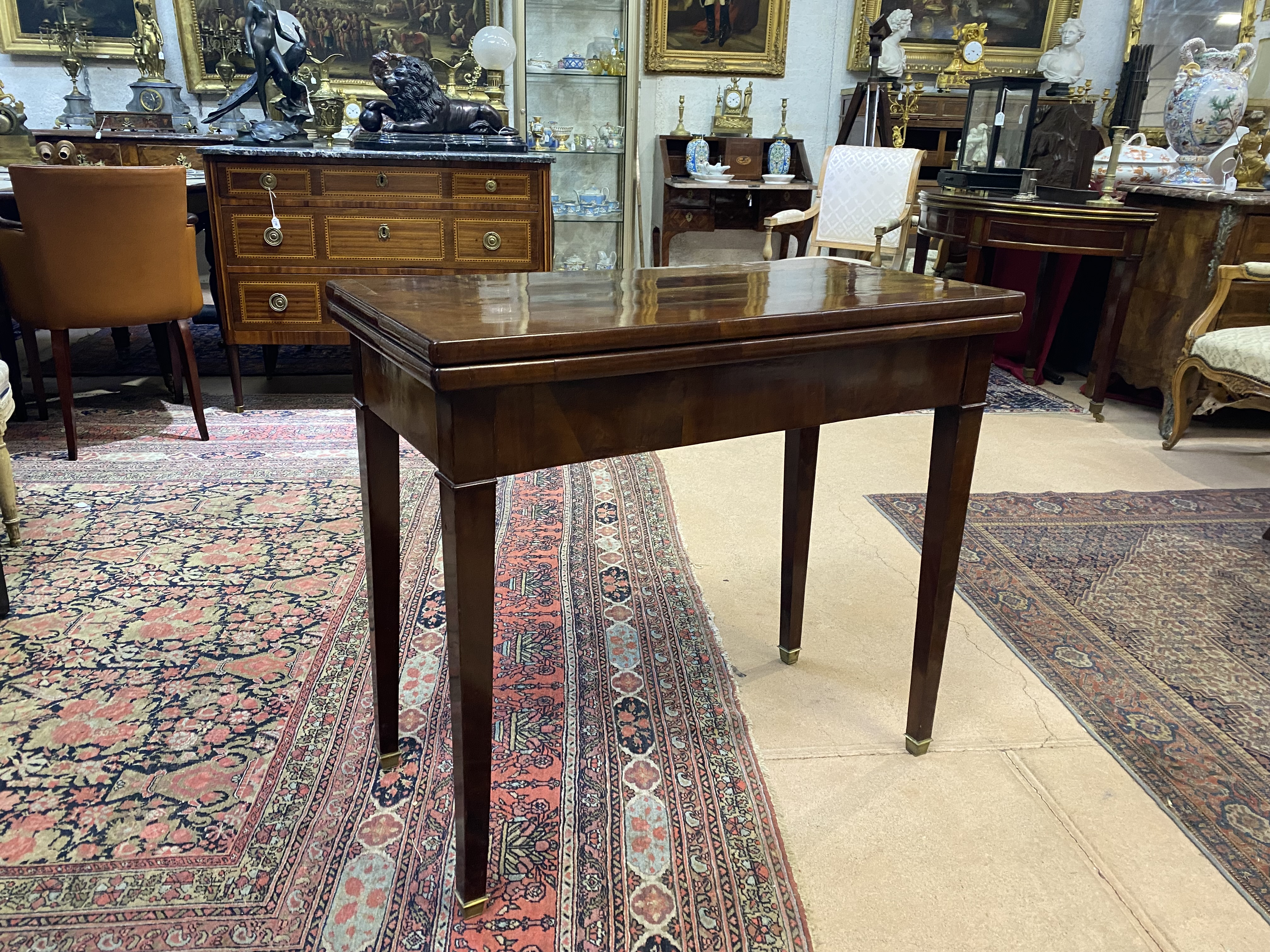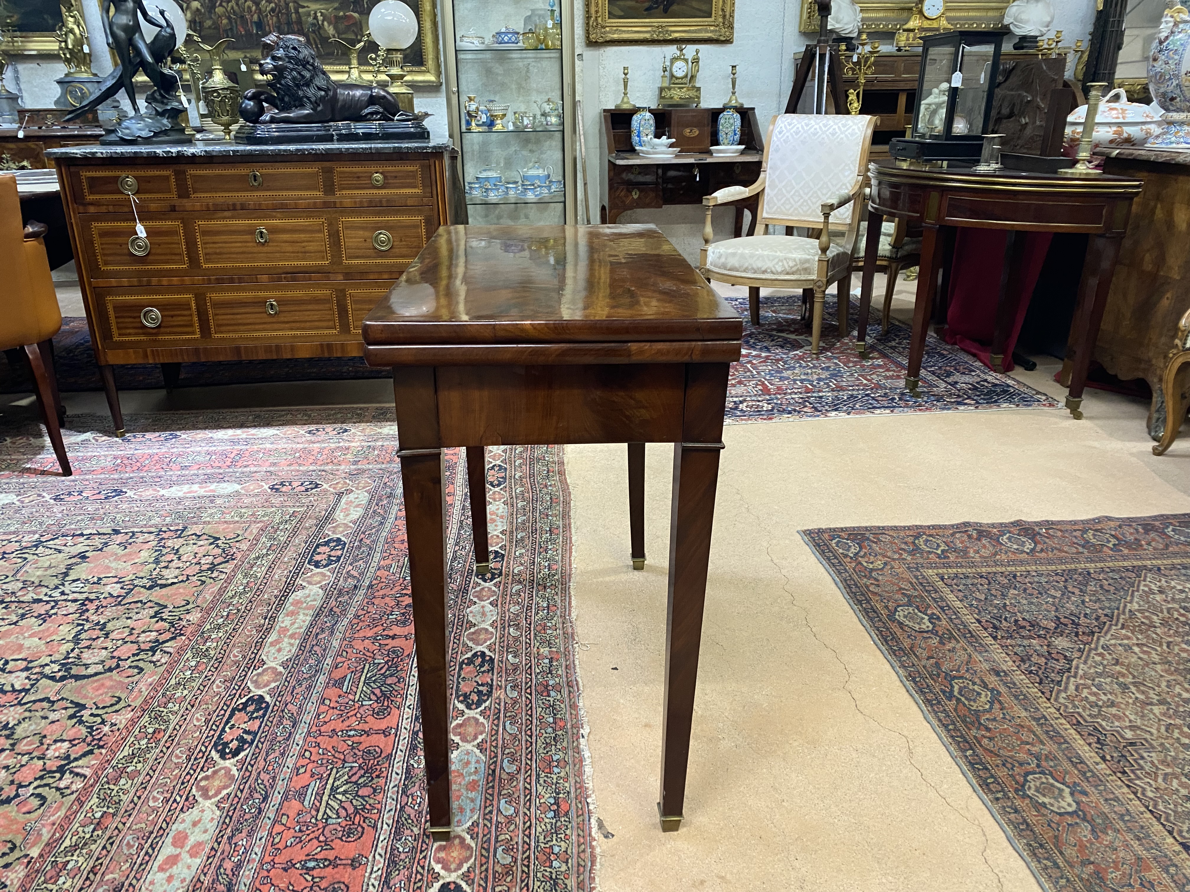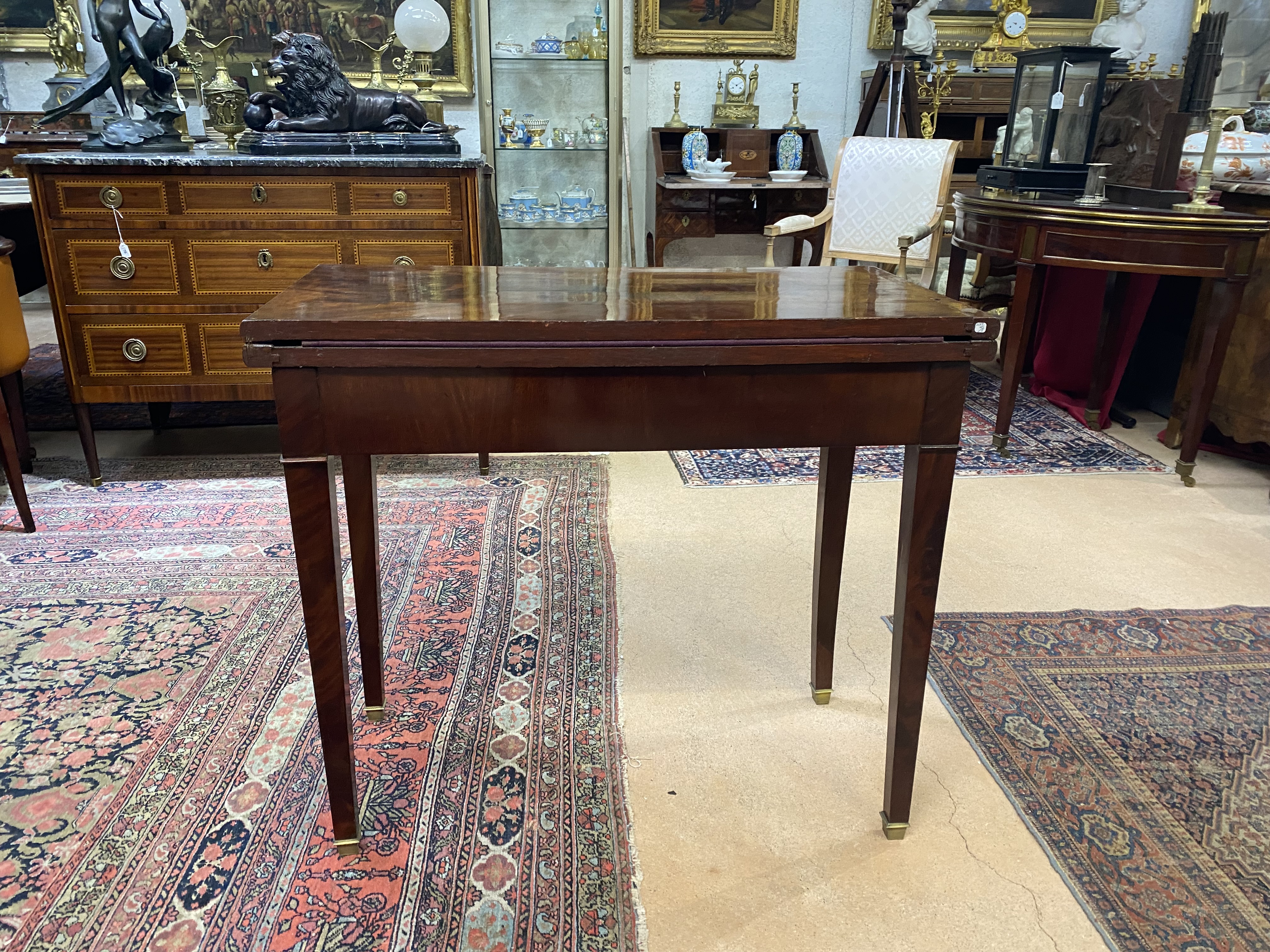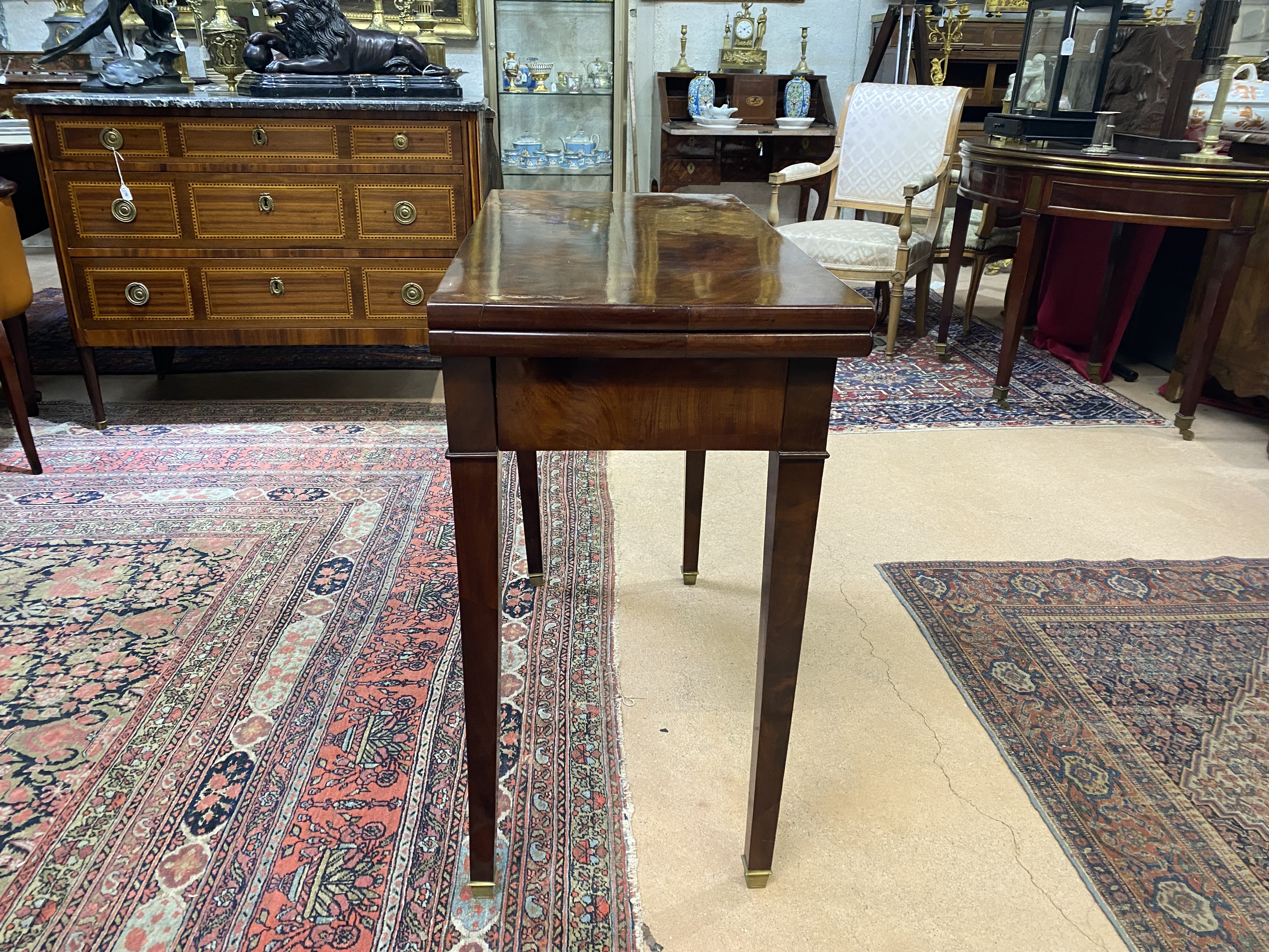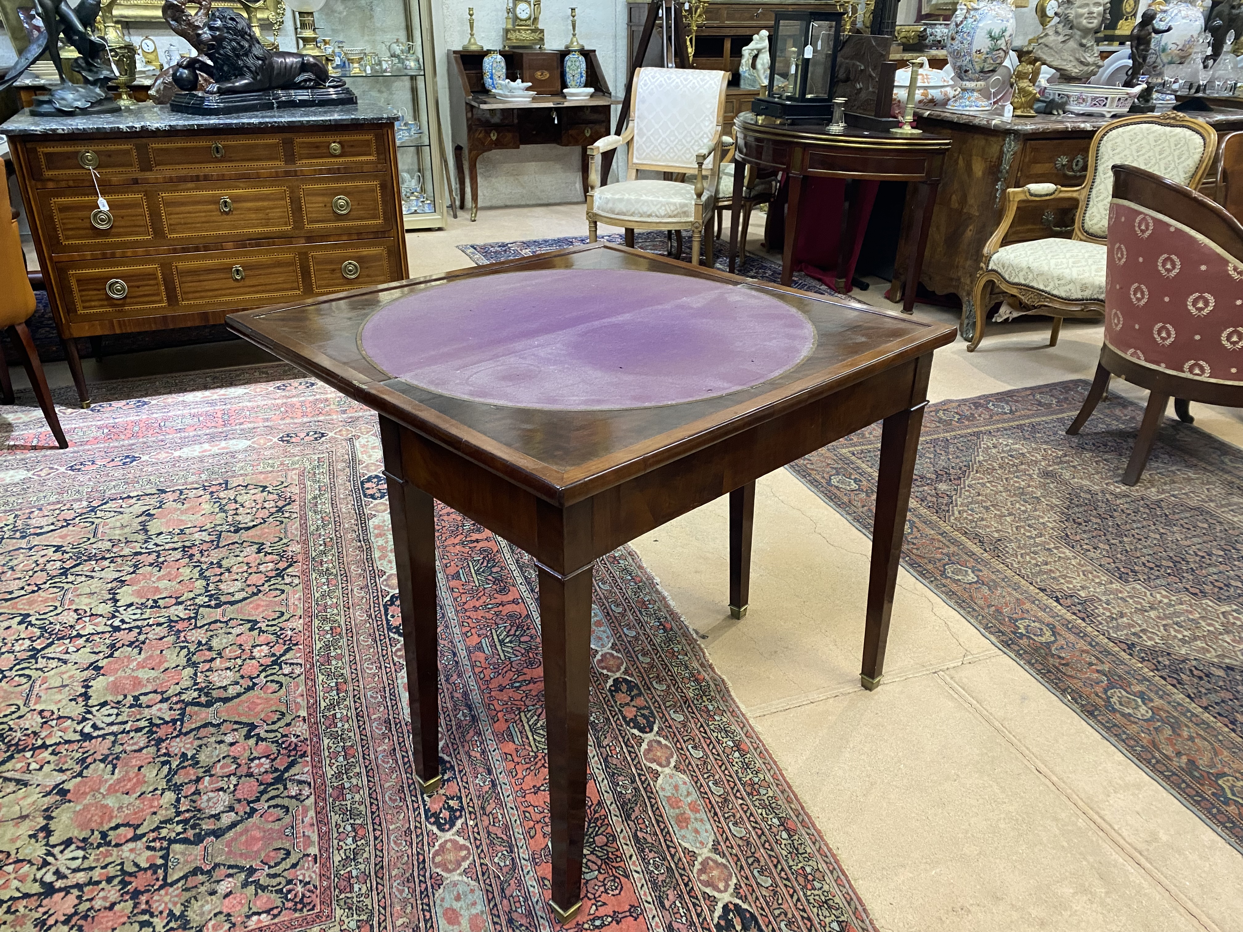 en placage d'acajou, à plateau rectangulaire dépliant. Il découvre un feutre parme entouré d'un motif de grecques. Elle repose sur quatre pieds en gaine.