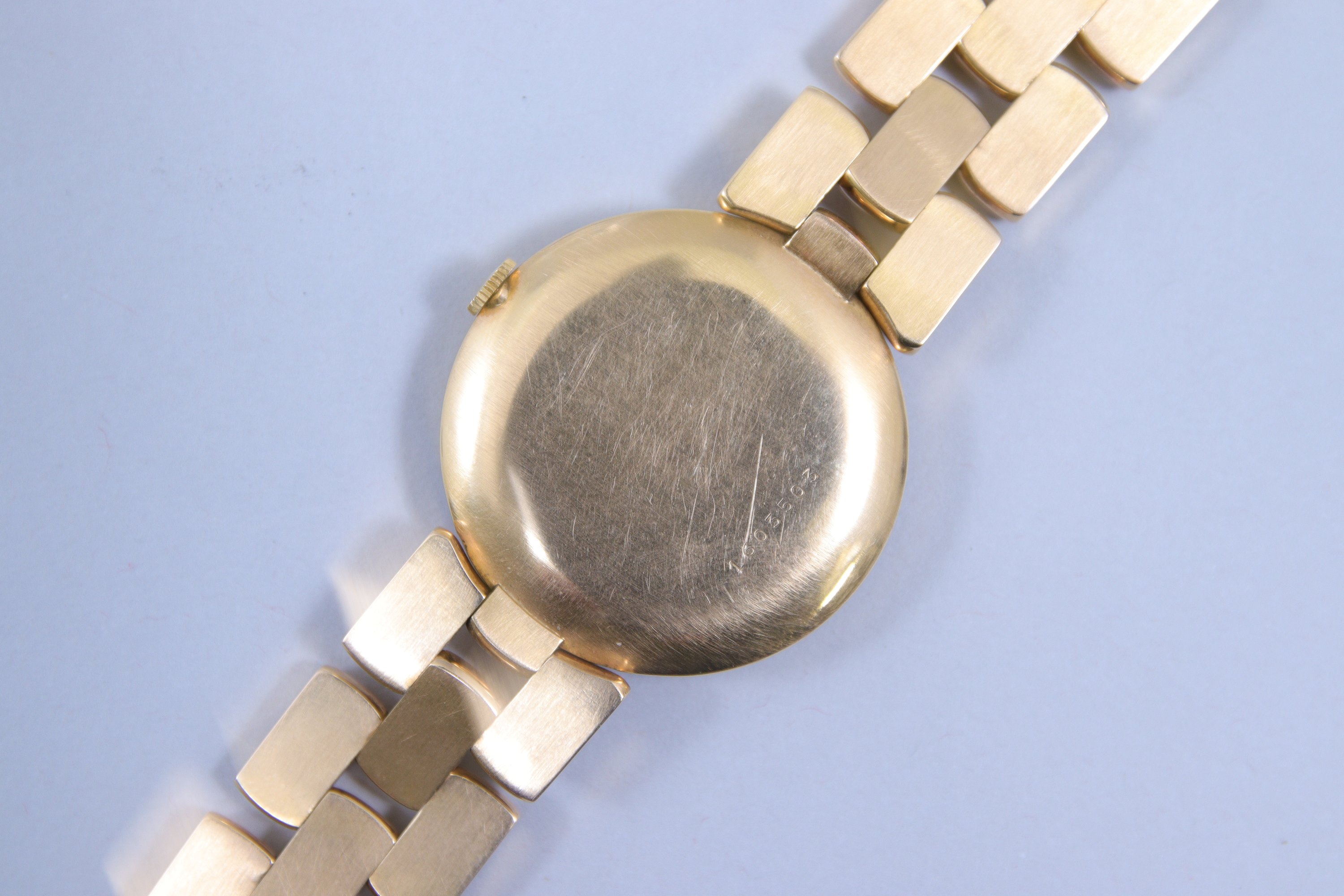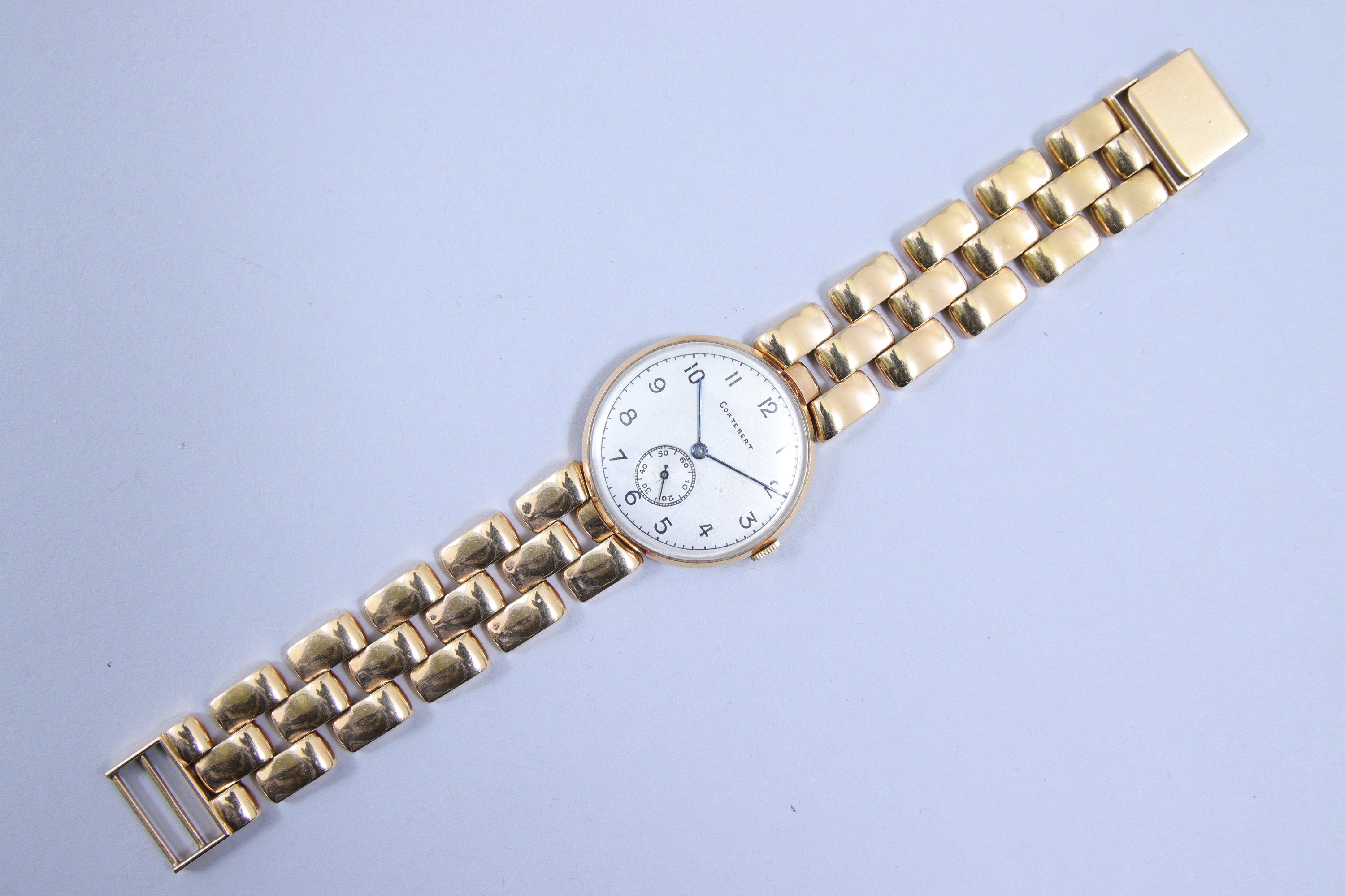 en or jaune 750 millièmes. Le boîtier circulaire uni extra-plat aux chiffres arabes et chemin de fer, avec un cadran pour la trotteuse des secondes à six heures. Mouvement mécanique. Numérotée "1603503".