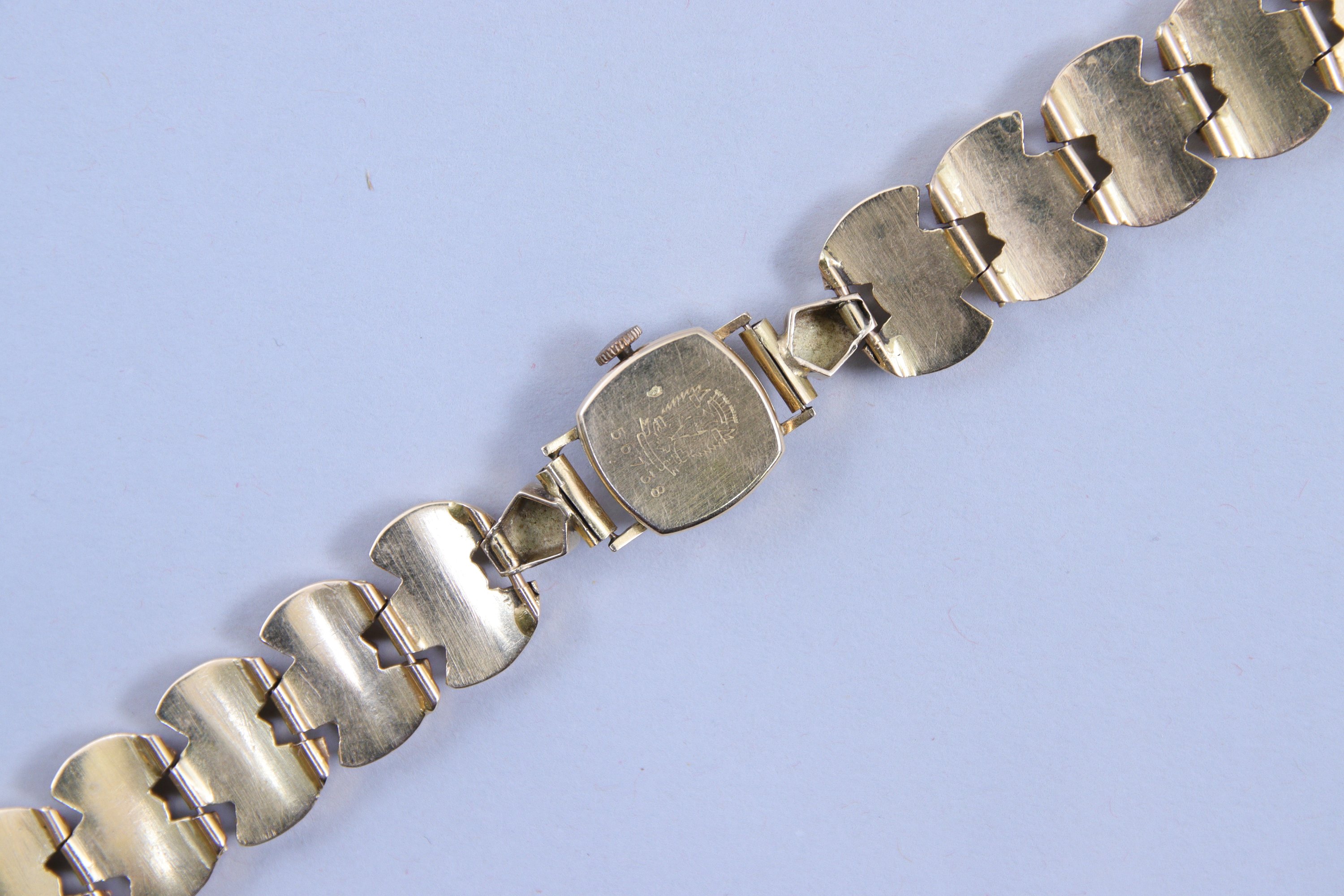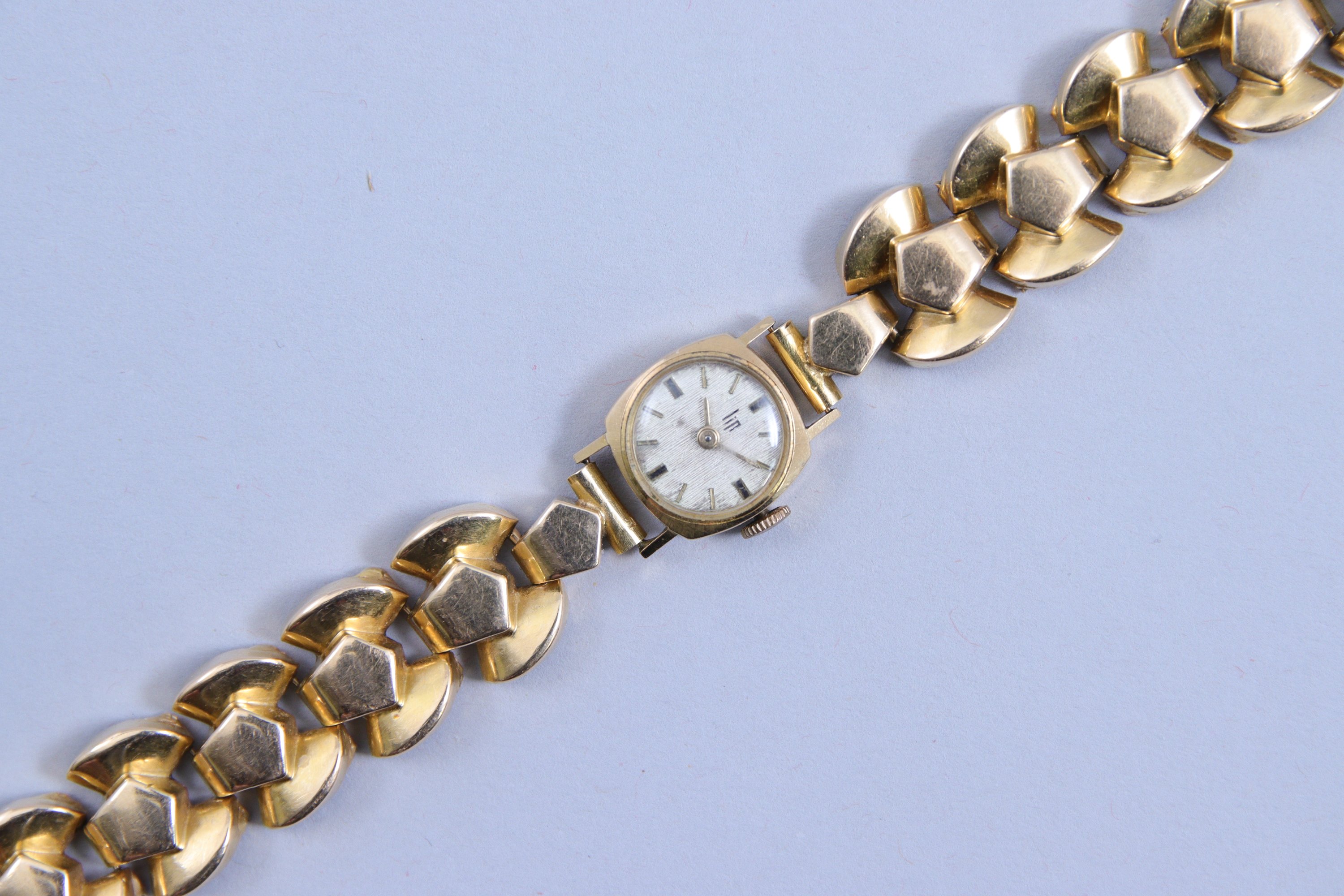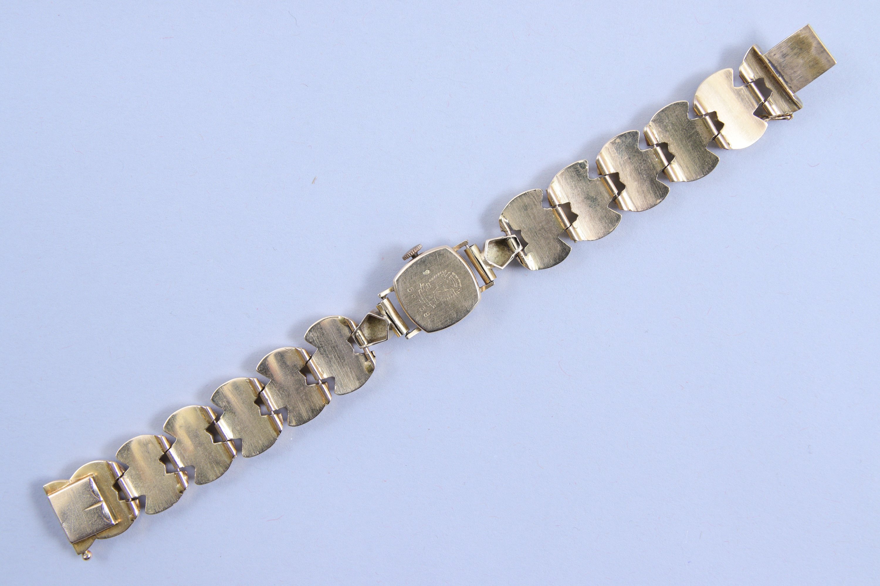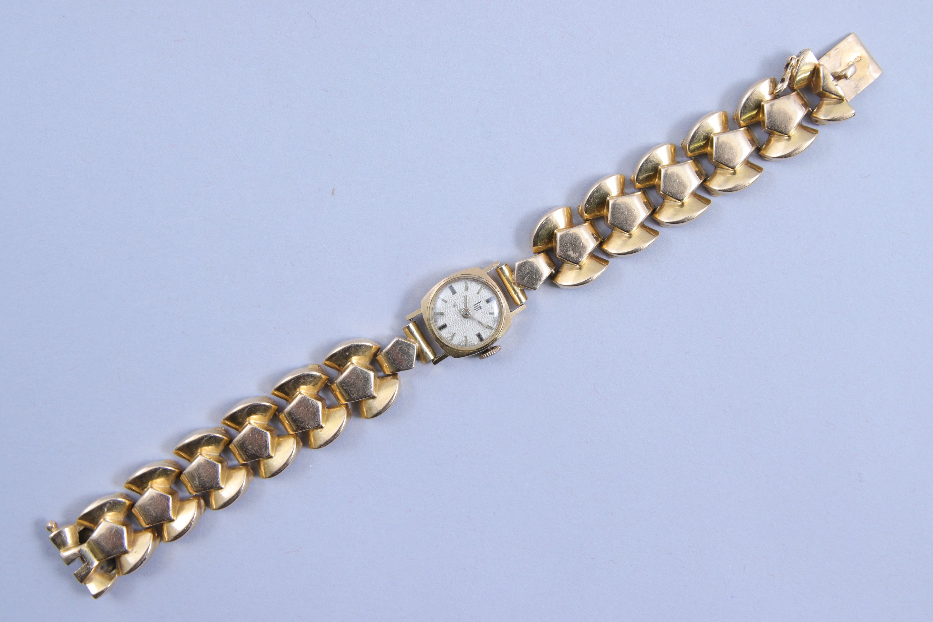 en or jaune 750 millièmes. Le cadran indiquant les heures par des bâtonnets. Remontoir à trois heures. Le bracelet à maillons articulés en or jaune 750 millièmes.