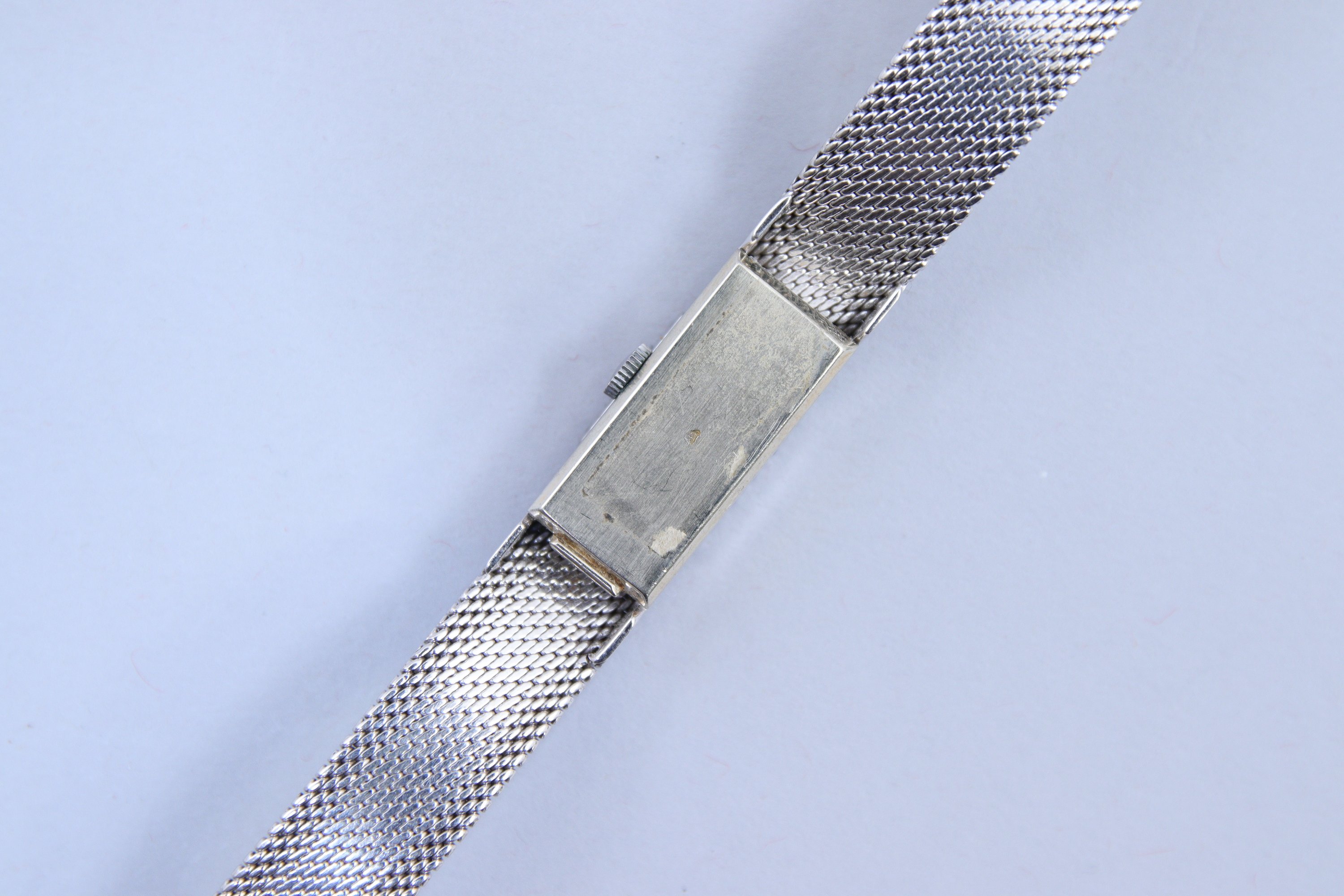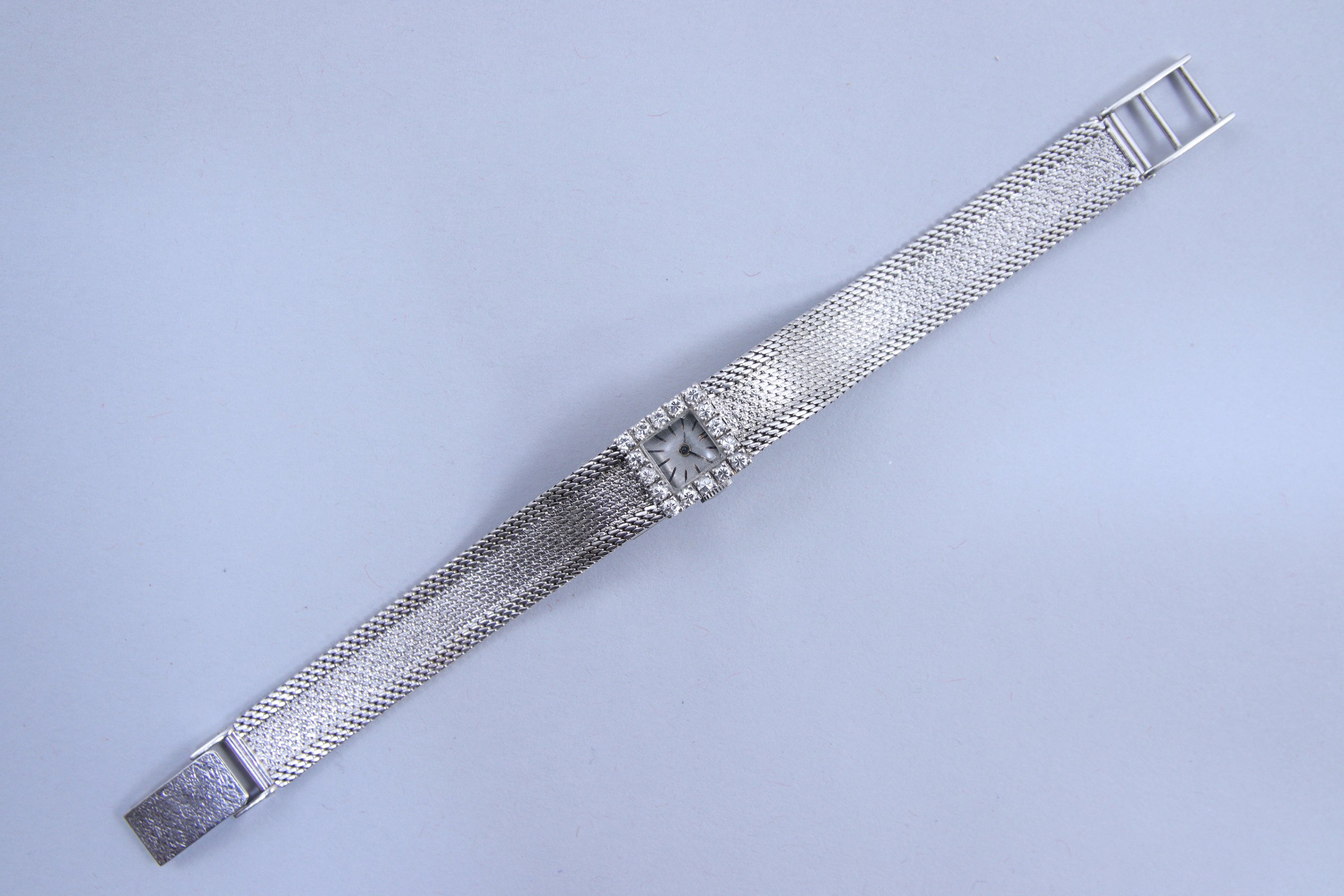 en or gris 750 millièmes, à mouvement mécanique à remontage manuel. Le cadran de forme carrée souligné par seize brillants. Il indique les heures par des bâtonnets.