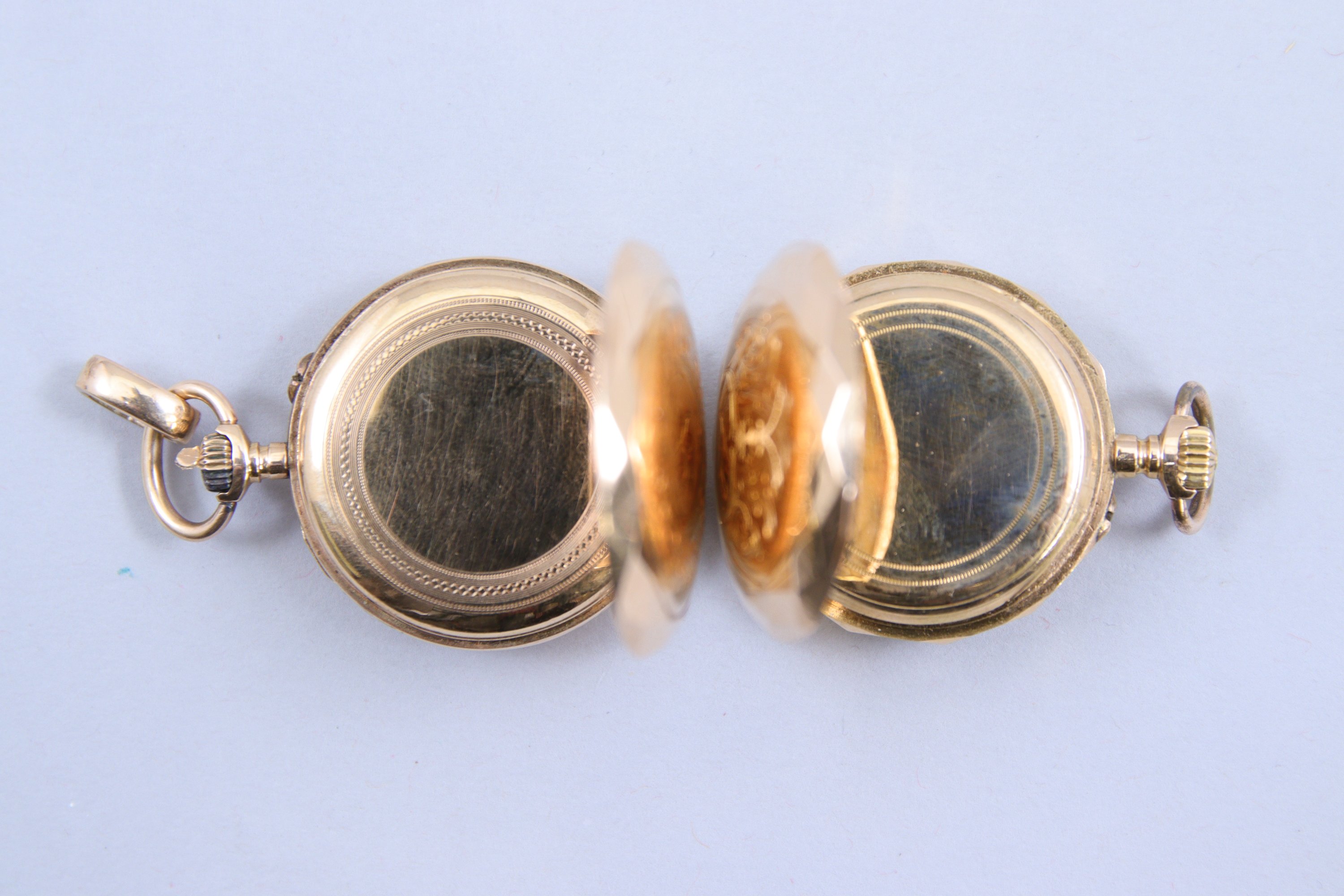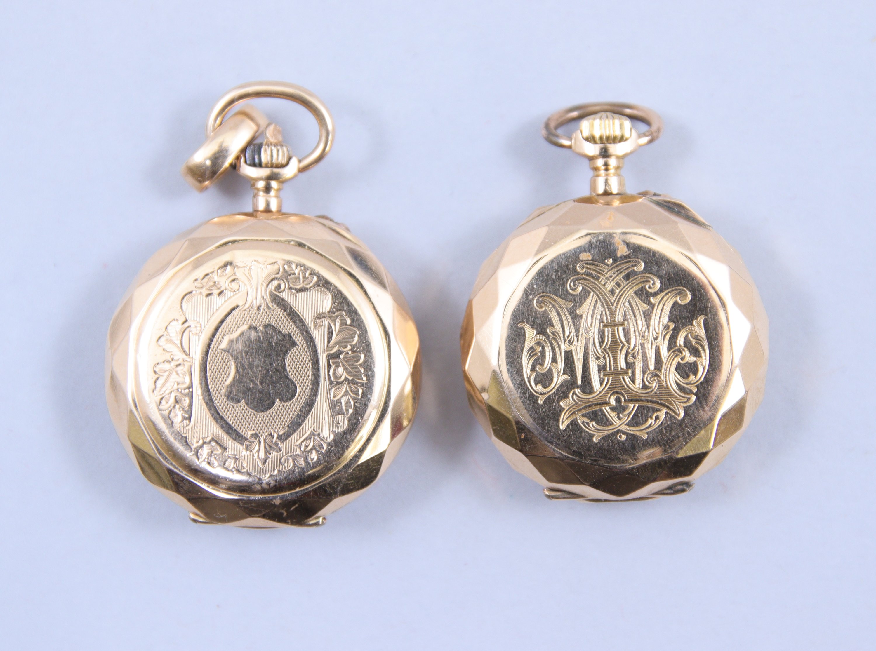 en or jaune 750 millièmes. Les boitiers à facettes monogrammés. Les cadrans avec les heures en chiffres romain et chemin de fer pour les minutes, remontoirs à midi.