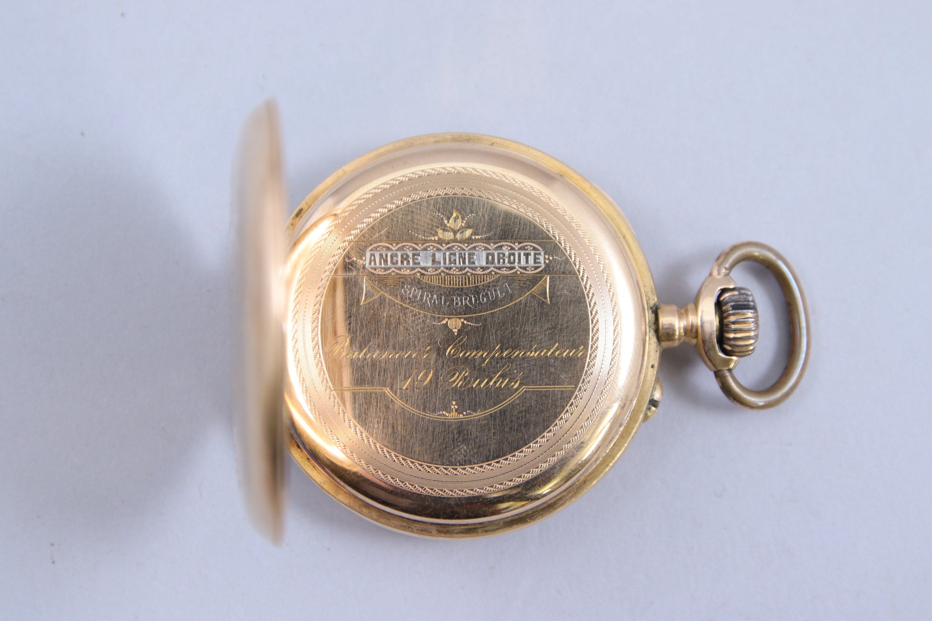 en or jaune 750 millièmes. Le cadran émaillé blanc indique les heures en chiffres romains, les minutes en chiffres arabes et chemin de fer. Petite trotteuse à six heures. Bélière et remontoir à 12 heures. Au revers, elle est décorée d'un cuir inscrit dans un médaillon entouré de rinceaux feuillagés. Sur le cache poussière est marqué "Ancre ligne droite / spirale Breguet / balancier compensateur / 19 rubis". Numérotée 308.
