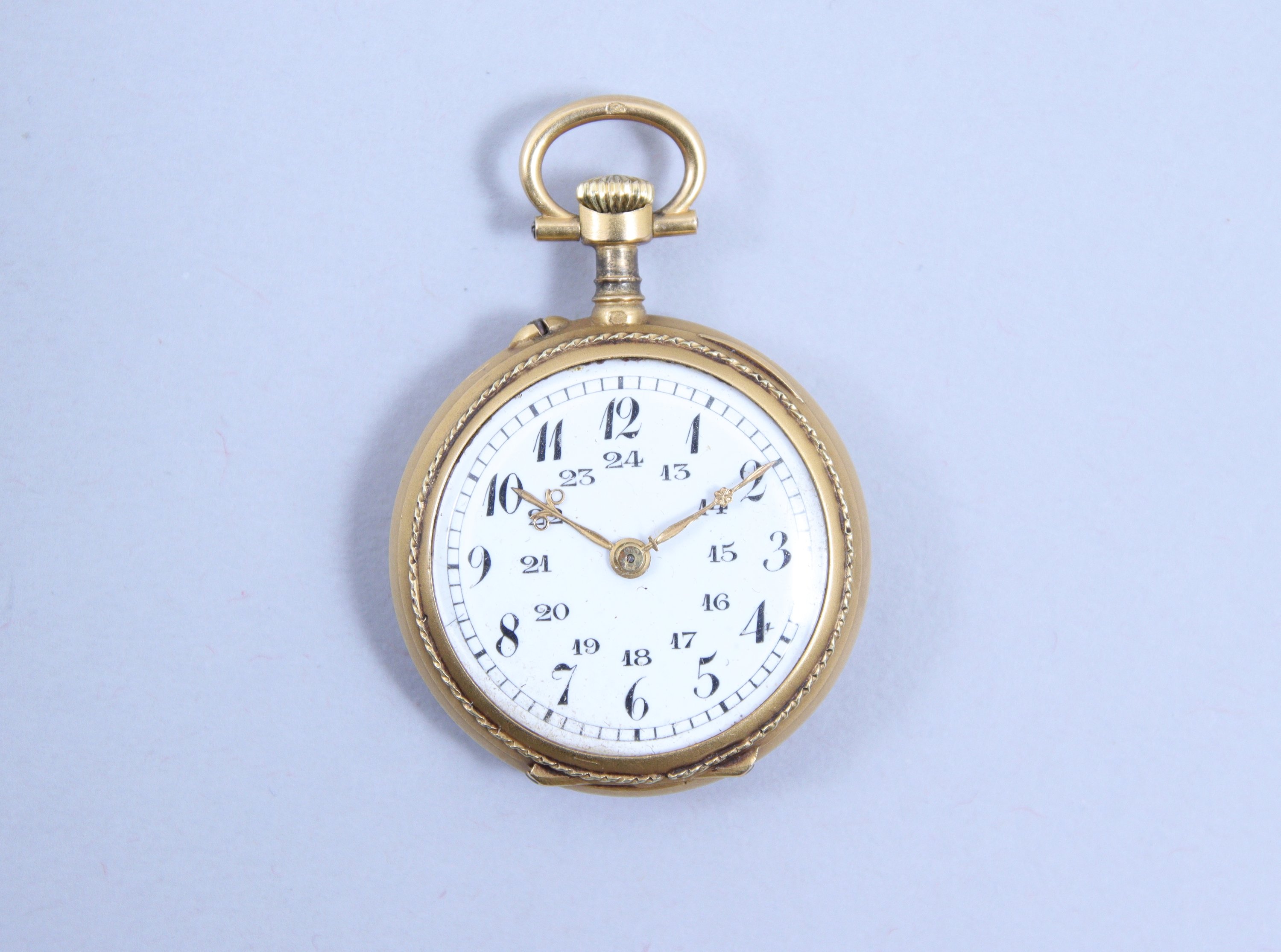 en or jaune 750 millièmes, le cadran circulaire émaillé avec les heures en chiffres arabes et chemin de fer pour les minutes. Remontoir à midi. Le boitier orné d'un médaillon de style Art Nouveau 1900.