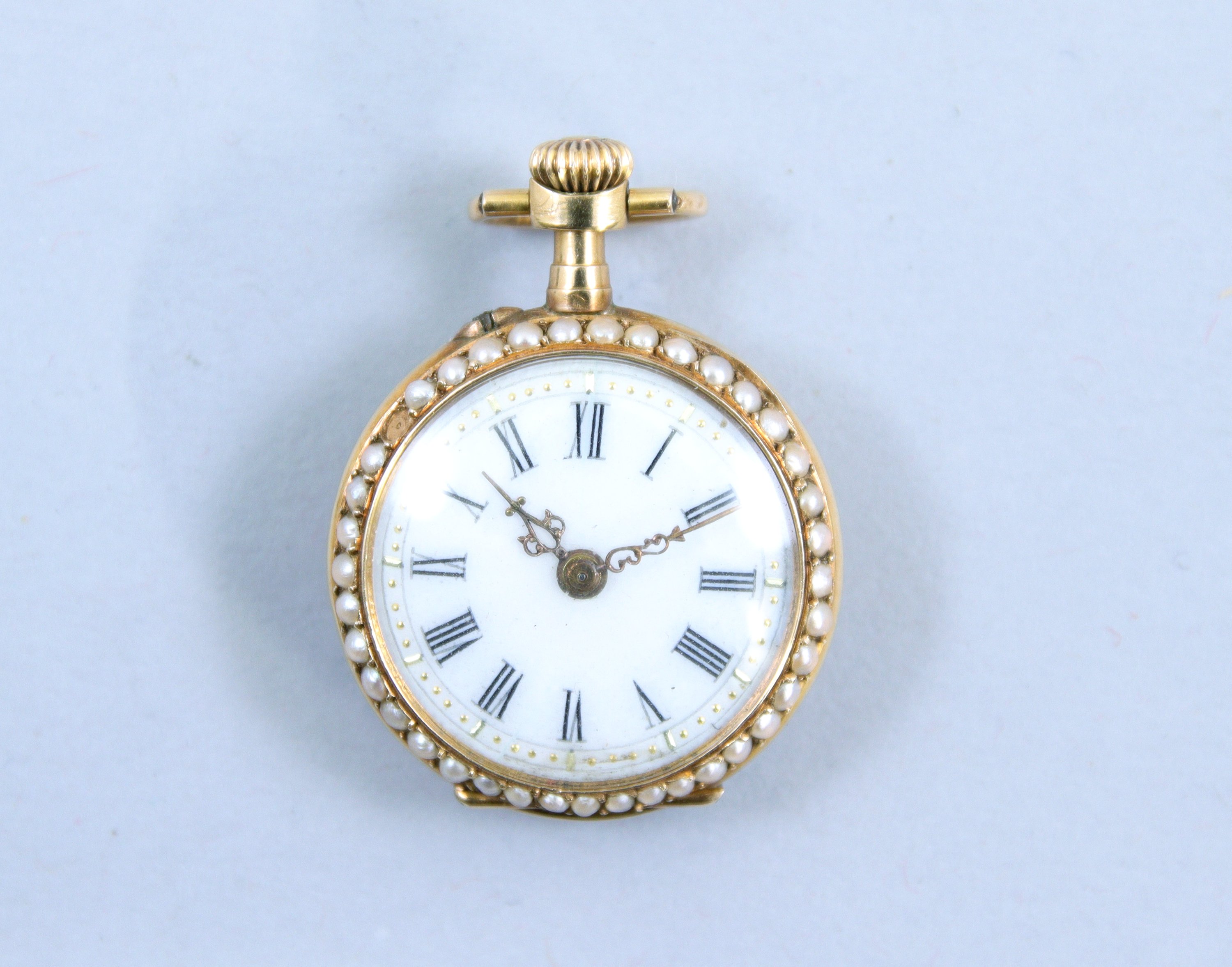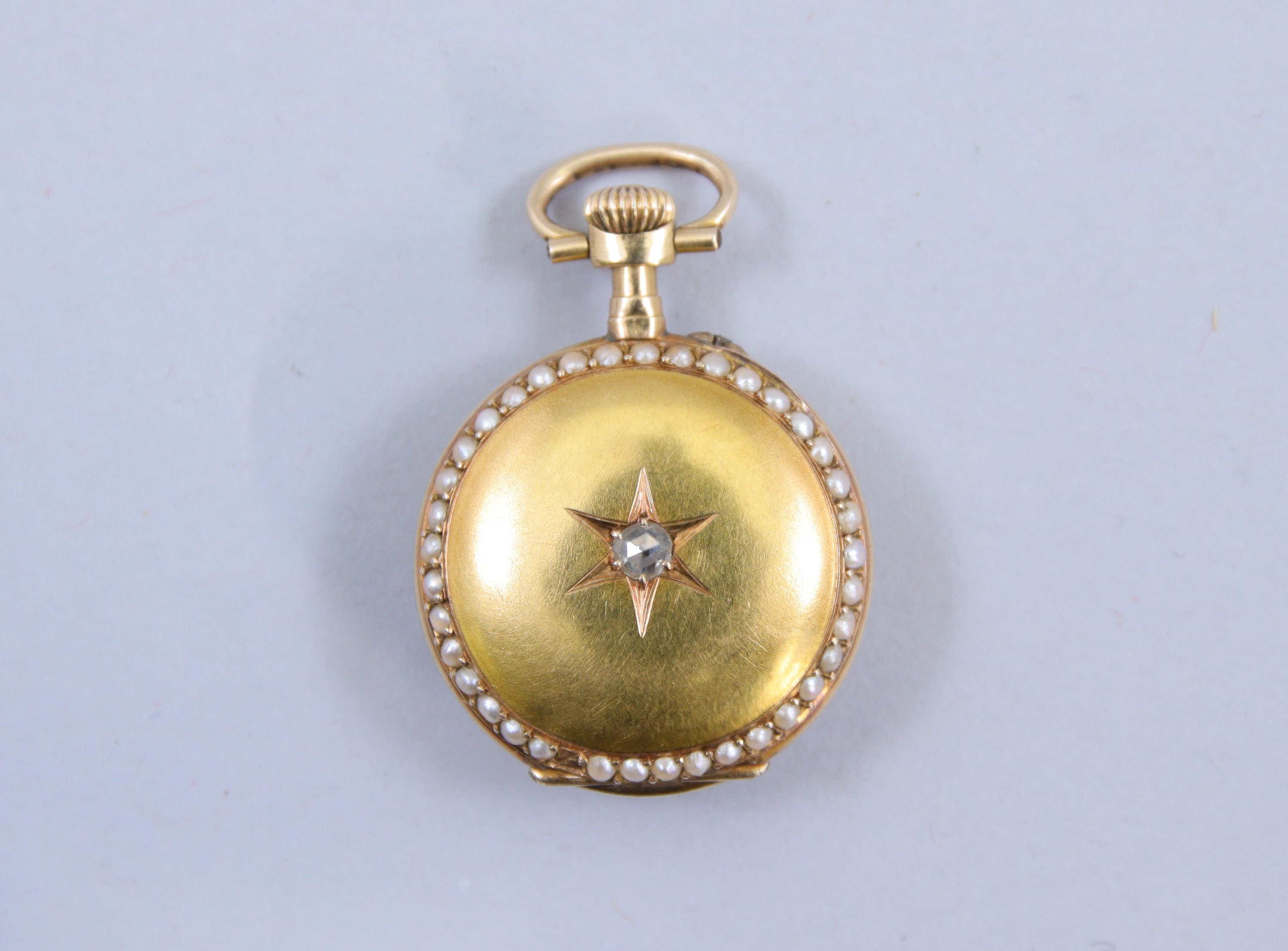 en or jaune 750 millièmes. Le cadran souligné de semis de perles indiquant les heures en chiffres romains, les minutes par des pointillets. Le revers serti d'un brillant dans une étoile gravée. Remoitoir et bélière à 12 heures.
