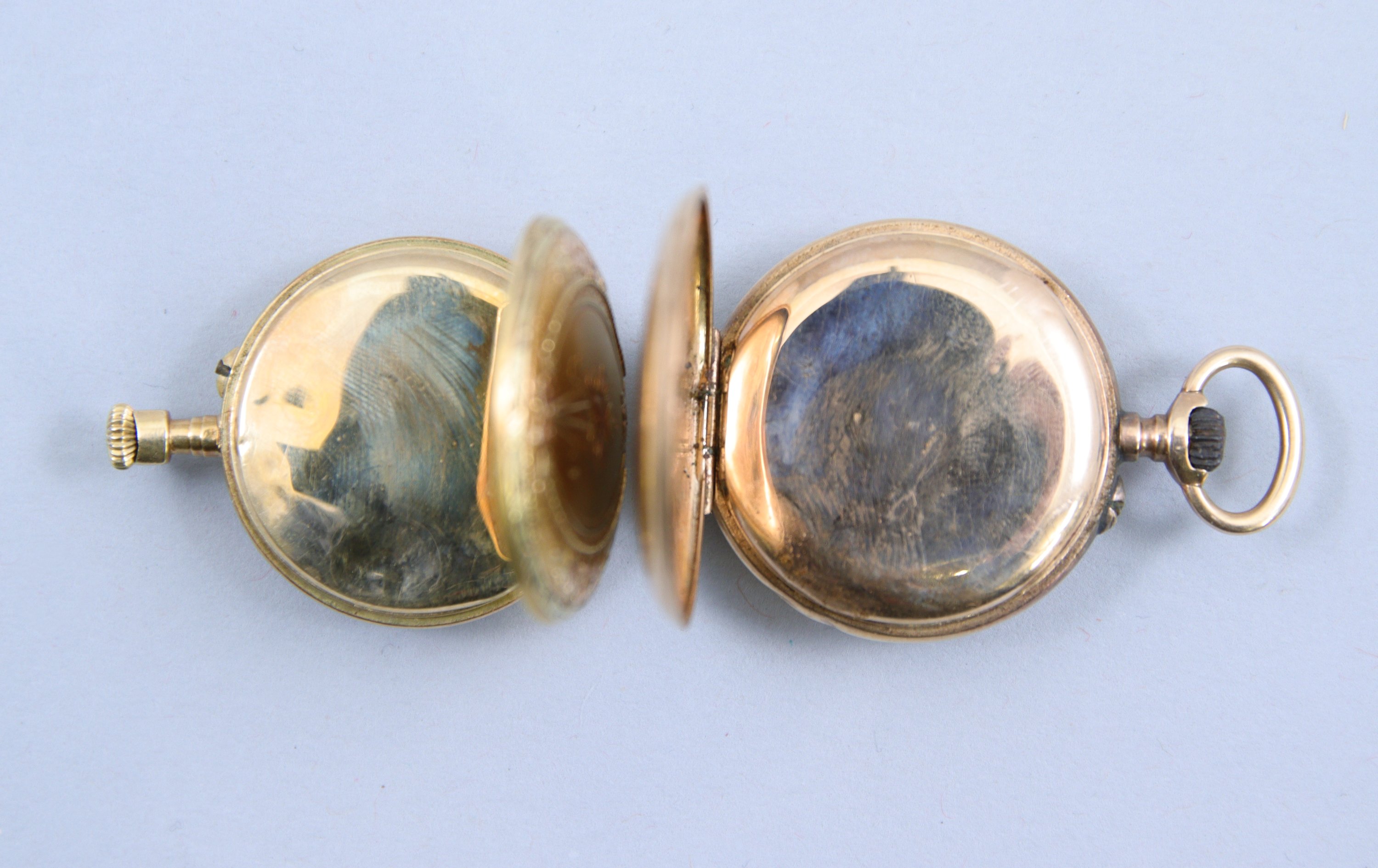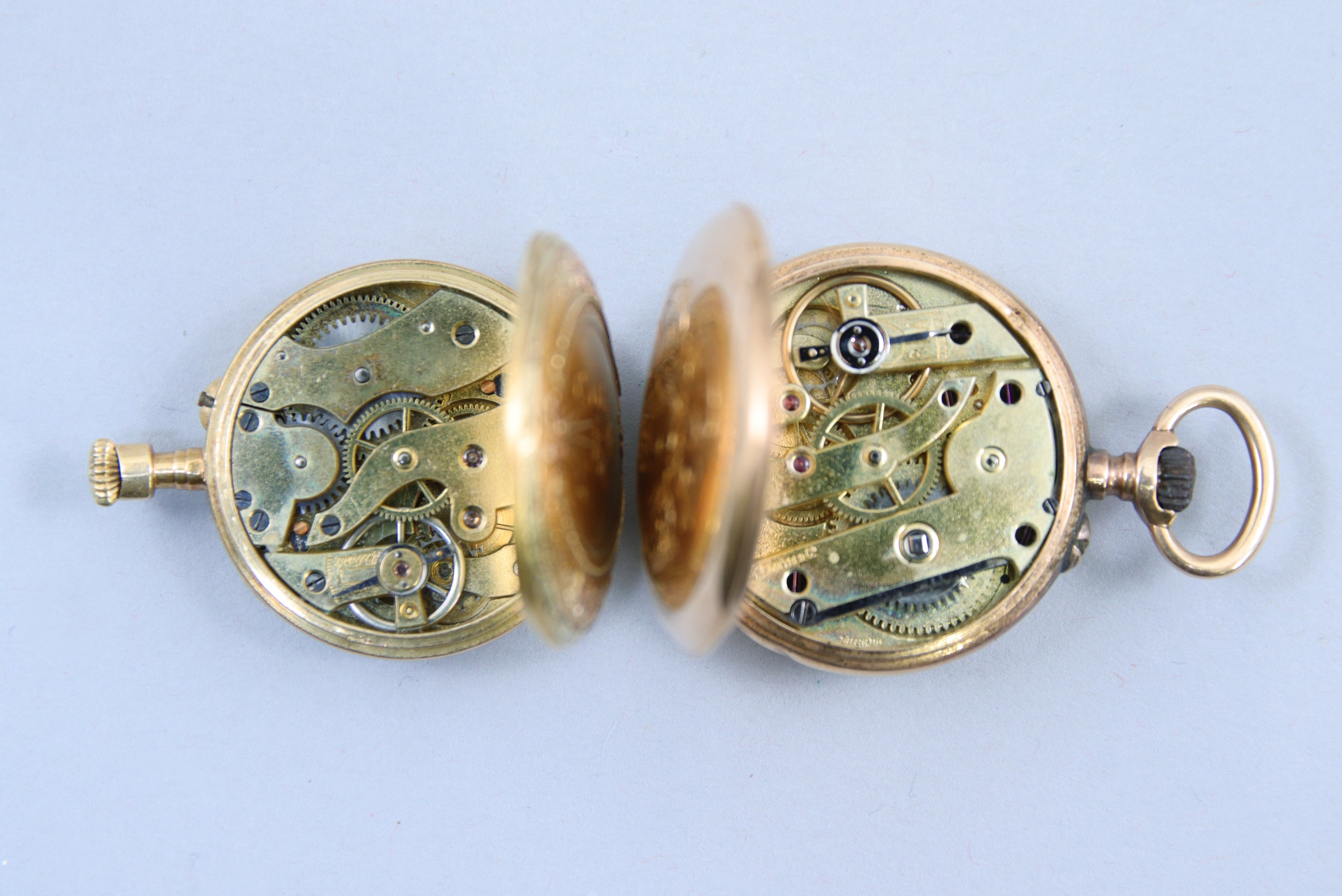 en or jaune 750 millièmes. Leurs cadrans indiquent les heures en chiffres arabes. L'une chiffrée au revers, l'autre à décor d'un instrument de musique dans un médaillon. L'une "numérotée 331301", l'autre "68200". Remontoir à 12 heures.