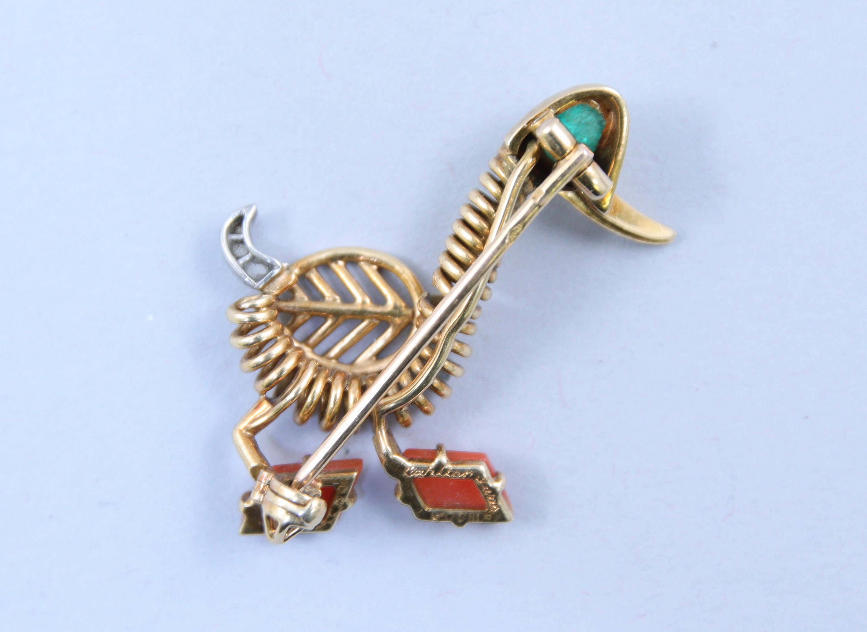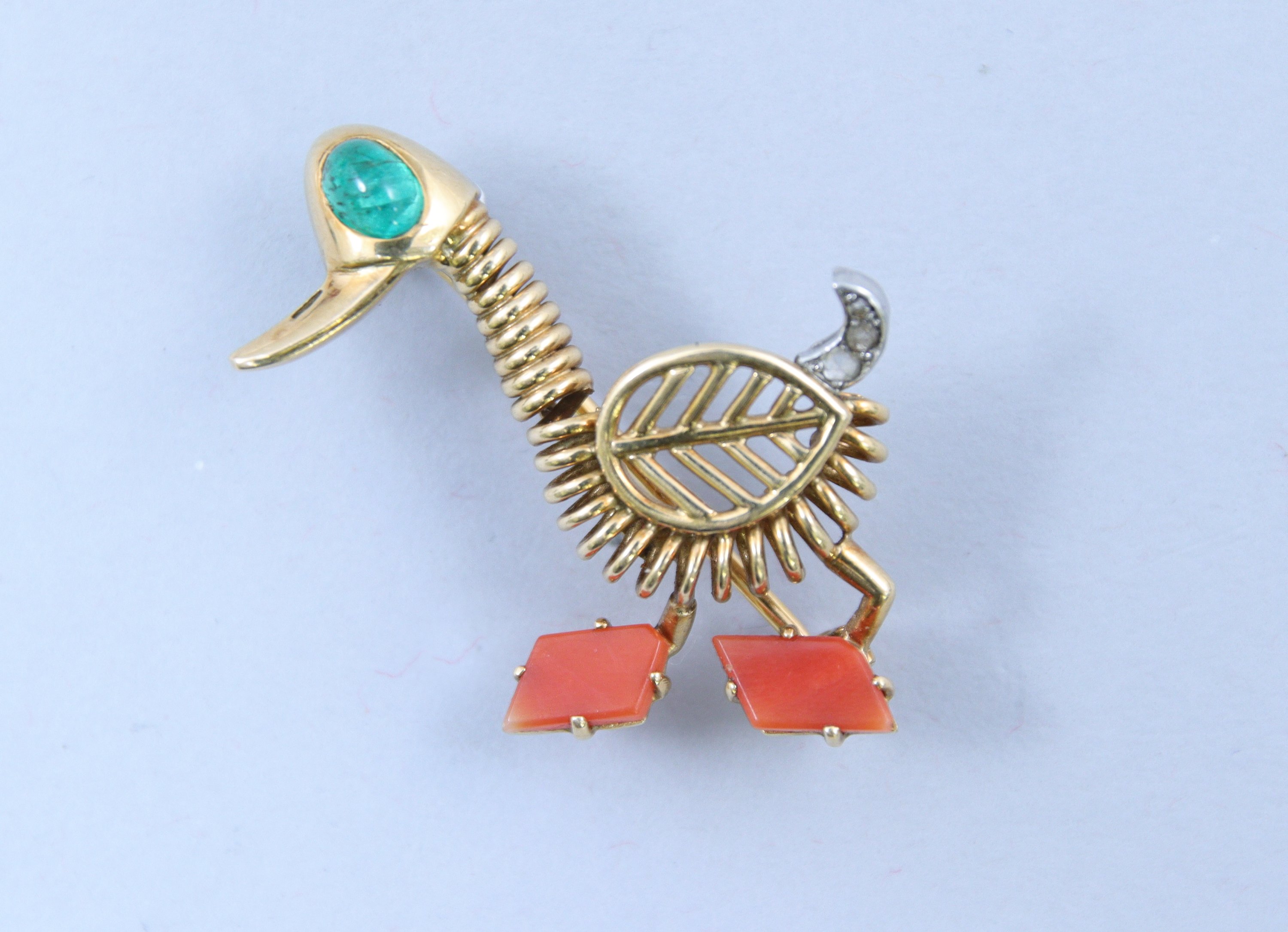 en or jaune 750 millièmes, l'il orné d'une émeraude cabochon, les pattes en corail et la queue de diamants taillés en rose.