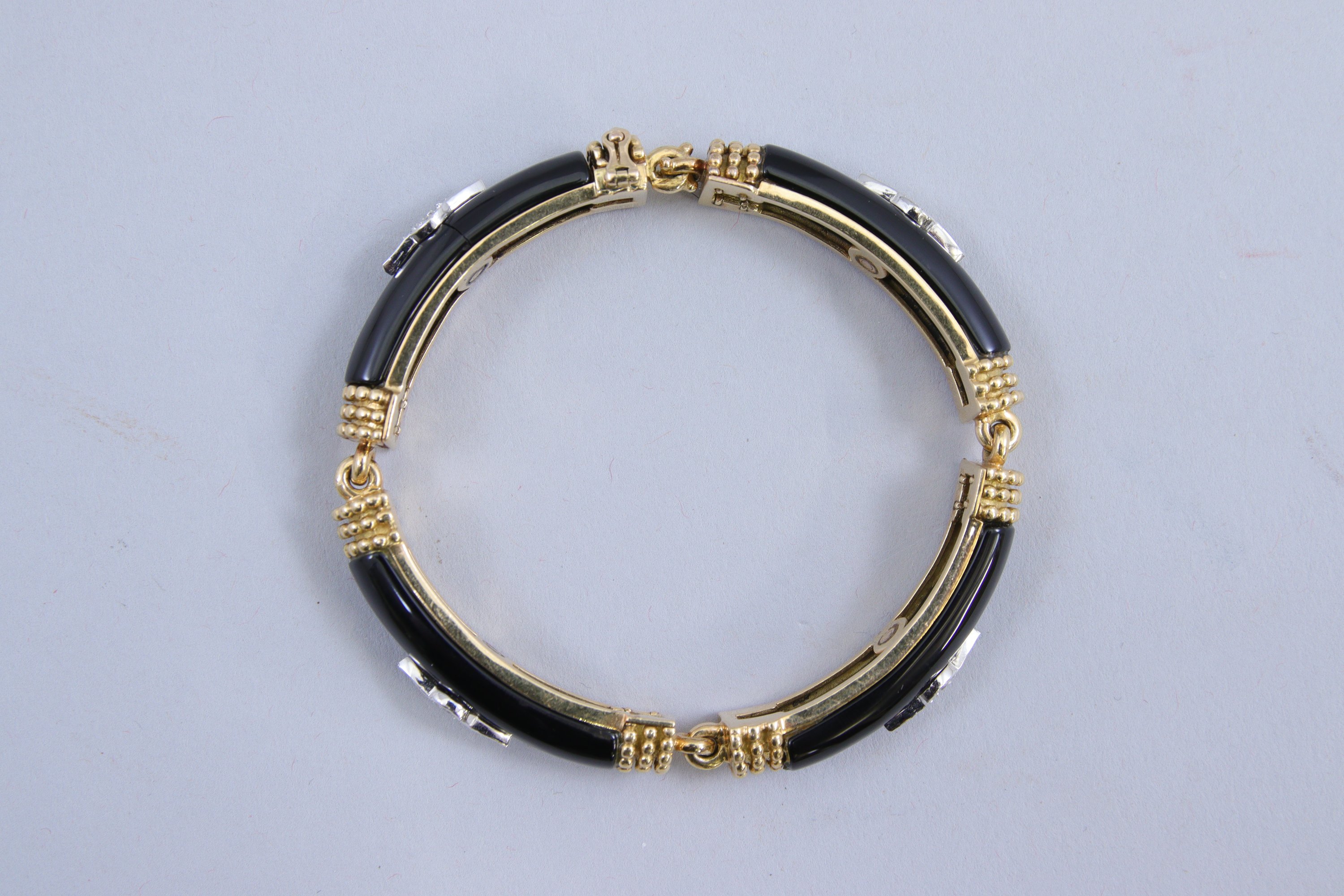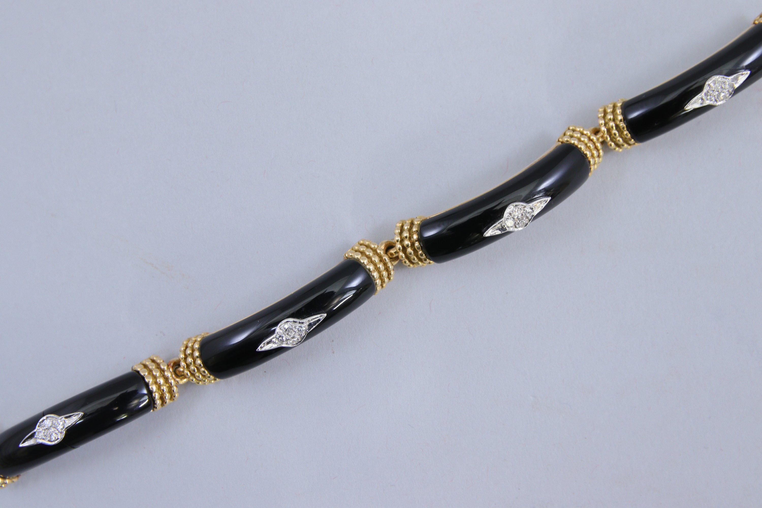 en or jaune 750 millièmes composé de quatre maillons, chacun orné d'un motif bombé en onyx et serti de quatre petits diamants ronds taillés en huit-huit.