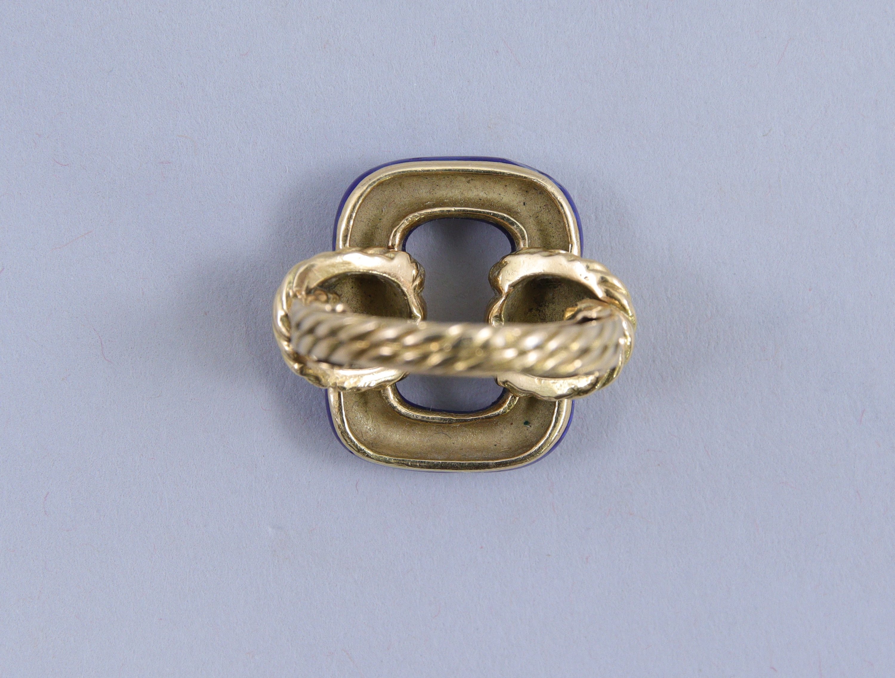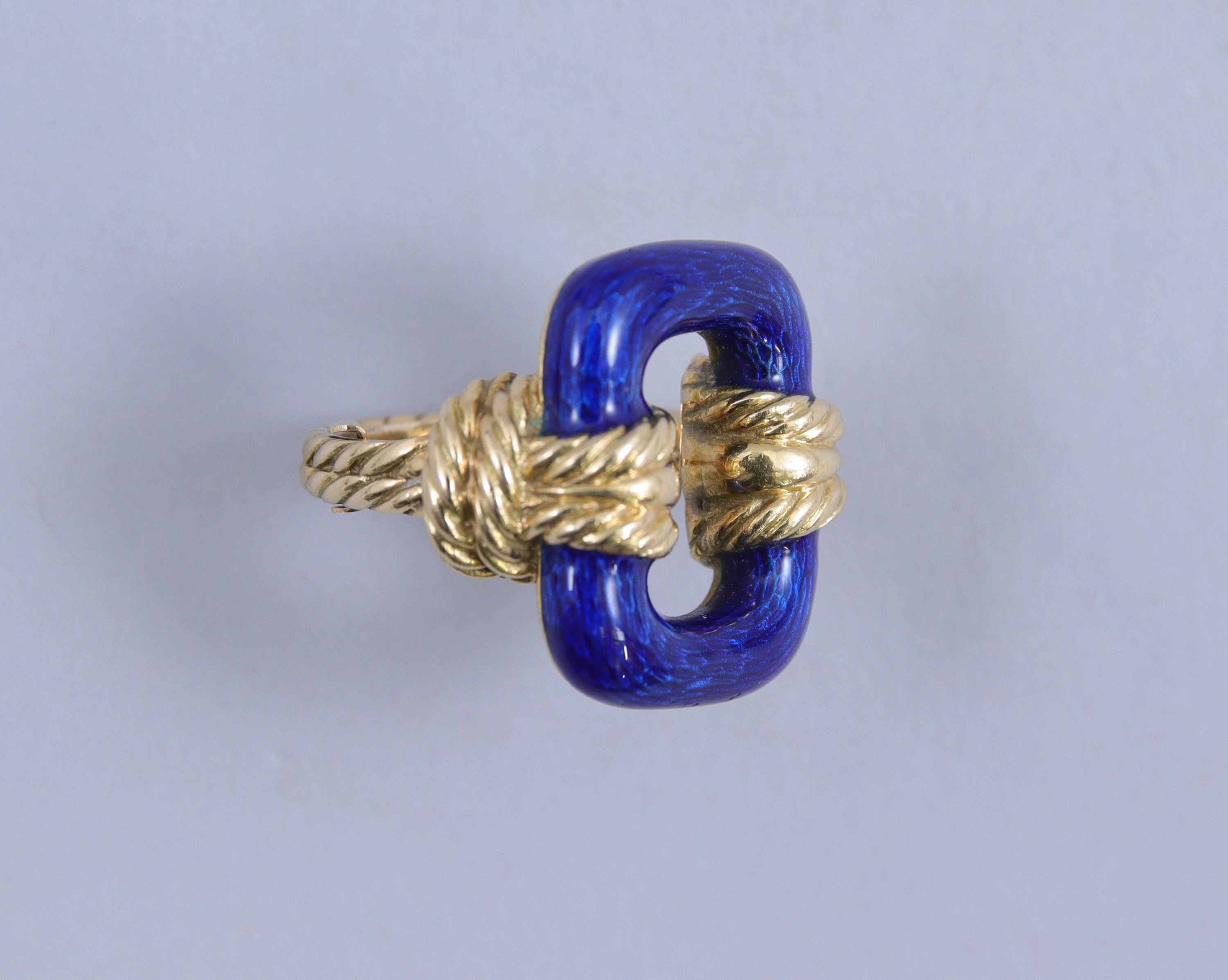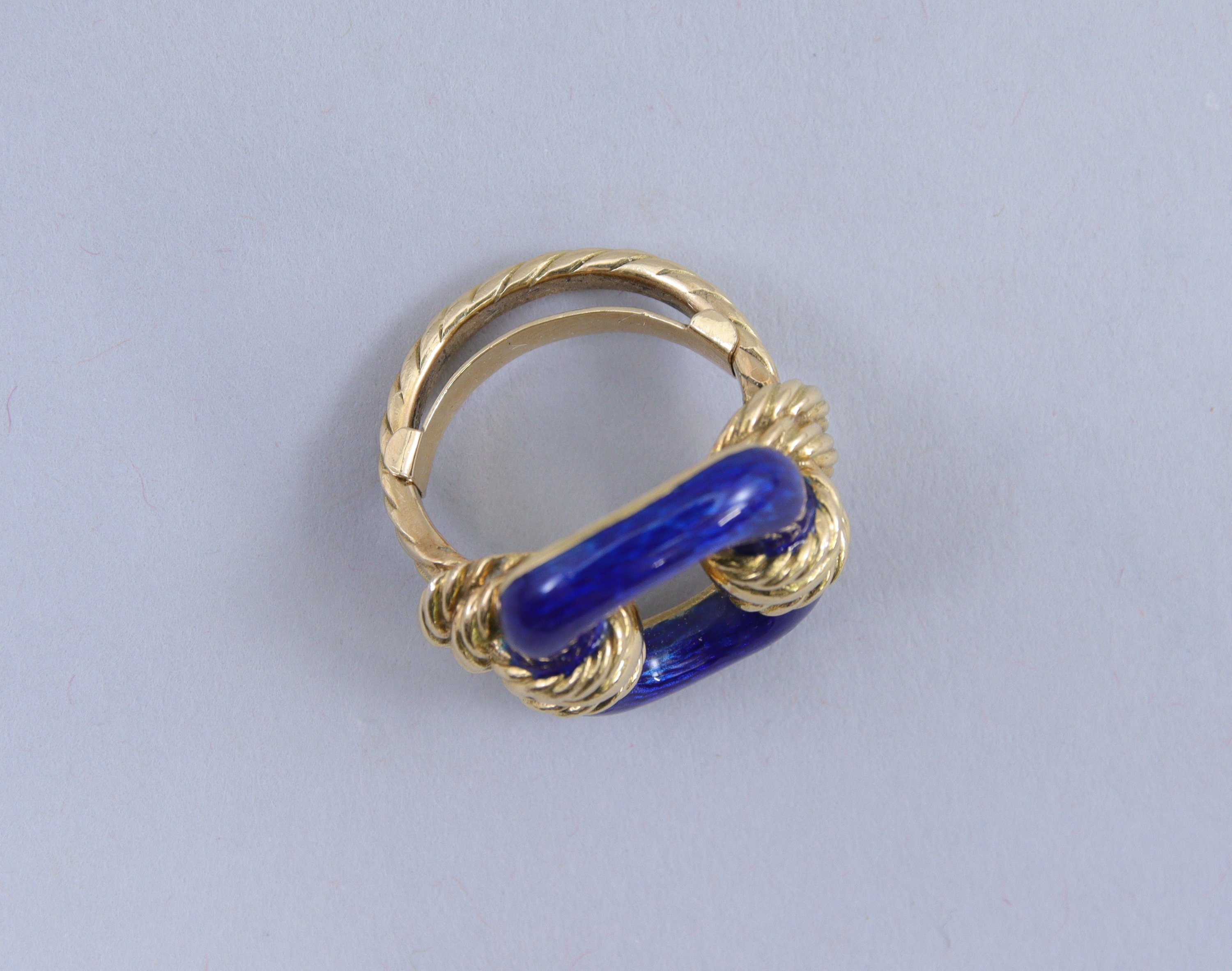 Bague en or jaune gravé retenant au centre un motif émaillé bleu.