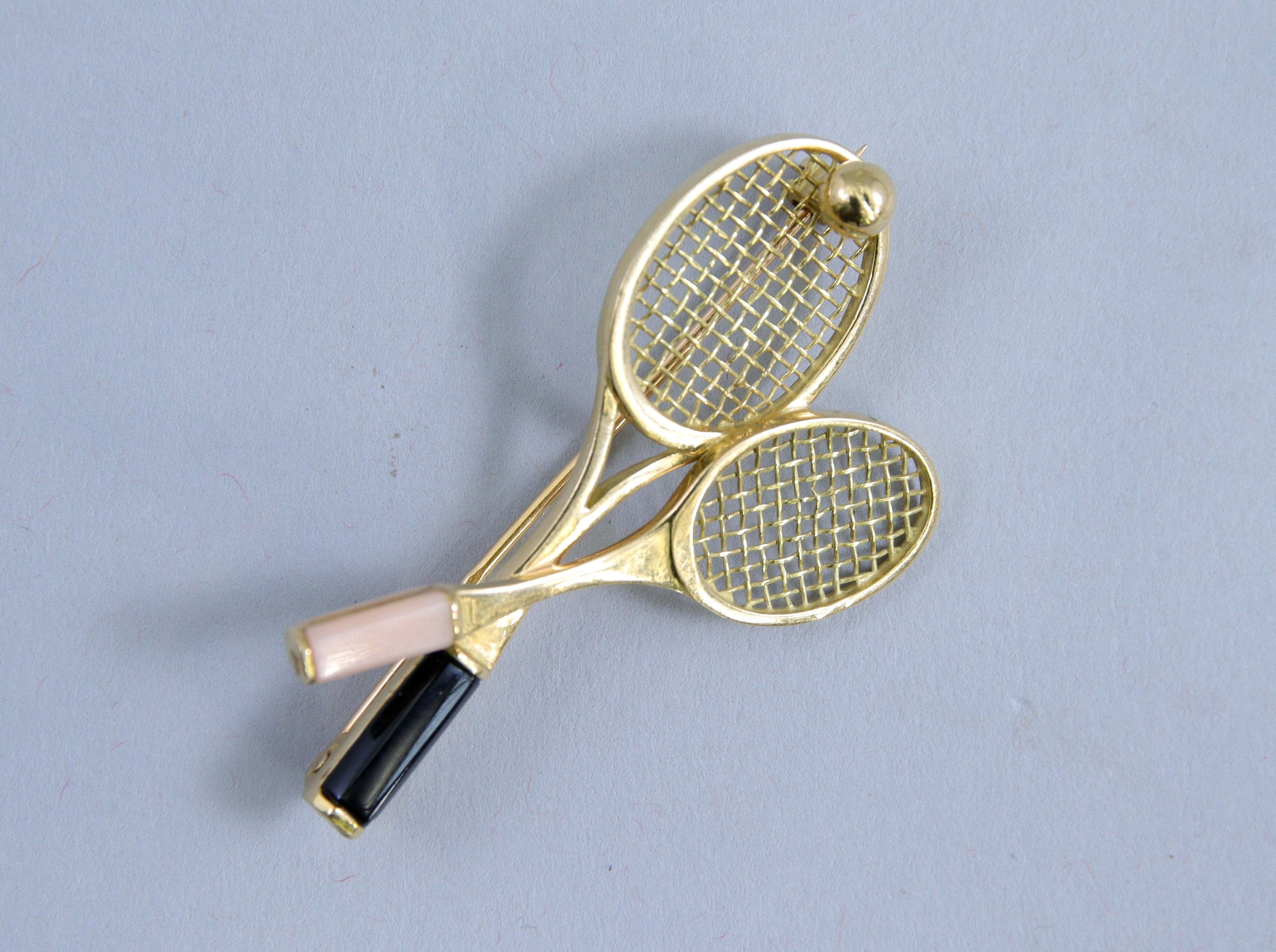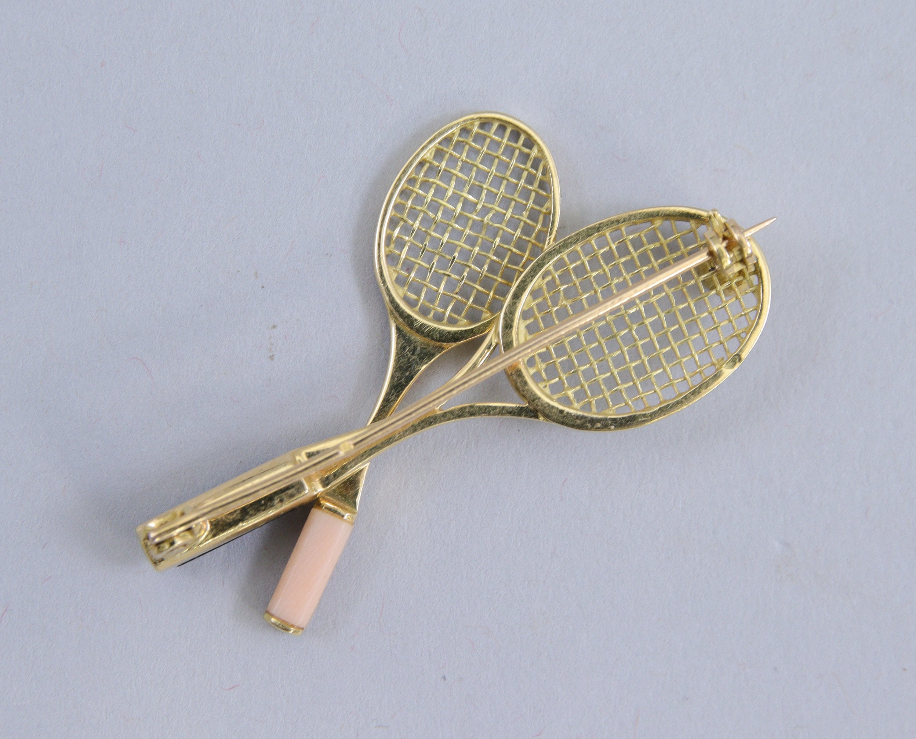 en or jaune 750 millièmes, figurant deux raquettes de tennis croisées, les manches ornées d'onyx ou de corail.