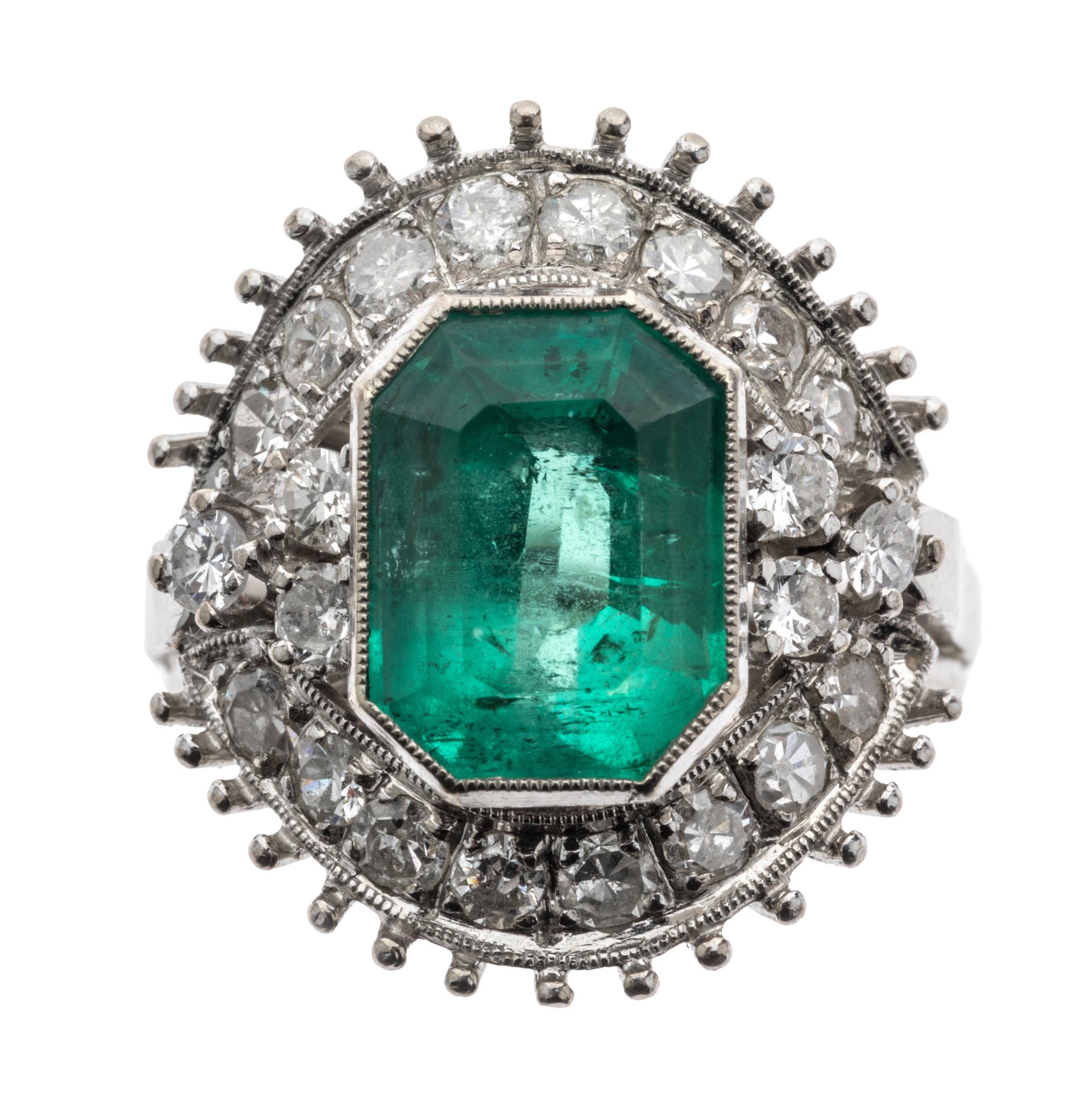 en or gris 750 millièmes, ornée au centre d'une émeraude rectangulaire à pans coupés sertie clos dans un entourage de diamants ronds taillés en huit-huit et de taille brillant.