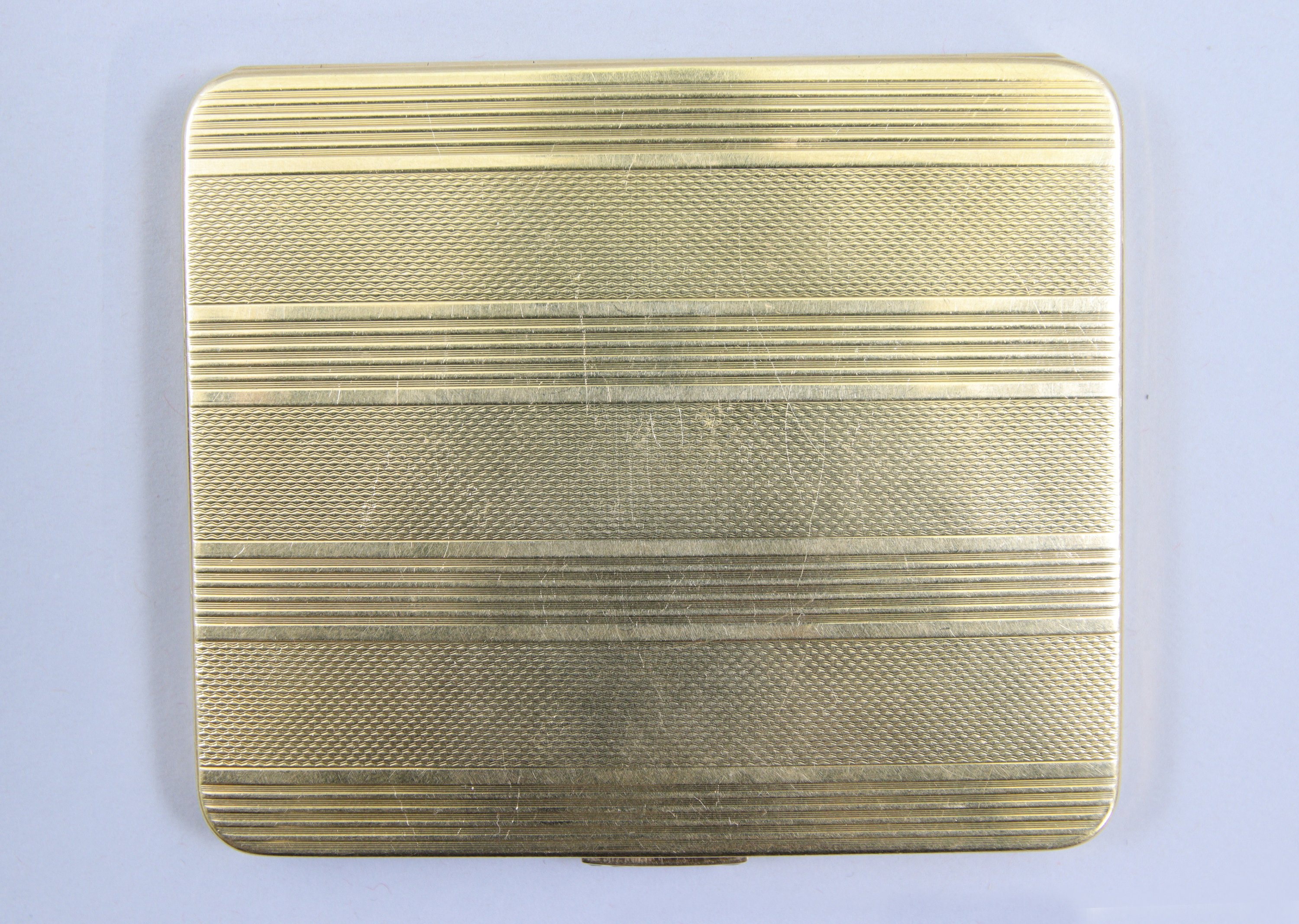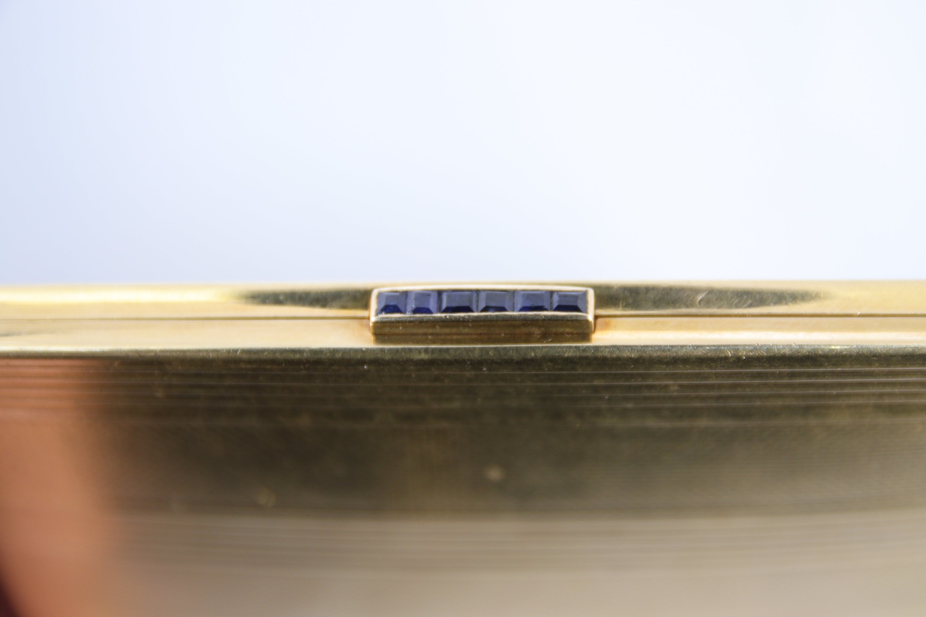 en or jaune 750 millièmes, à décor gravé et guilloché de cannelures et petites vaguelettes. Le bouton poussoir orné de six pierres noires.