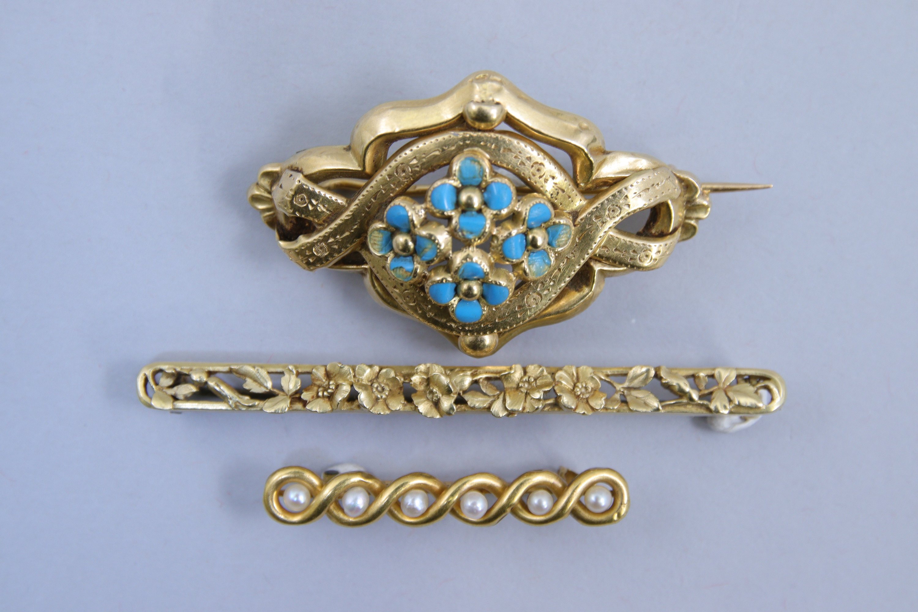 - La broche à décor de quatre fleurs en émail bleu dans un entourage d'entrelacs. Long. 4,6 cm. Poids brut : 5,3 gr.