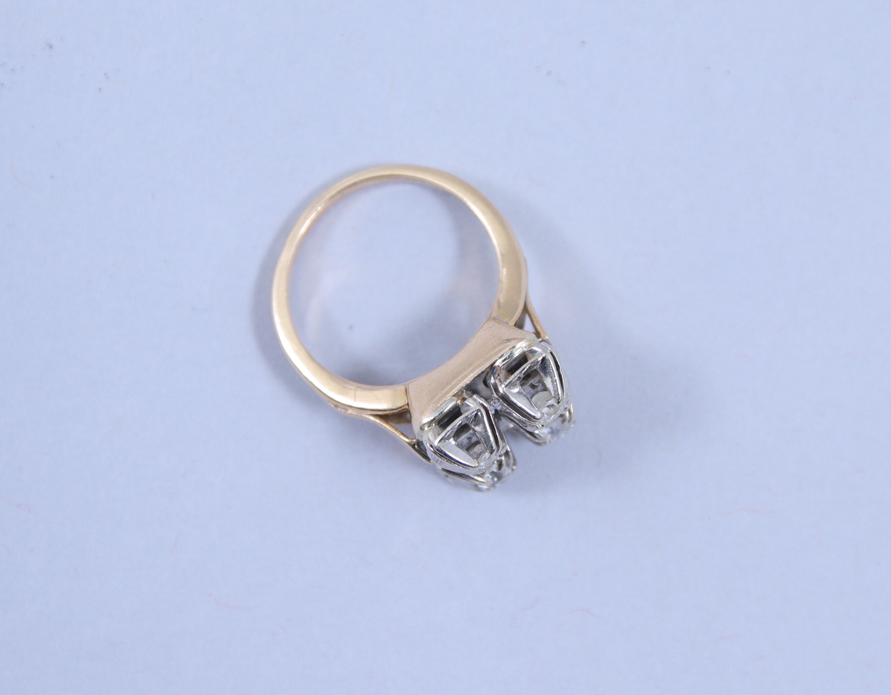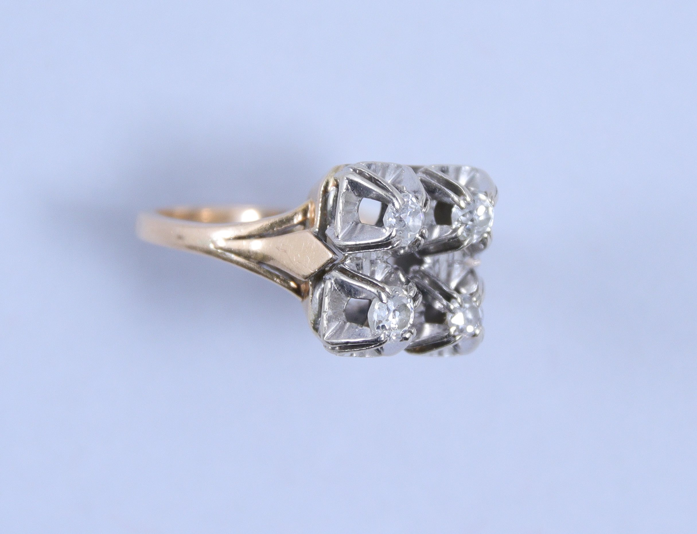 en or jaune 750 millièmes et or gris ou platine, dont le plateau de forme carrée est orné de quatre diamants d'environ 0,05 carat chacun.