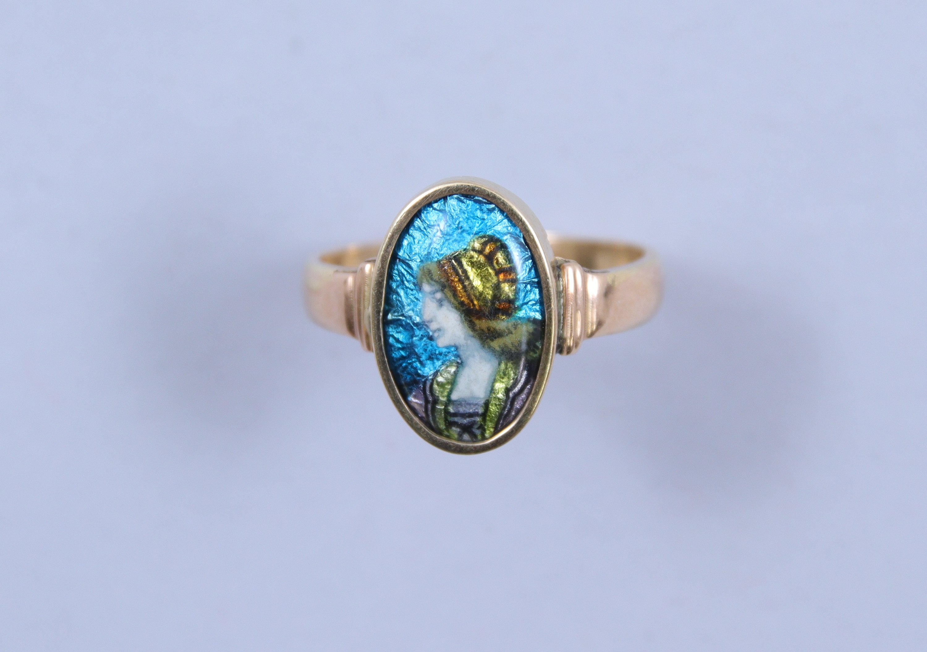 - Une bague ornée d'un portrait de femme émaillé sur fond turquoise signé "Issanchou à Limoges. TDD 58. Poids brut : 4 gr.