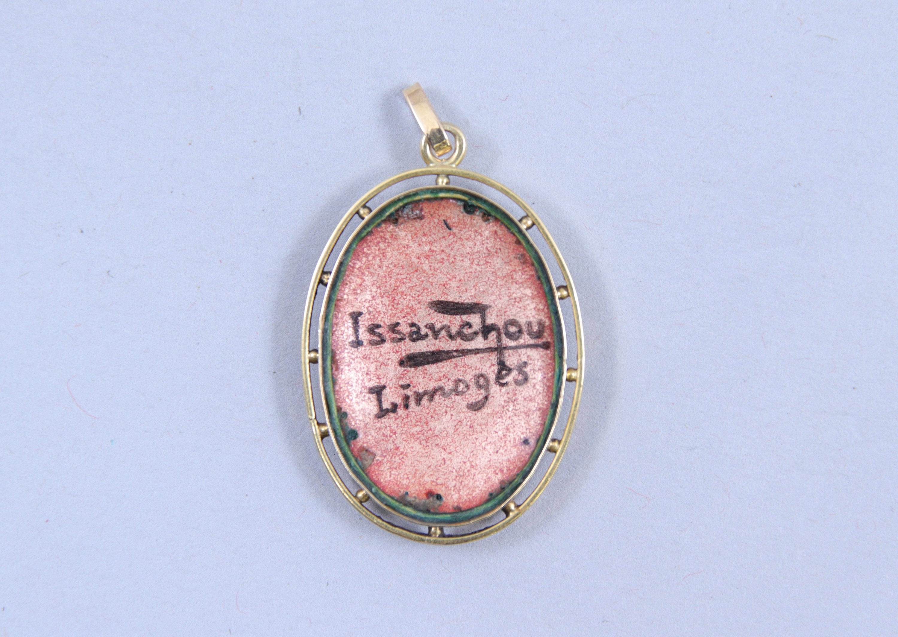 - Un médaillon avec portrait de femme émaillé sur fond rouge signé "Issanchou à Limoges". Poids brut : 3,7 gr.