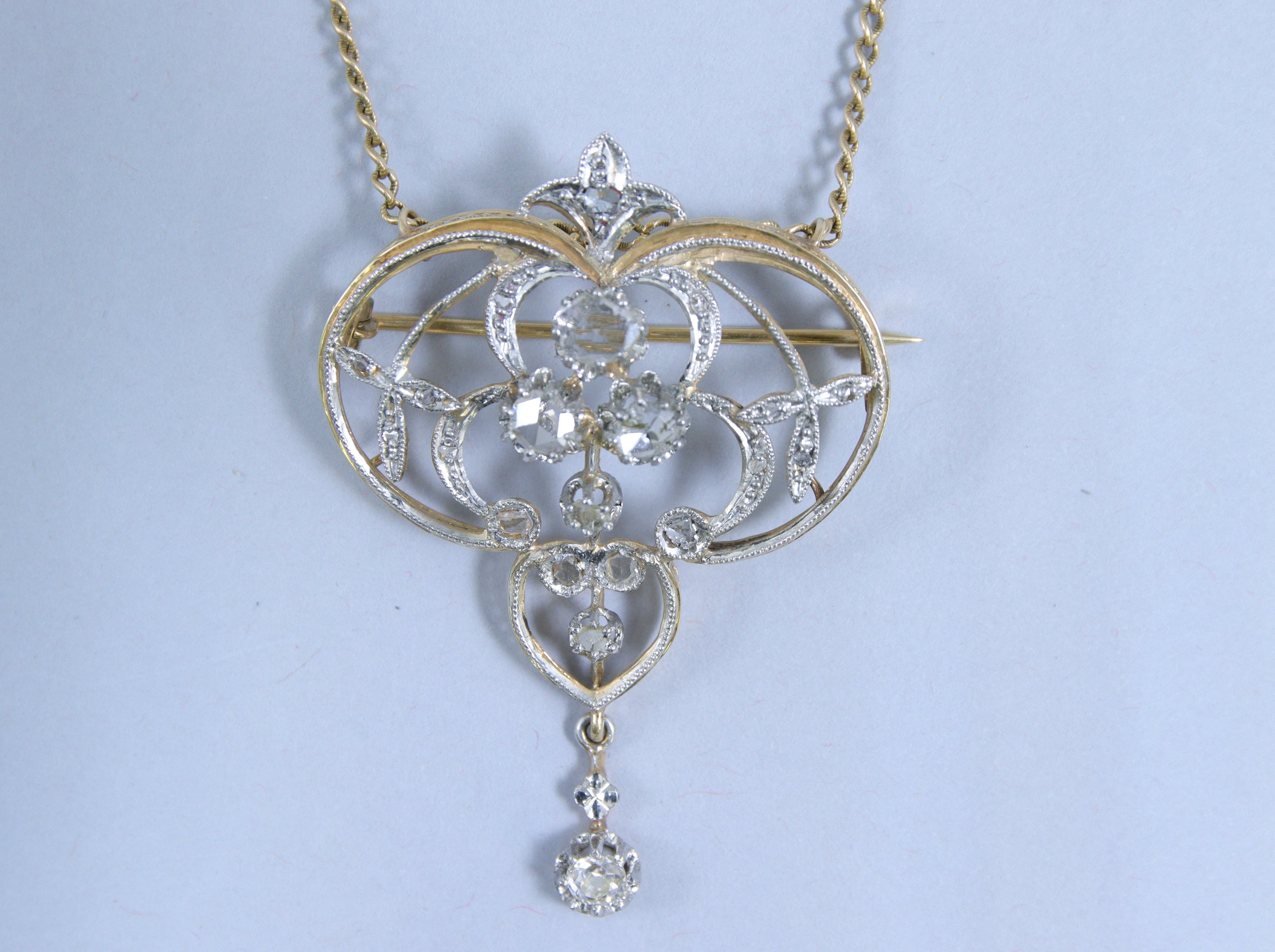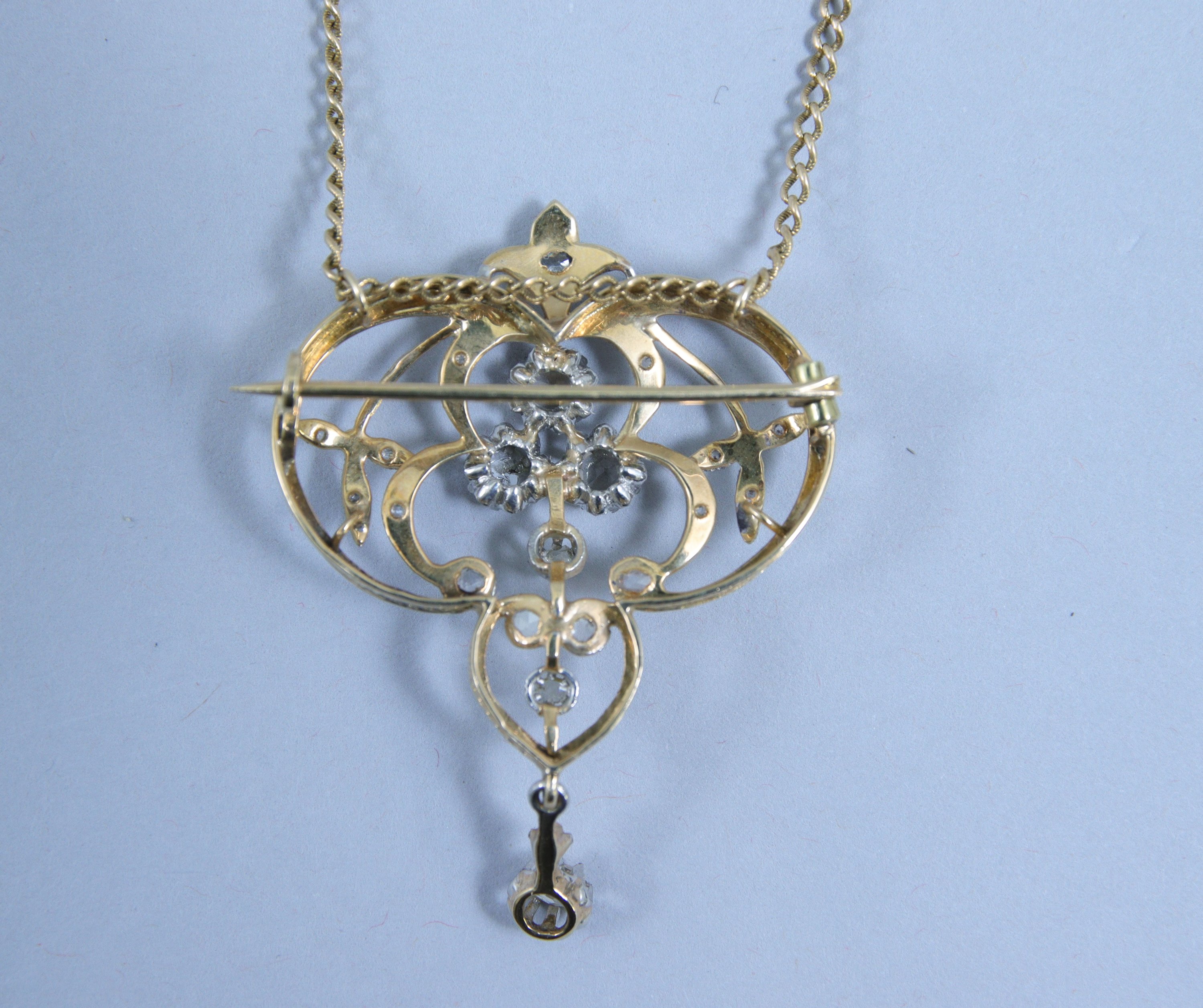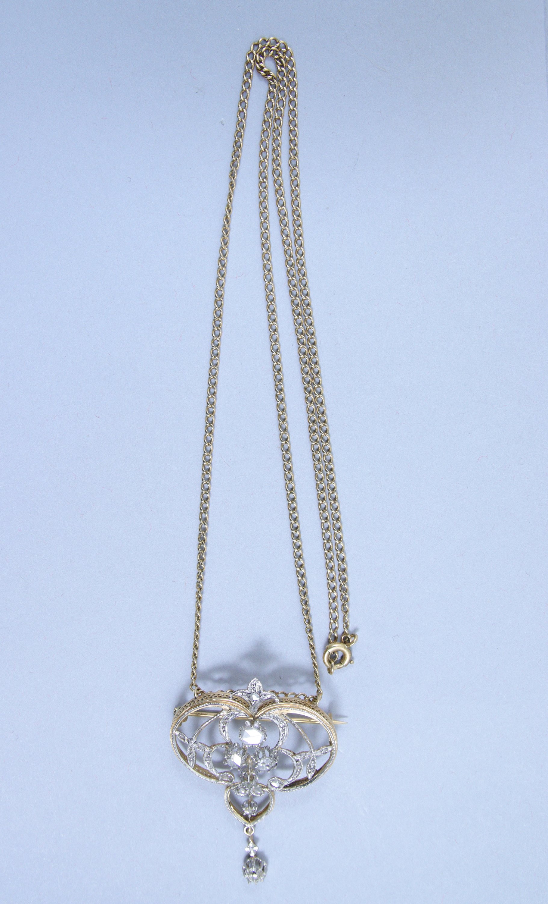 en or jaune 750 millièmes ornée de diamants (le plus important changé par une pierre blanche), formant pendentif avec une chaine en or jaune 750 millièmes.