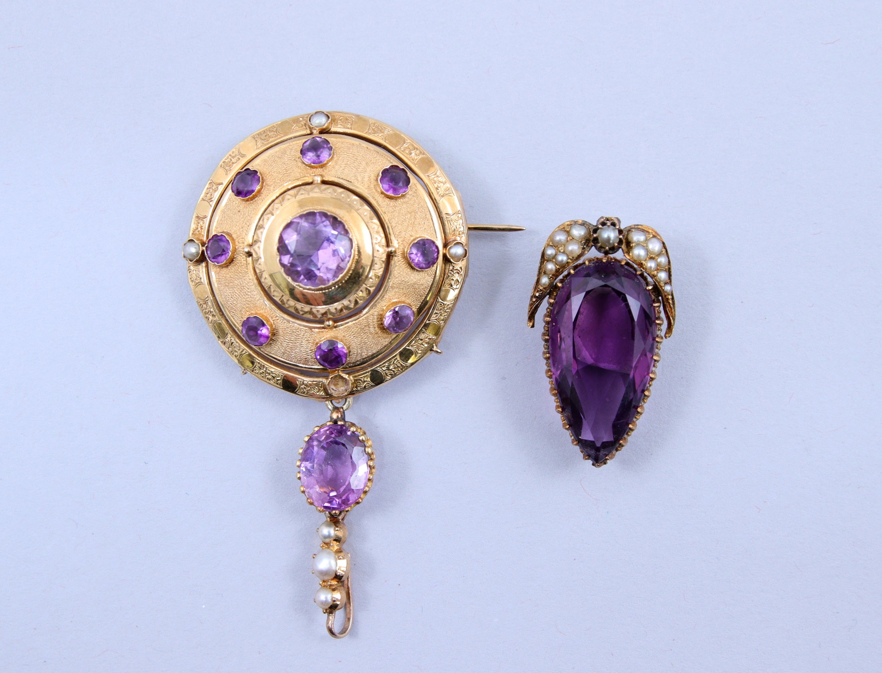 en or jaune 750 millièmes, ornée d'améthystes et de semences de perles.