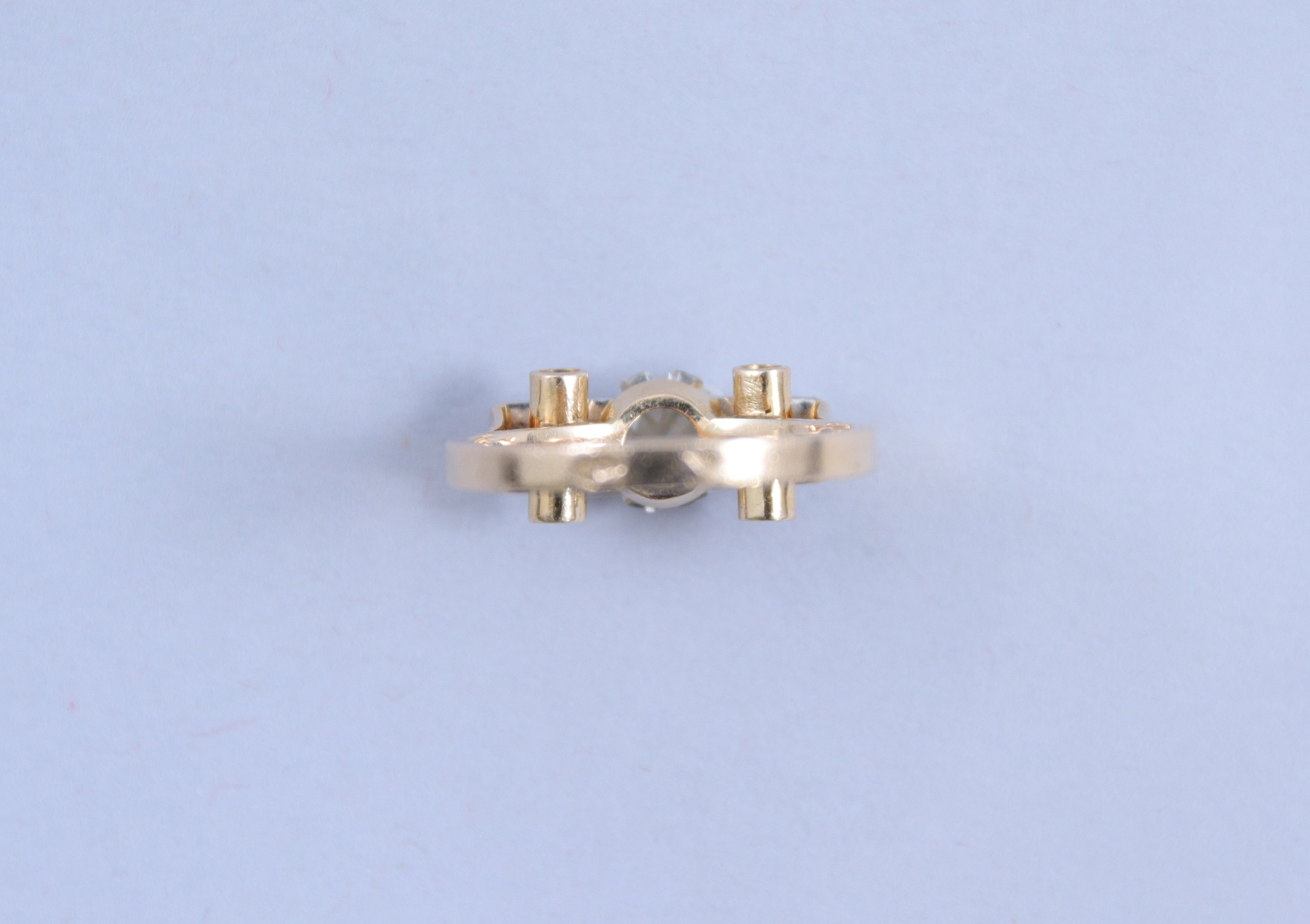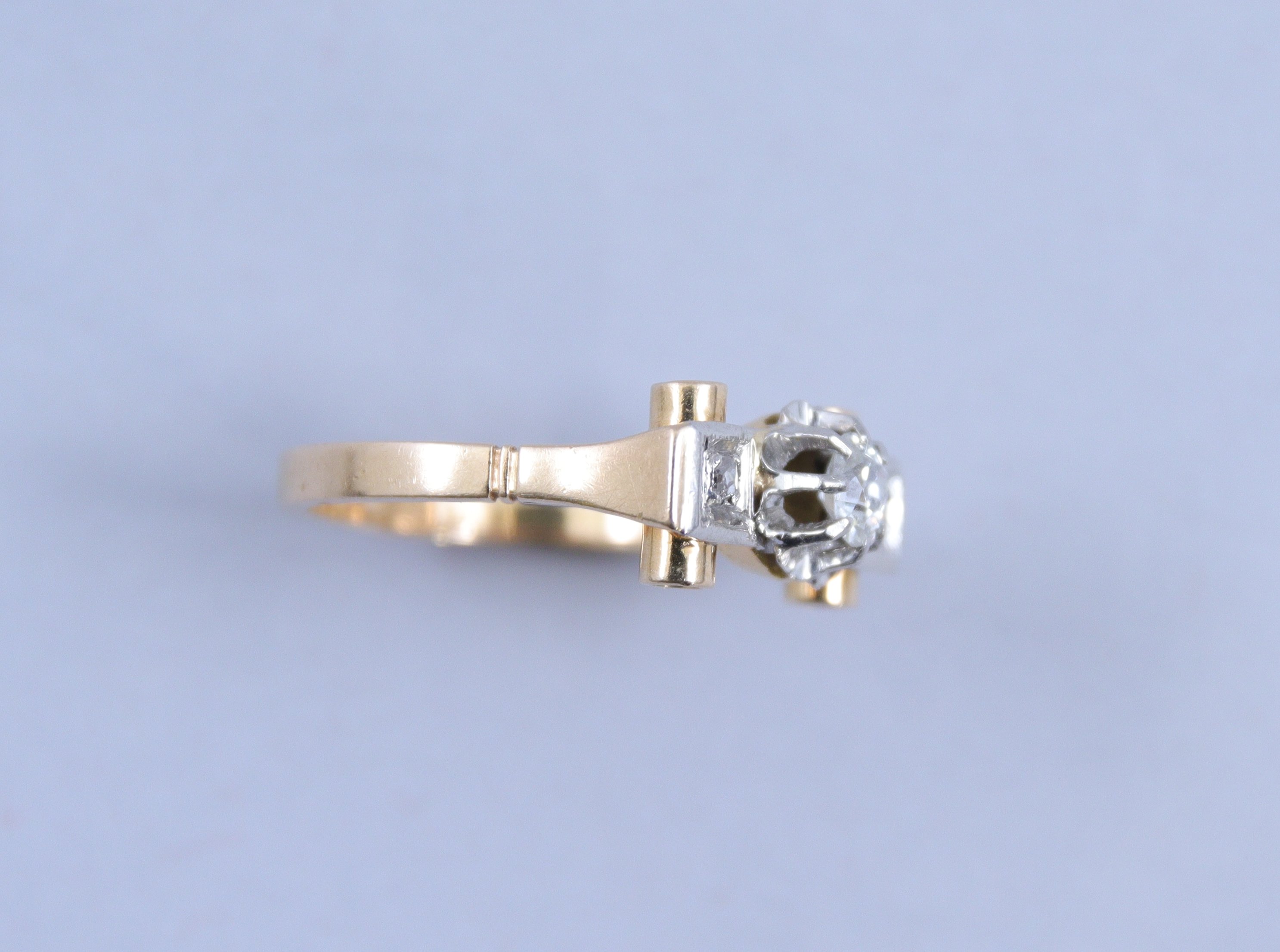en or jaune 750 millièmes ornée de trois diamants montés en ligne, le diamant central sur des griffes.