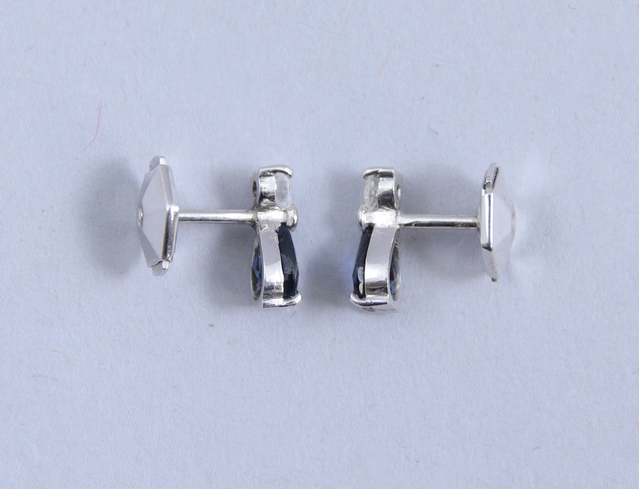 en or gris 750 millièmes, ornées d'un diamant retenant un saphir taillé en poire.