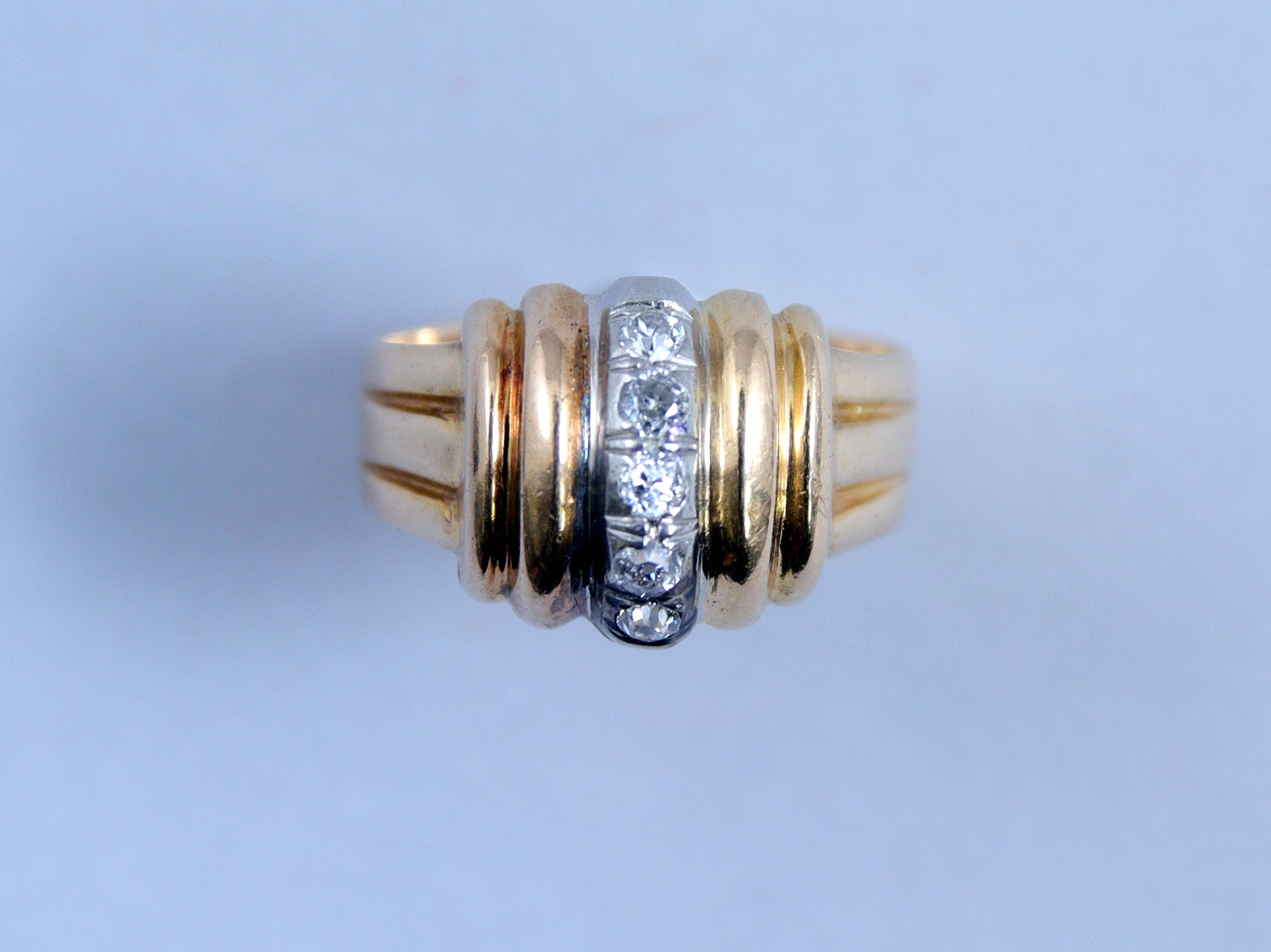 en or jaune 750 millièmes et platine 850 millièmes, ornée de quatre petits diamants et d'une pierre blanche en ligne dans un motif godronné.