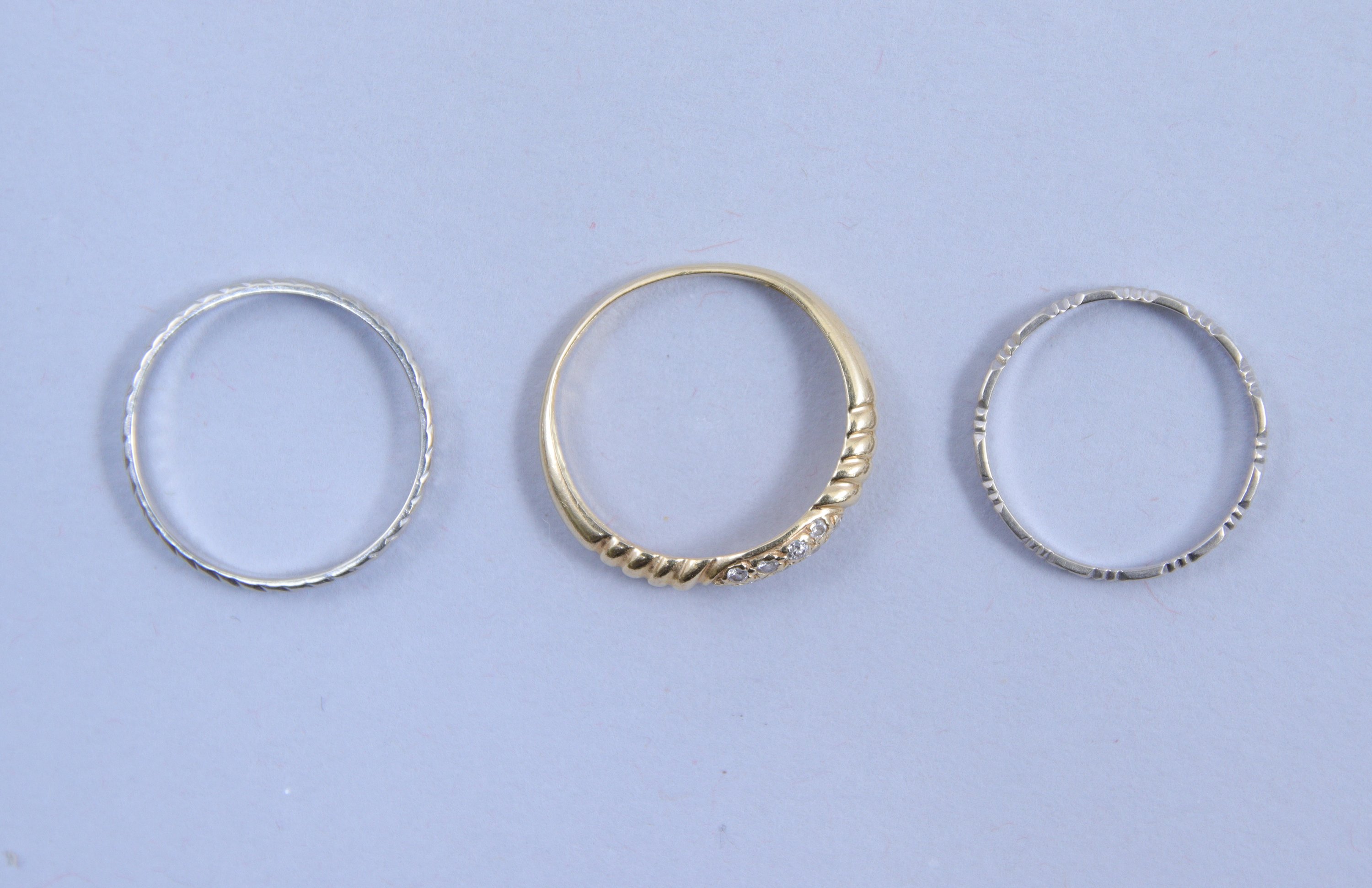 Joint : Trois alliances en platine ou or 750 millièmes, dont une ornée de petits brillants. TDD 53 et 49. Poids brut : 4,6 gr.