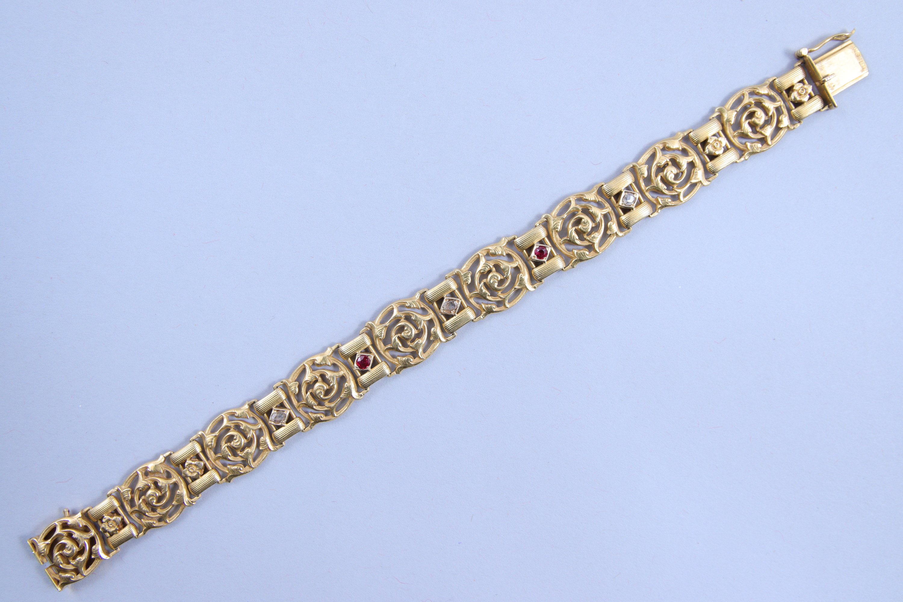 en or jaune, orné de deux rubis et trois diamants bruts, composé de neuf maillons à rinceaux enroulés, délicatement réunis par des mailles rehaussée de fleurettes.