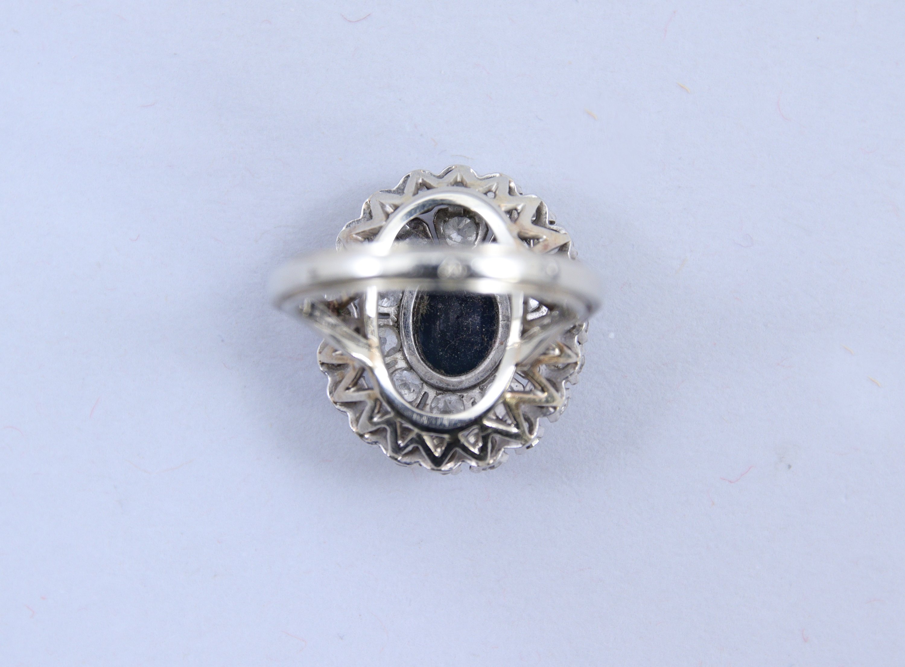 en or gris 750 millièmes et platine, ornée d'un saphir bleu de taille ovale dans un entourage rayonnant à double couronne de 10 et 20 diamants de taille brillant (poids total : environ 0,8 carat).