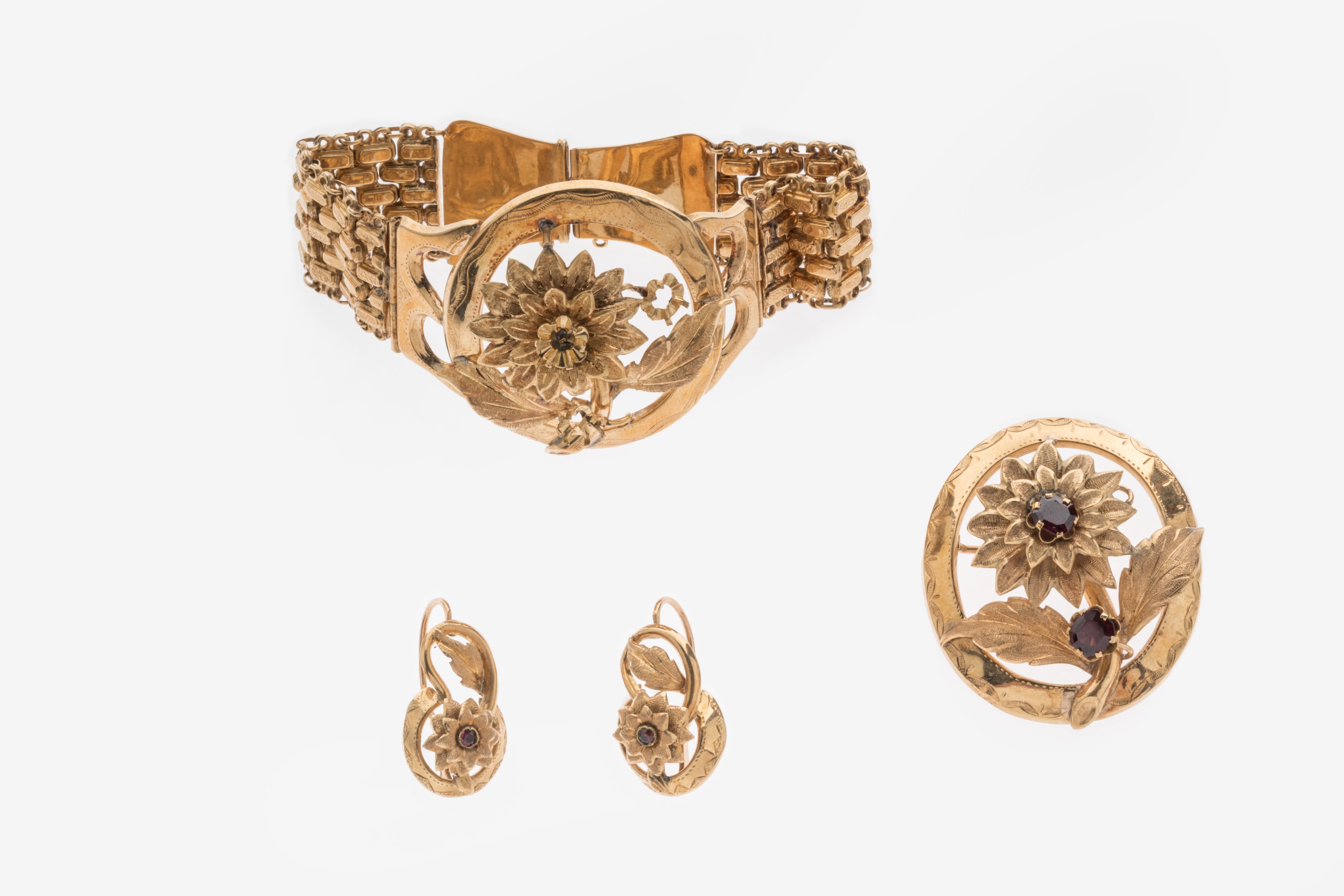 Bracelet, broche circulaire et boucles d'oreille en or jaune 750 millièmes et grenats :