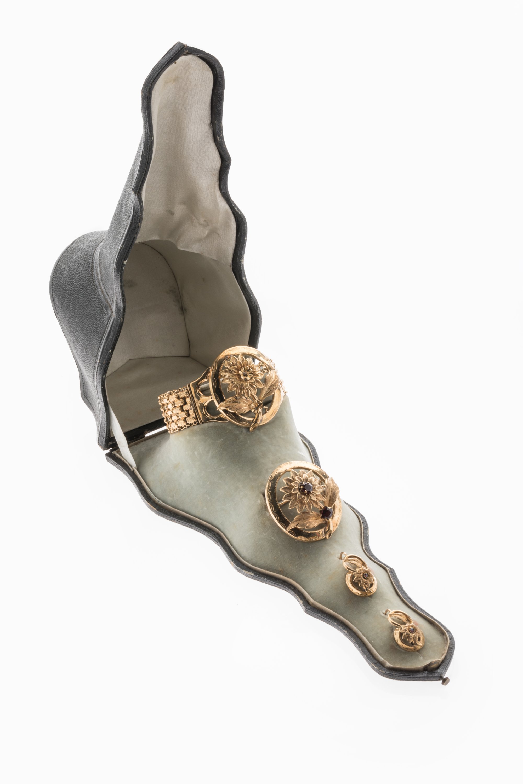 L'ensemble est contenu dans un écrin imitant la forme d'un soulier.