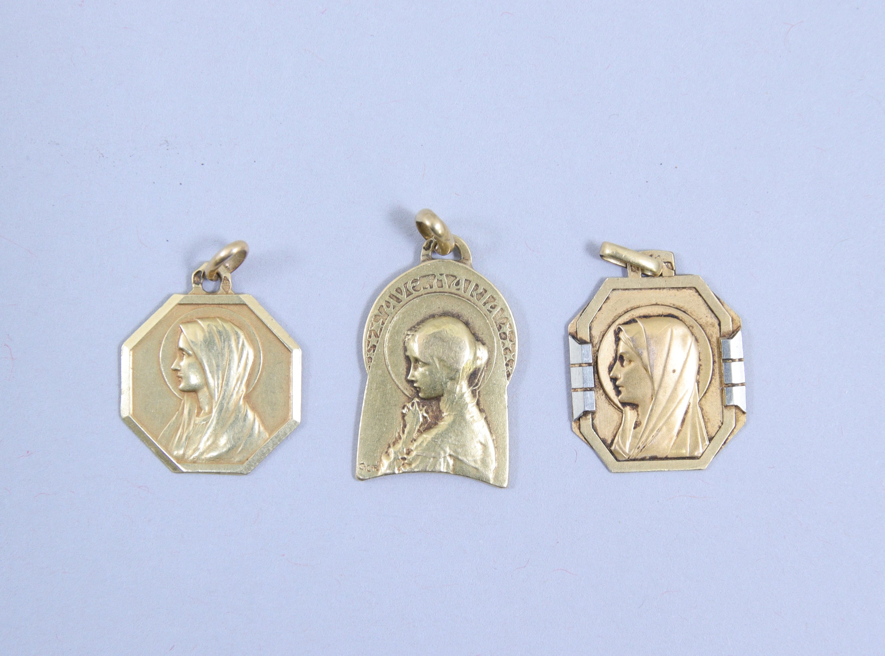 en or jaune 750 millièmes figurant la Vierge Marie. Deux gravées "Christiane" et datées du "15 août 1936" et du "11 juin 1944".