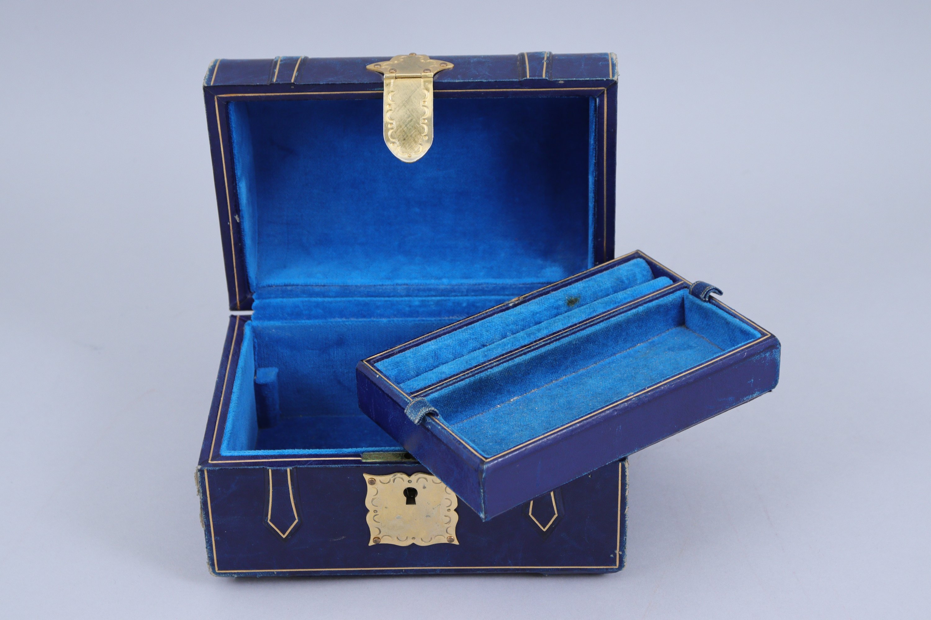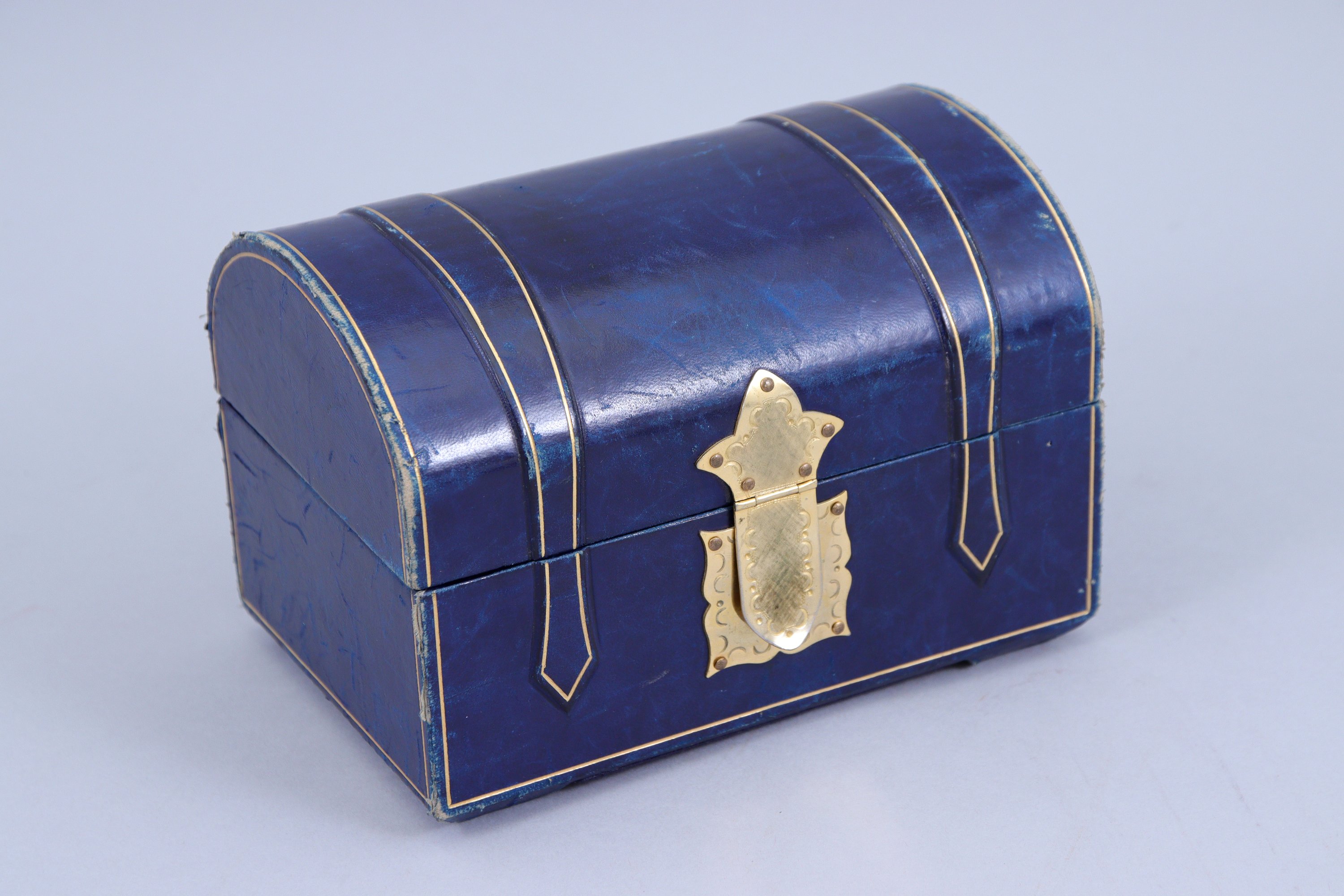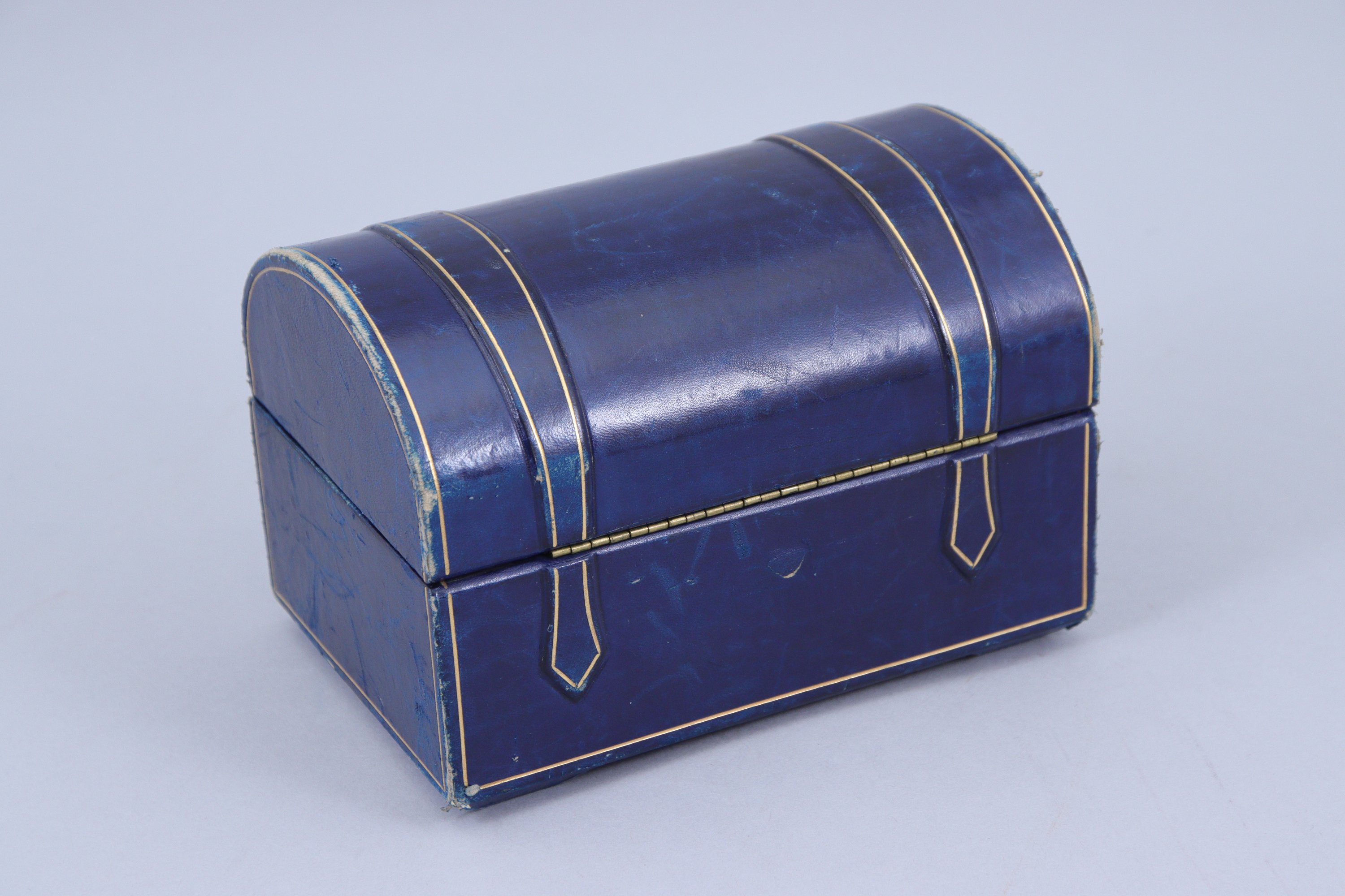 recouvert de cuir bleu marine, en forme de malle bombée sur patins, fermoir et listels dorés. Intérieur gainé en velours bleu roi, à compartiments.