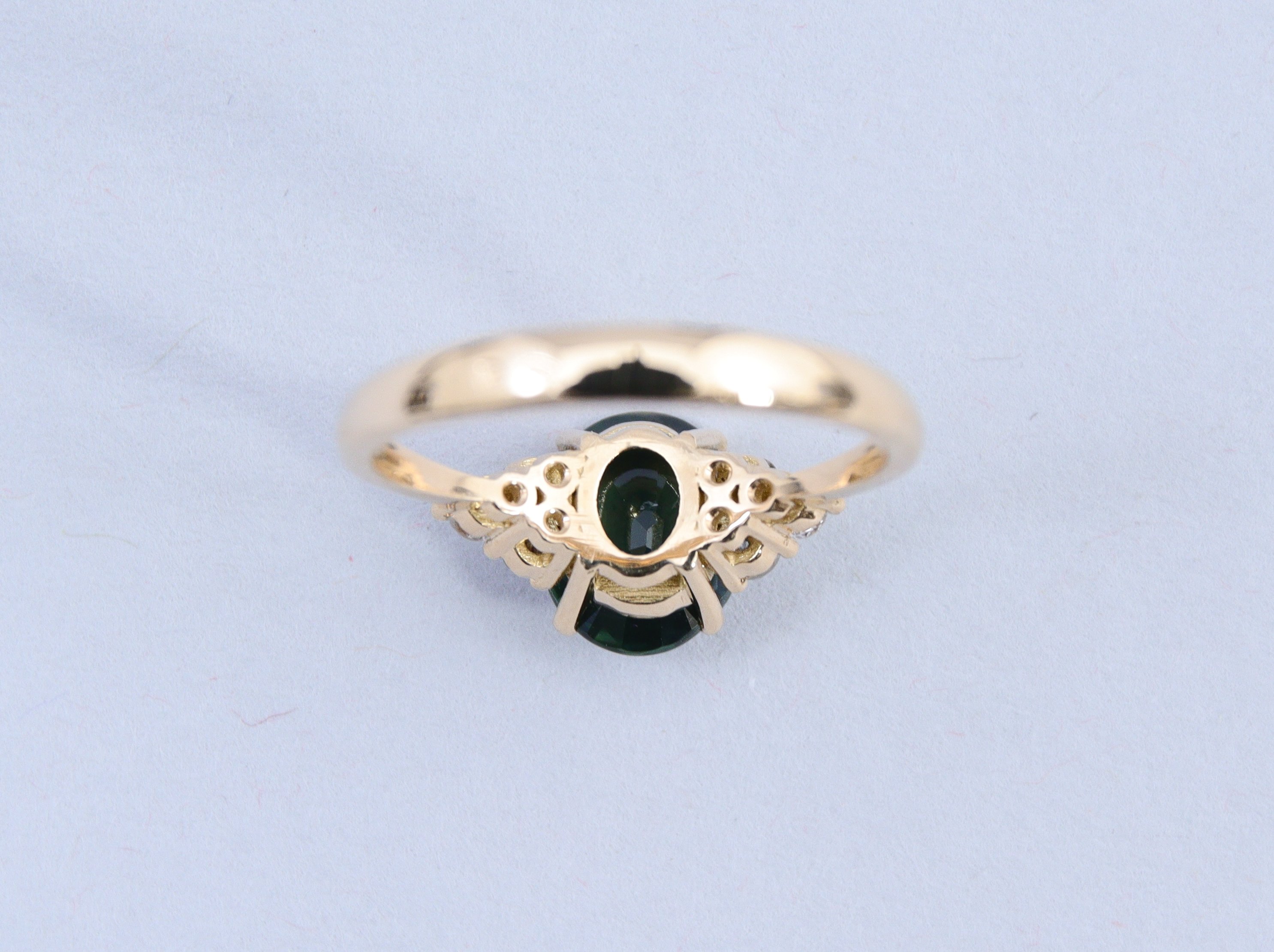 en or jaune 750 millièmes, le chaton serti d'un saphir vert épaulé de six brillants.