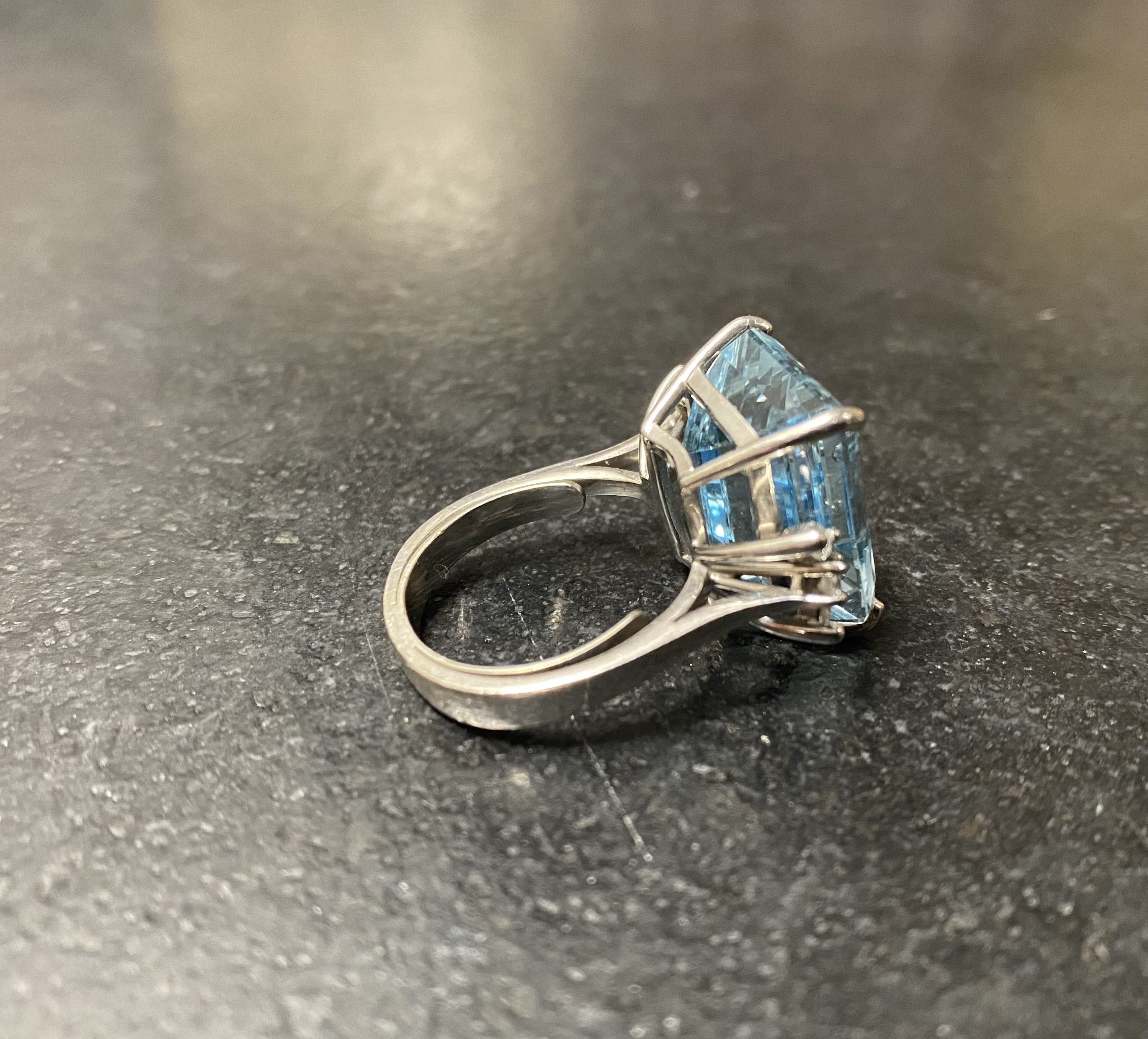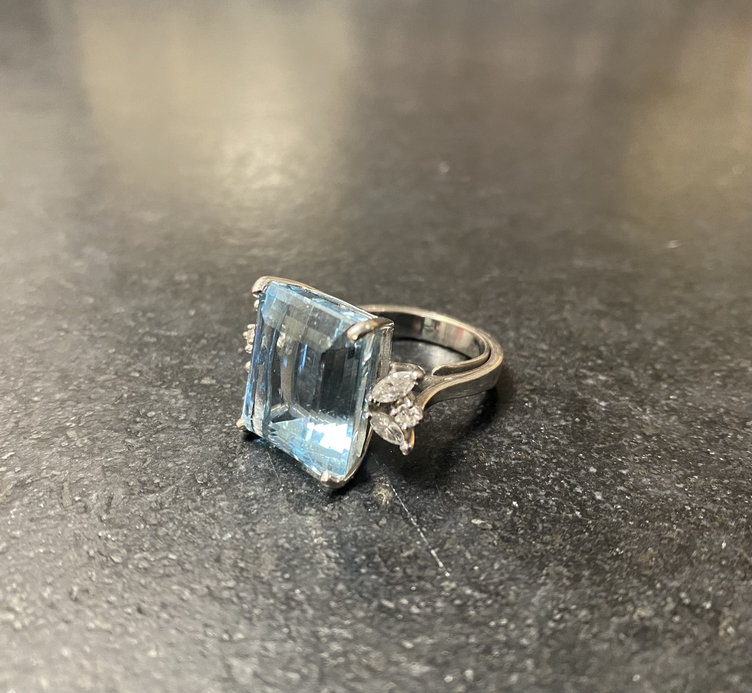 en or blanc 750 millièmes ou platine (à charge de contrôle) ornée d'une importante aigue-marine à pans coupés (environ 16 ct) dans un entourage de quatre petits diamants en navette et deux brillants.