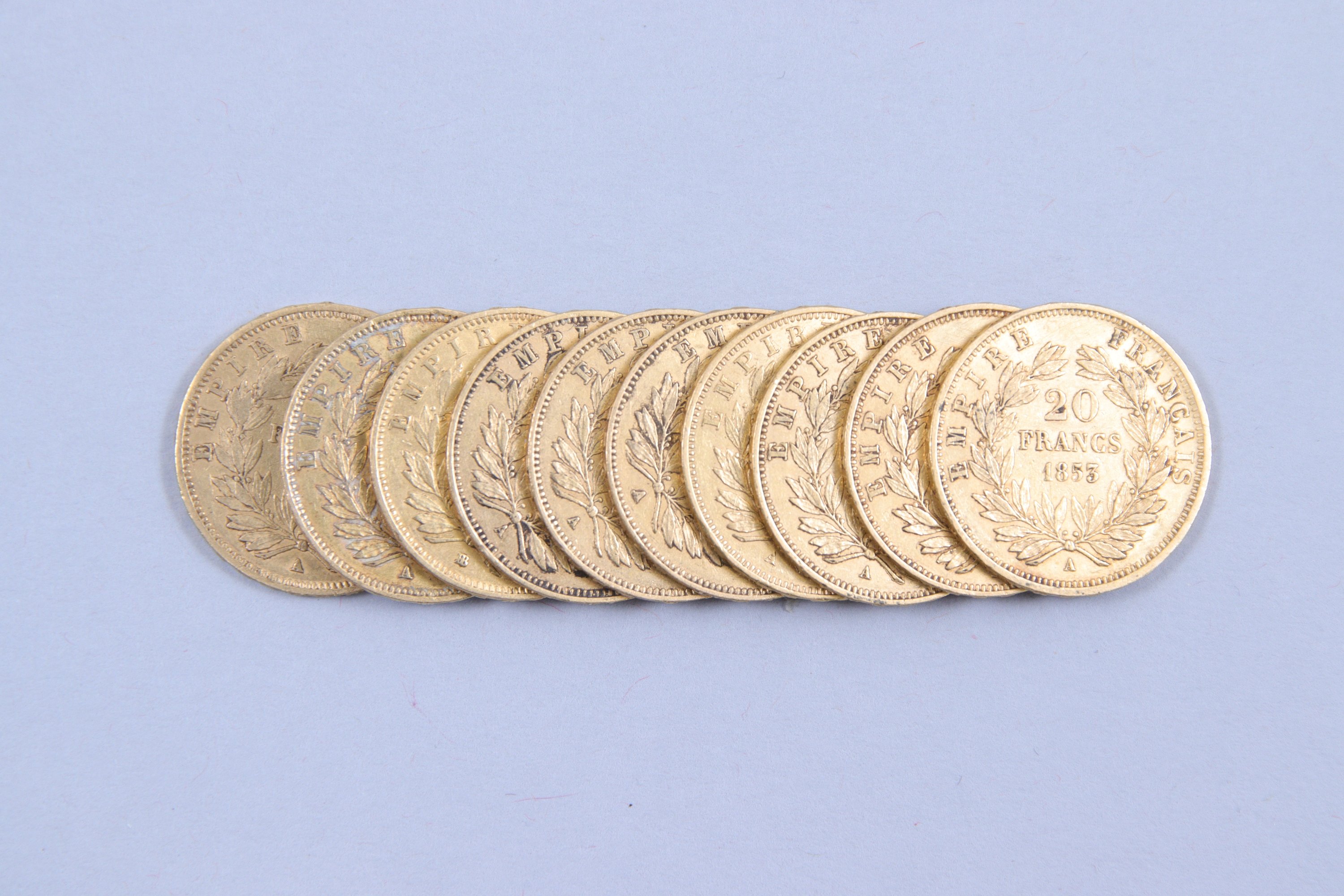 FRANCE. 10 PIÈCES de 20 FRANCS OR, Napoléon III tête nue, 1853, 1854 (4), 1856 (2), 1857, 1859 (2).