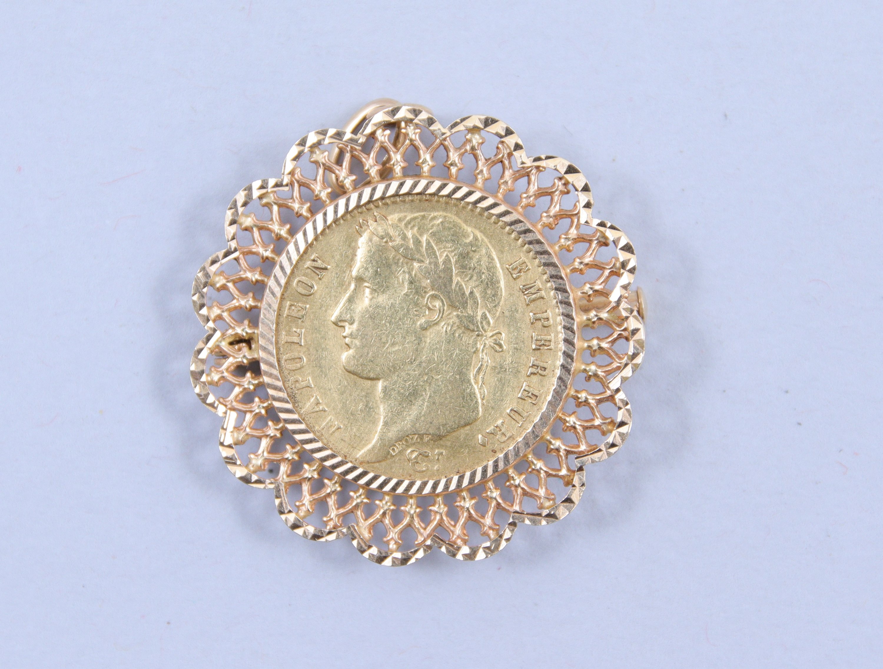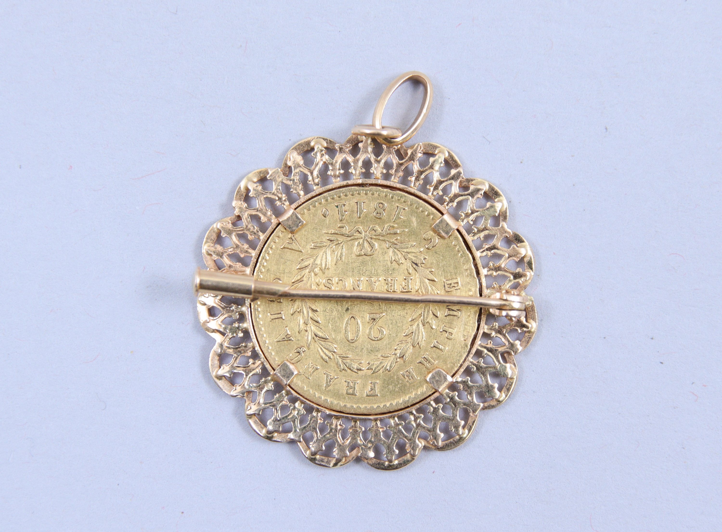 FRANCE.1 PIÈCE de 20 FRANCS OR, Napoléon, 1811. Montée dans un pendentif circulaire en or jaune 750 millièmes, à décor ajouré (transformable en broche).