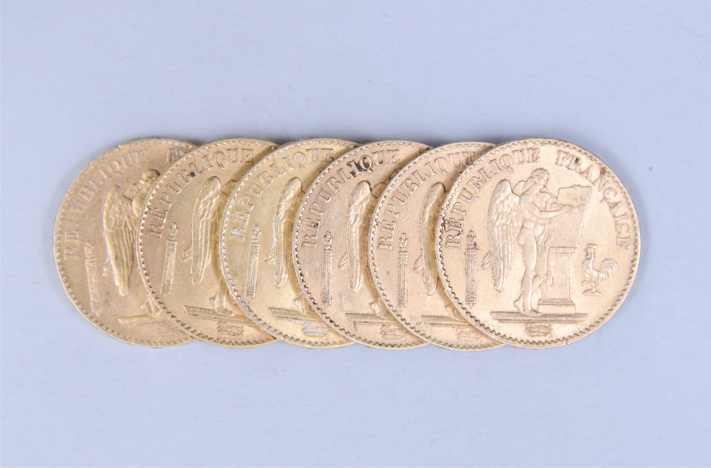 FRANCE. 6 PIÈCES de 20 FRANCS OR, Génie, 1877 (2), 1887, 1896, 1897 et 1898.