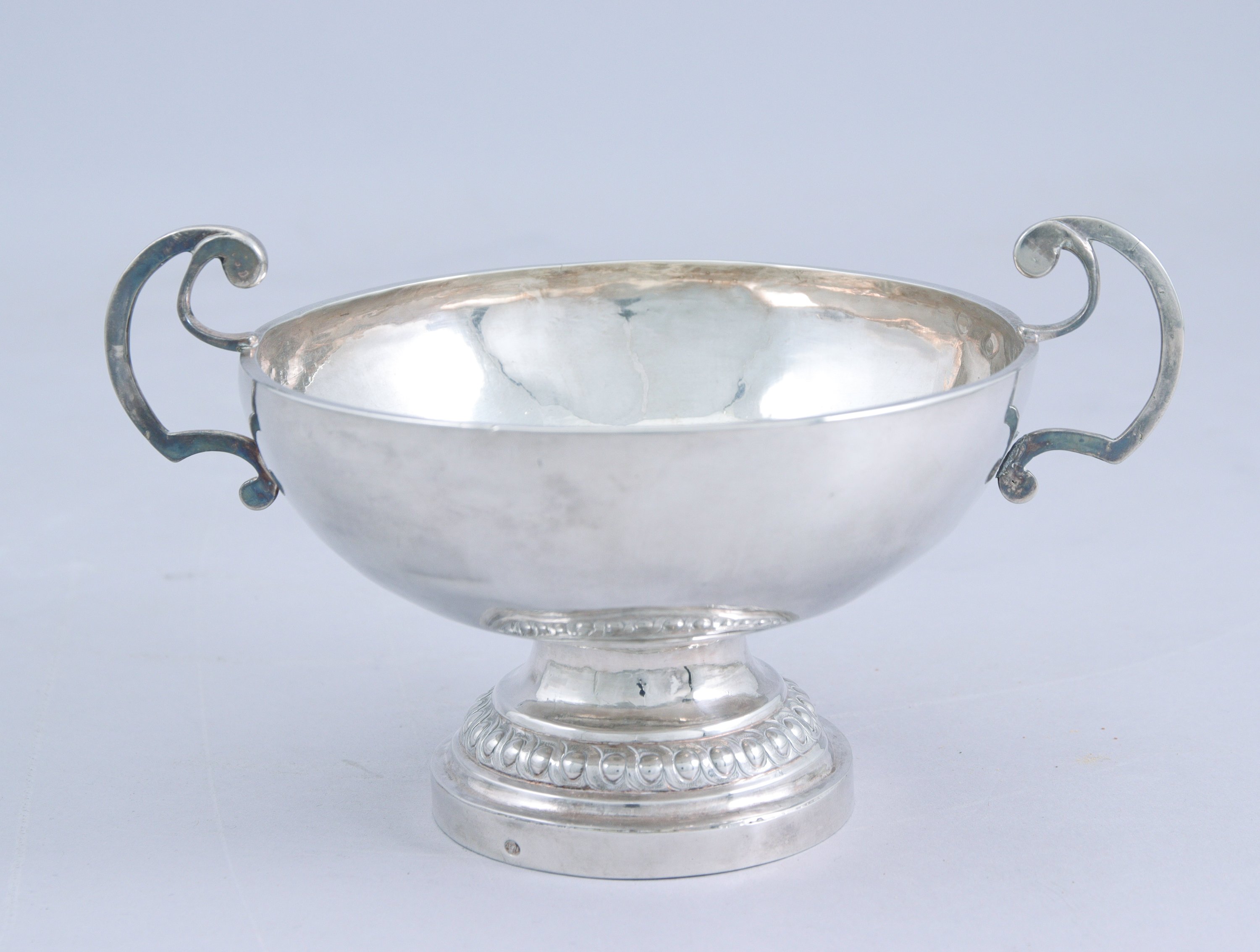 en argent à deux anses reposant sur un piédouche à décor de frise de piastres. La lèvre gravée "A. GUENOT"