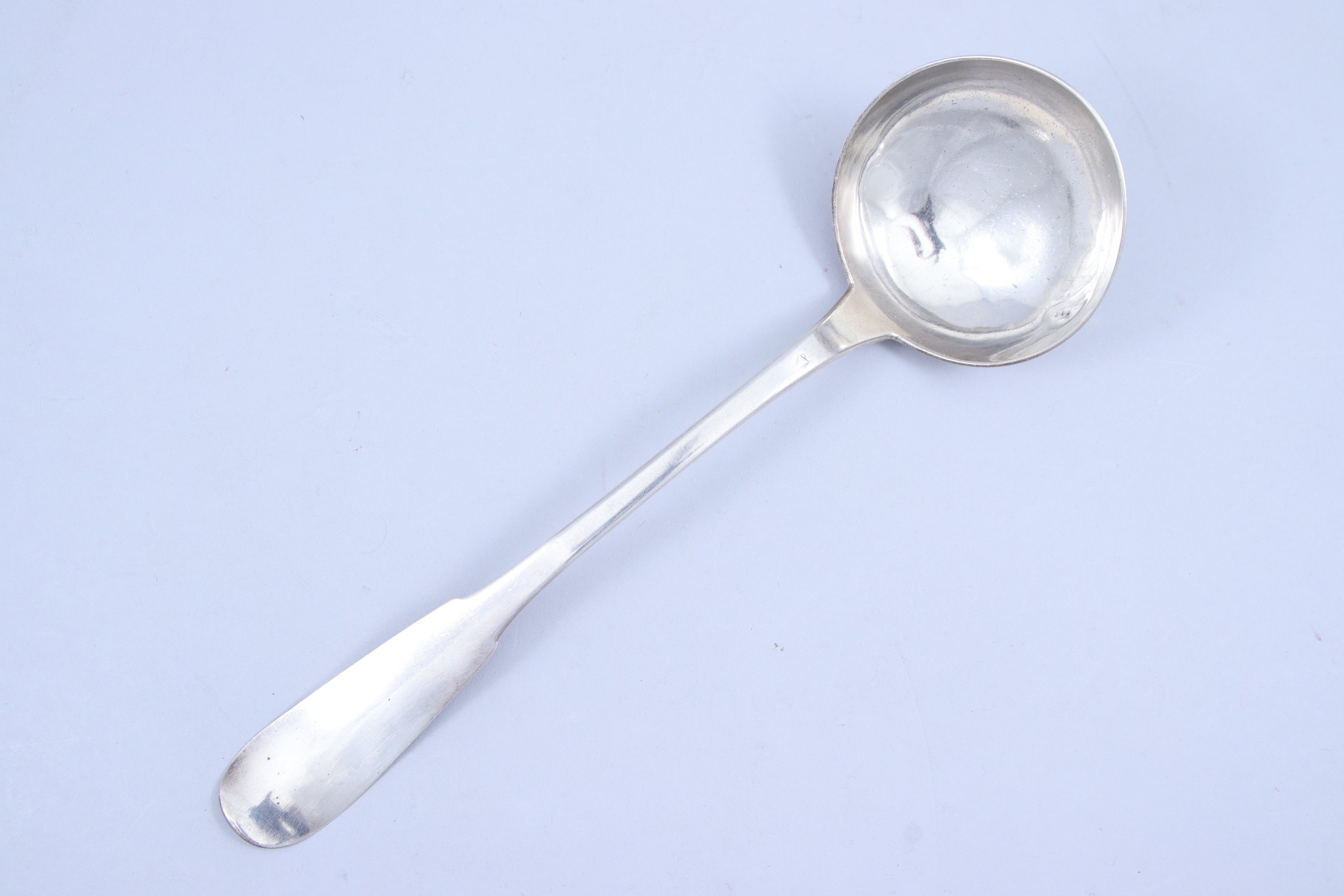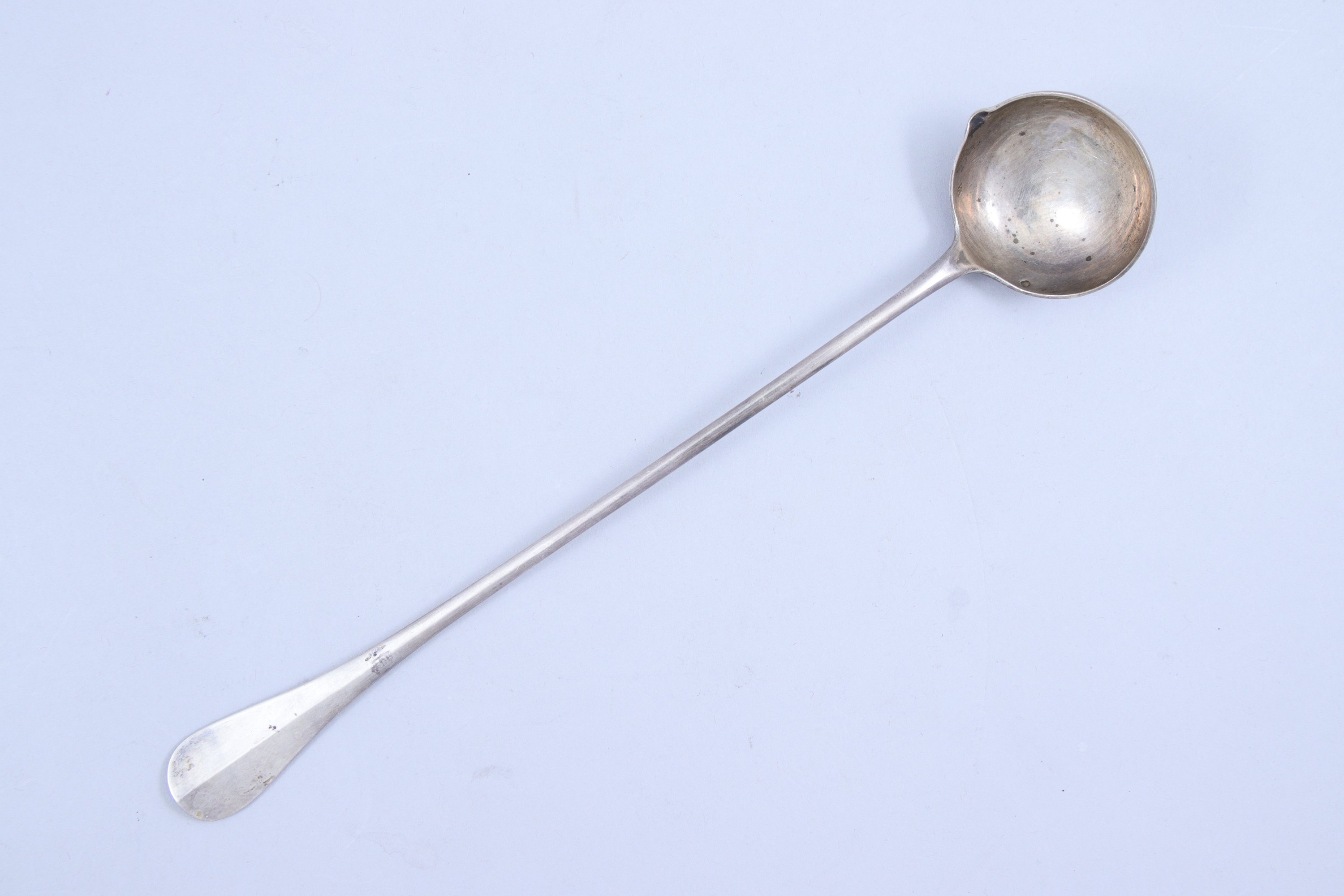 Joint : Louche à punch en argent, modèle uniplat, monogrammée « CI ». Minerve 1er titre. Orfèvre Eugène Queillé ou son fils Elvire Queillé. Long. 27,5 cm. Poids : 92 gr. Poids total : 212 gr.